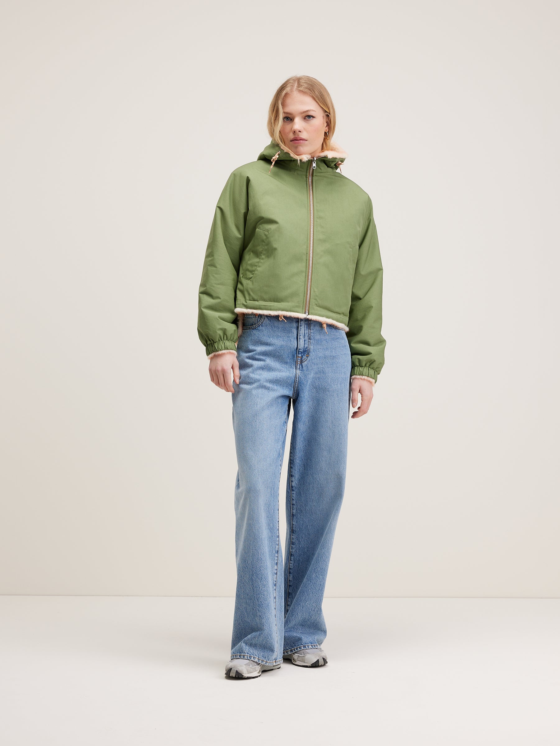 Reversible and oversized hooded jacket with one side in khaki and the other with light pink fake-fur.