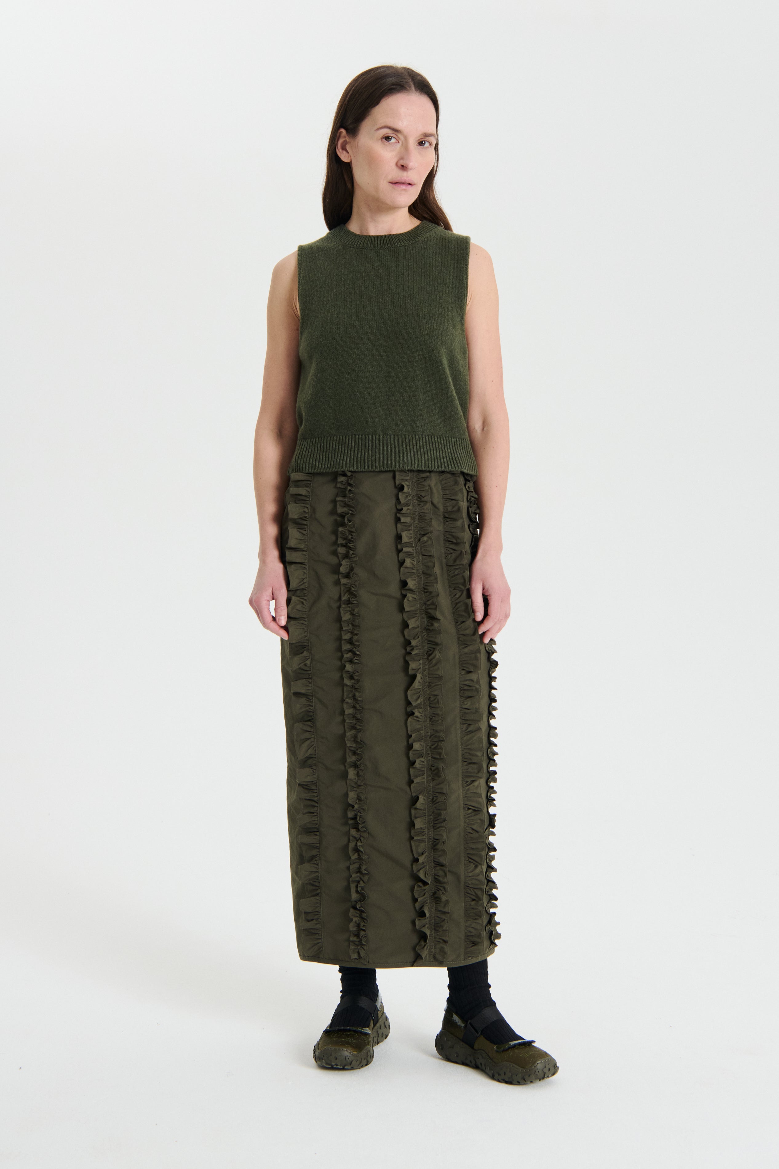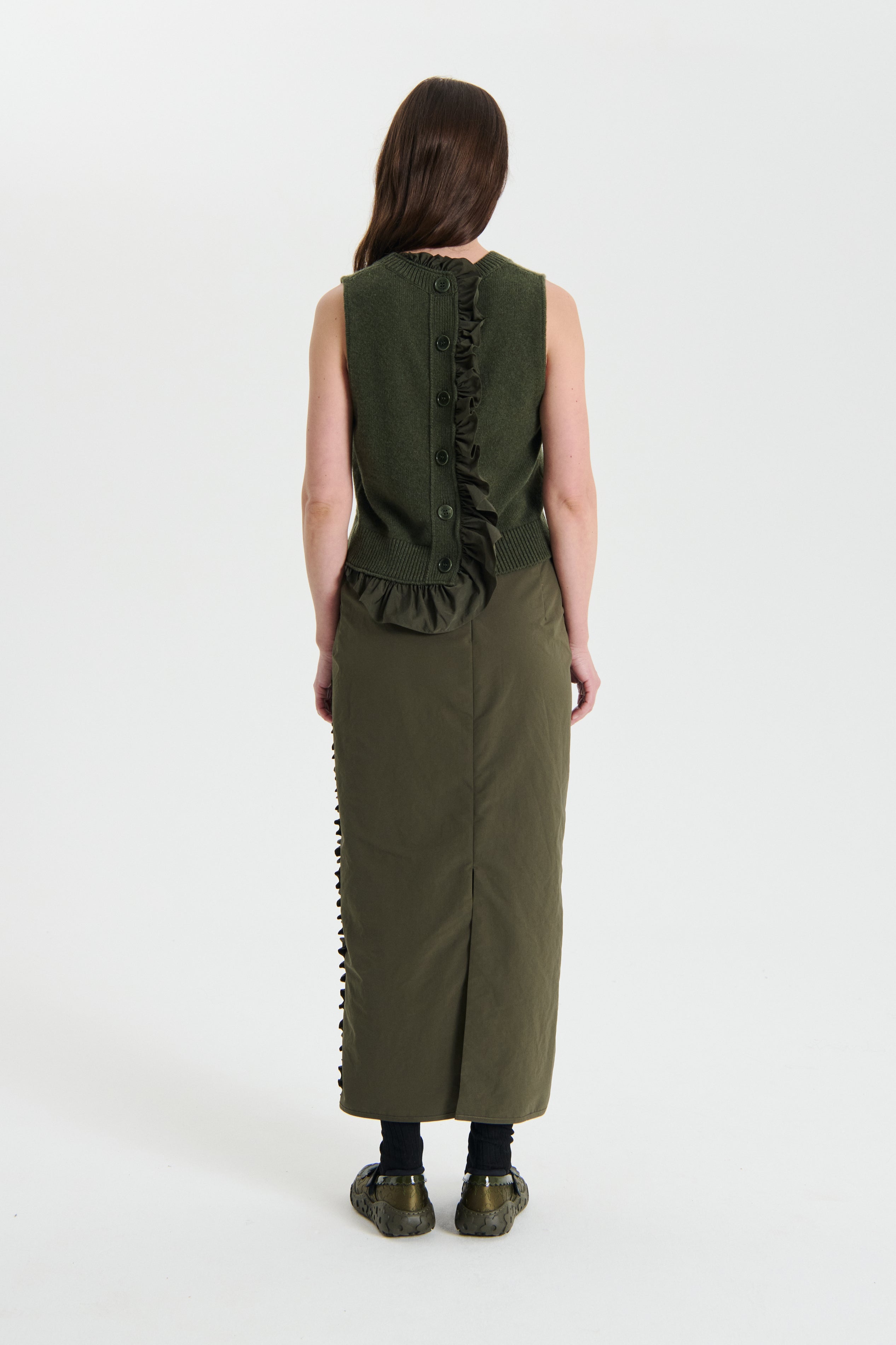 The knitted sweater is a sleeveless, olive – green vest with a textured, ribbed pattern. It features a button – down back with a ruffled trim, adding a touch of detail. The sweater pairs well with the olive – green skirt and black shoes, creating a cohesive and stylish outfit.