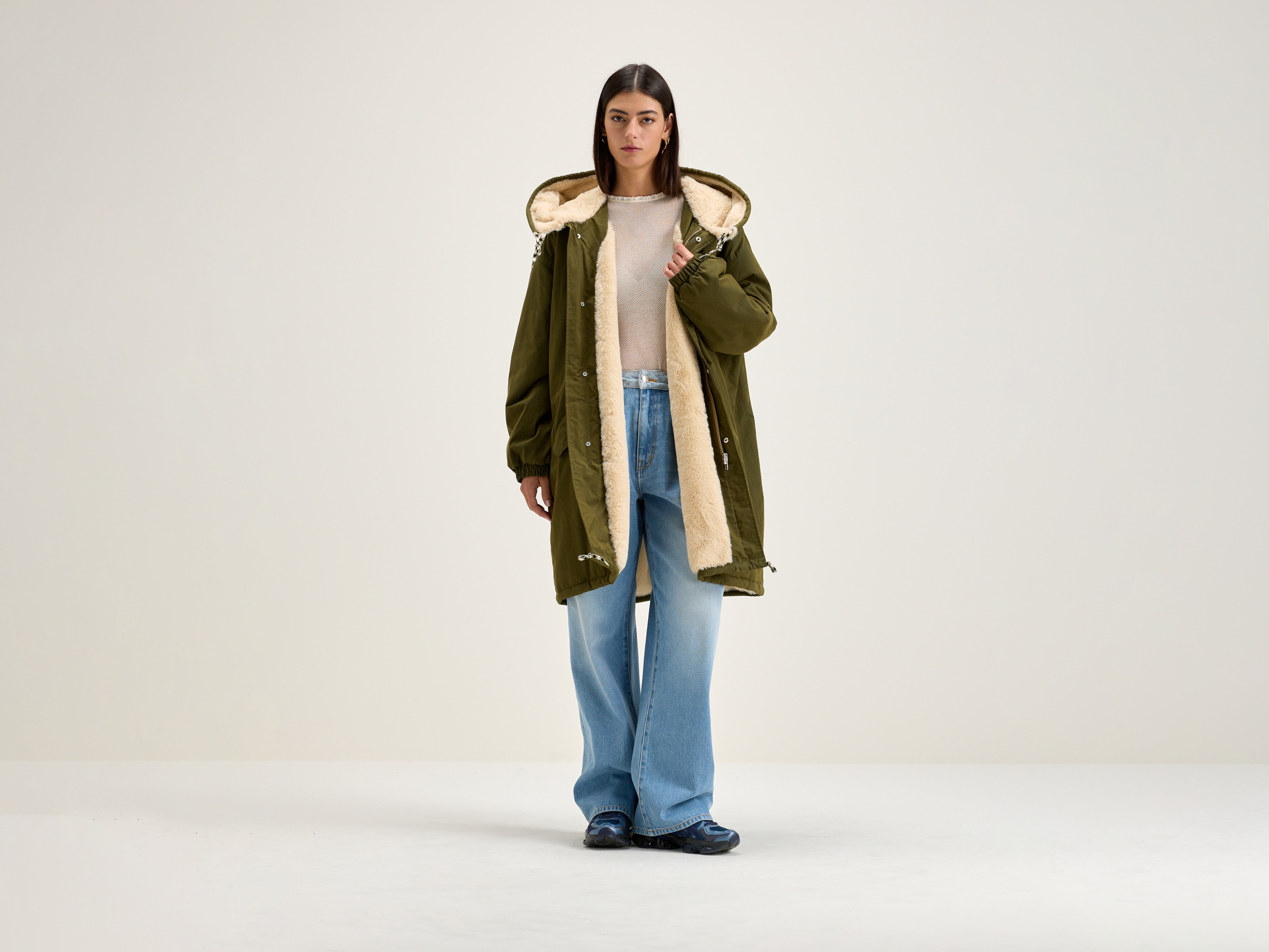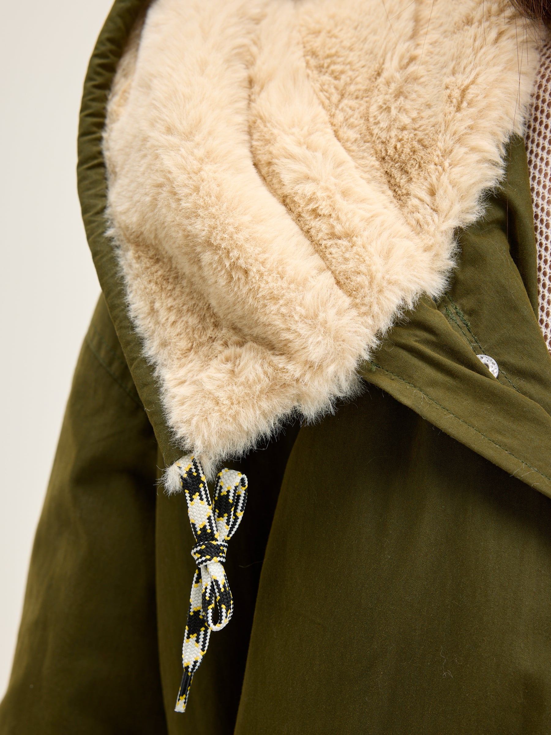 Oversized parka in eucalyptus green canvas with fake fur lining.