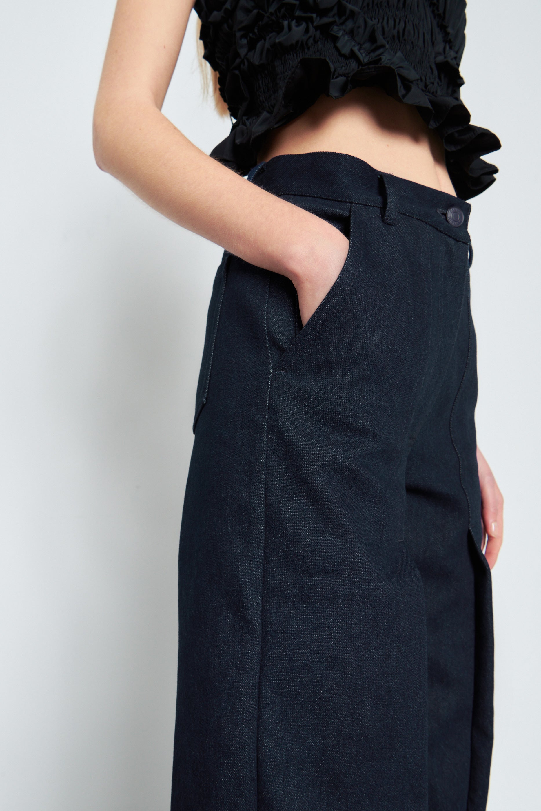 The bottoms are wide – leg, dark – navy pants. They feature a high – waisted design with visible seaming details, adding structure to the soft fabric. The pants have a relaxed, flowing fit and are paired with black shoes, creating a balanced and stylish look.