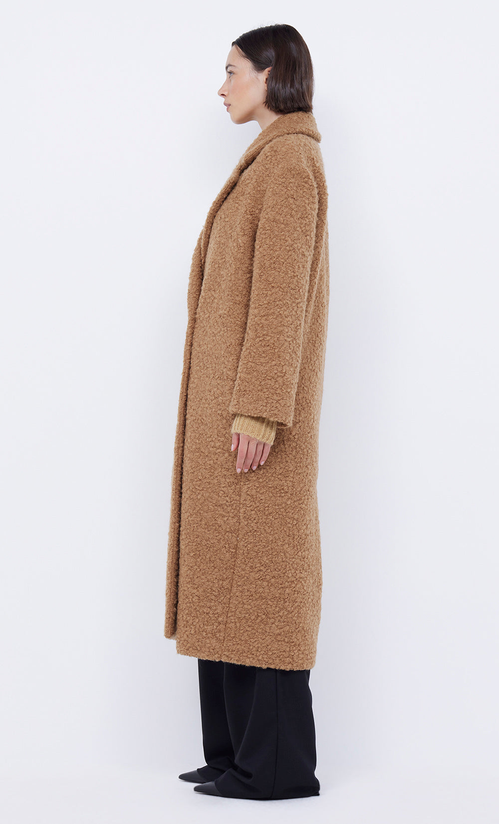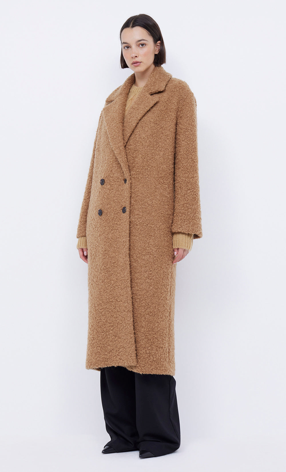 The Annika Coat is is an oversized double breasted style cut from a cozy boucle fabric. This coat includes invisible inseam pockets and is finished with 4 button closures.