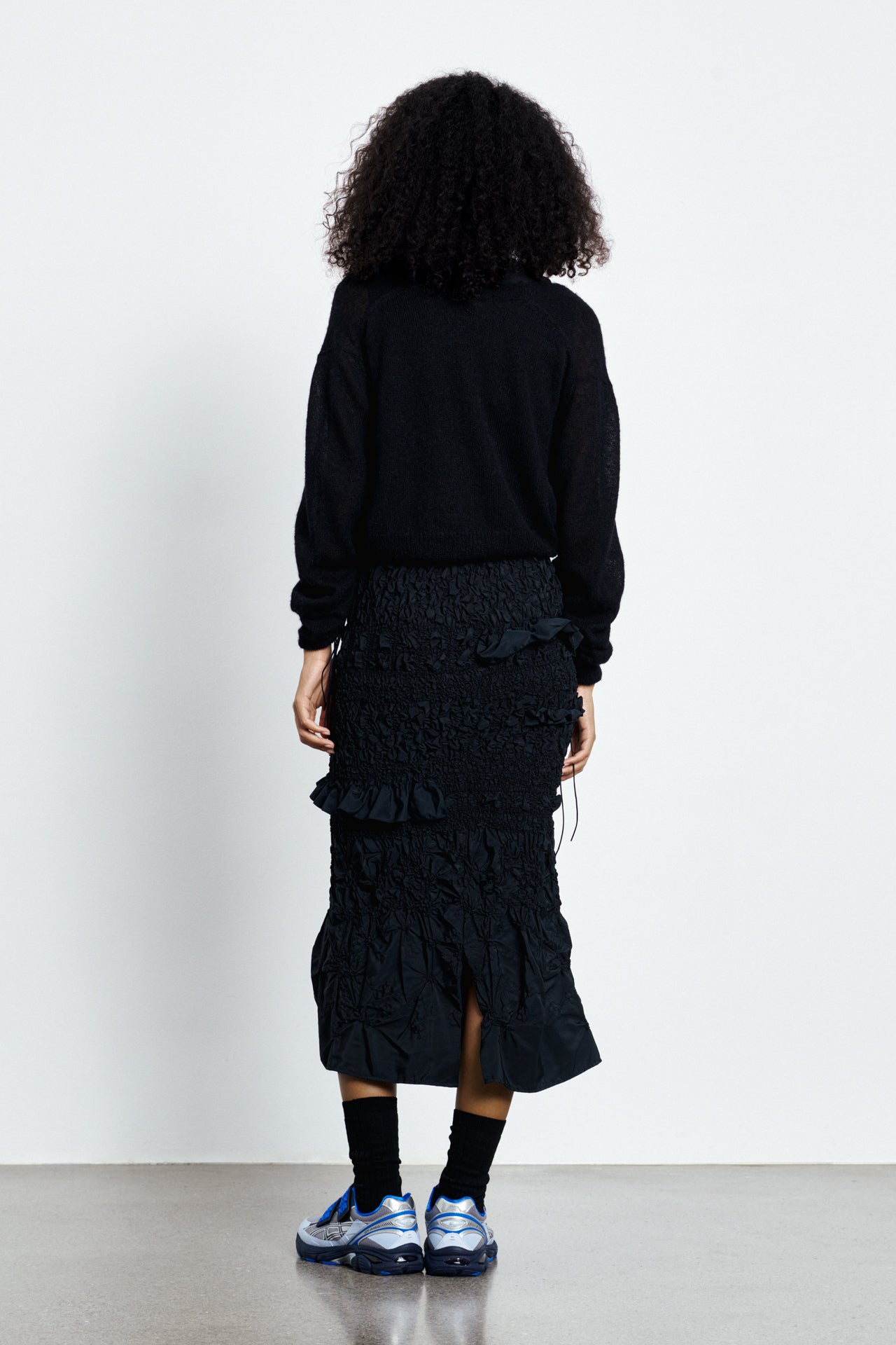 The knitted sweater is black and features a buttoned cardigan design. It has long sleeves and a relaxed fit, making it both stylish and comfortable. The sweater pairs well with the black, intricately patterned skirt and the black shoes, creating a cohesive and elegant look.