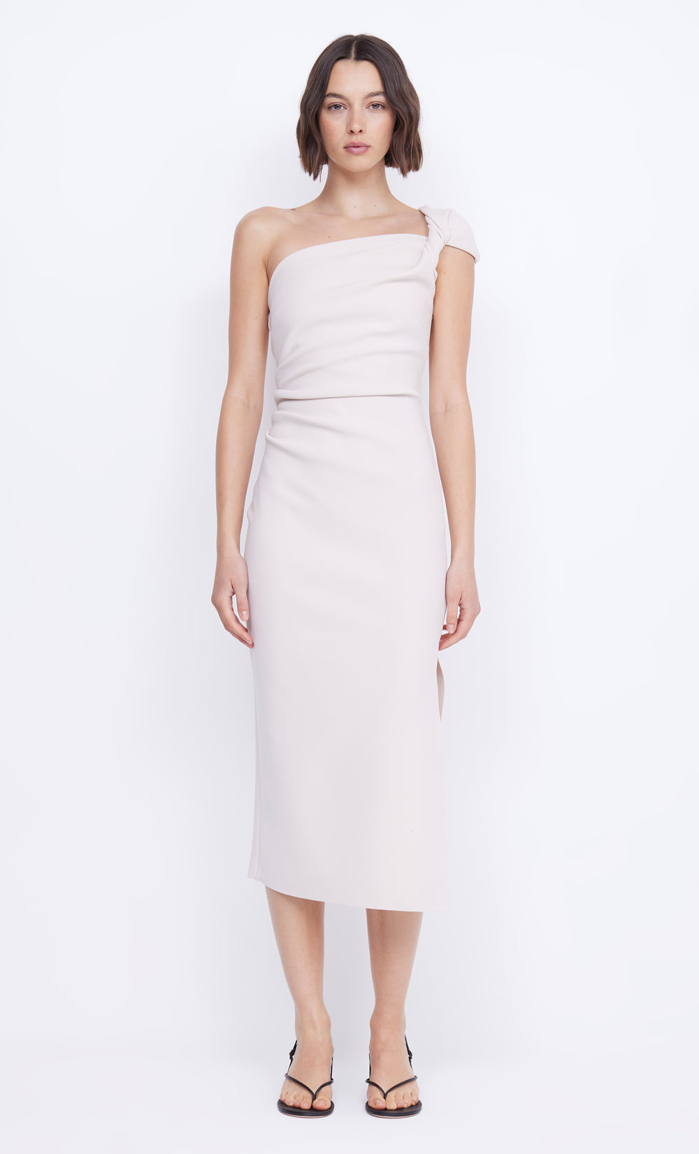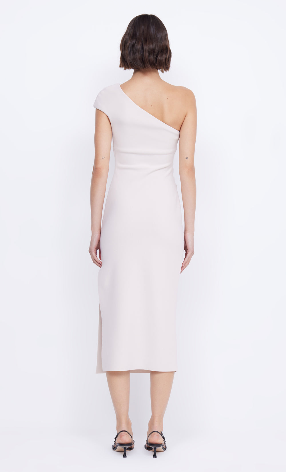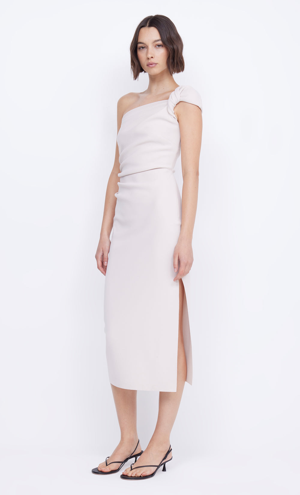 The Anya Midi Dress is a modern take on a best selling favourite. Cut from a stretch bonded crepe, this midi dress features an asymmetrical neckline with one cap sleeve shoulder, twisted front, side-tuck detailing, and a side split to allow for easy movement.