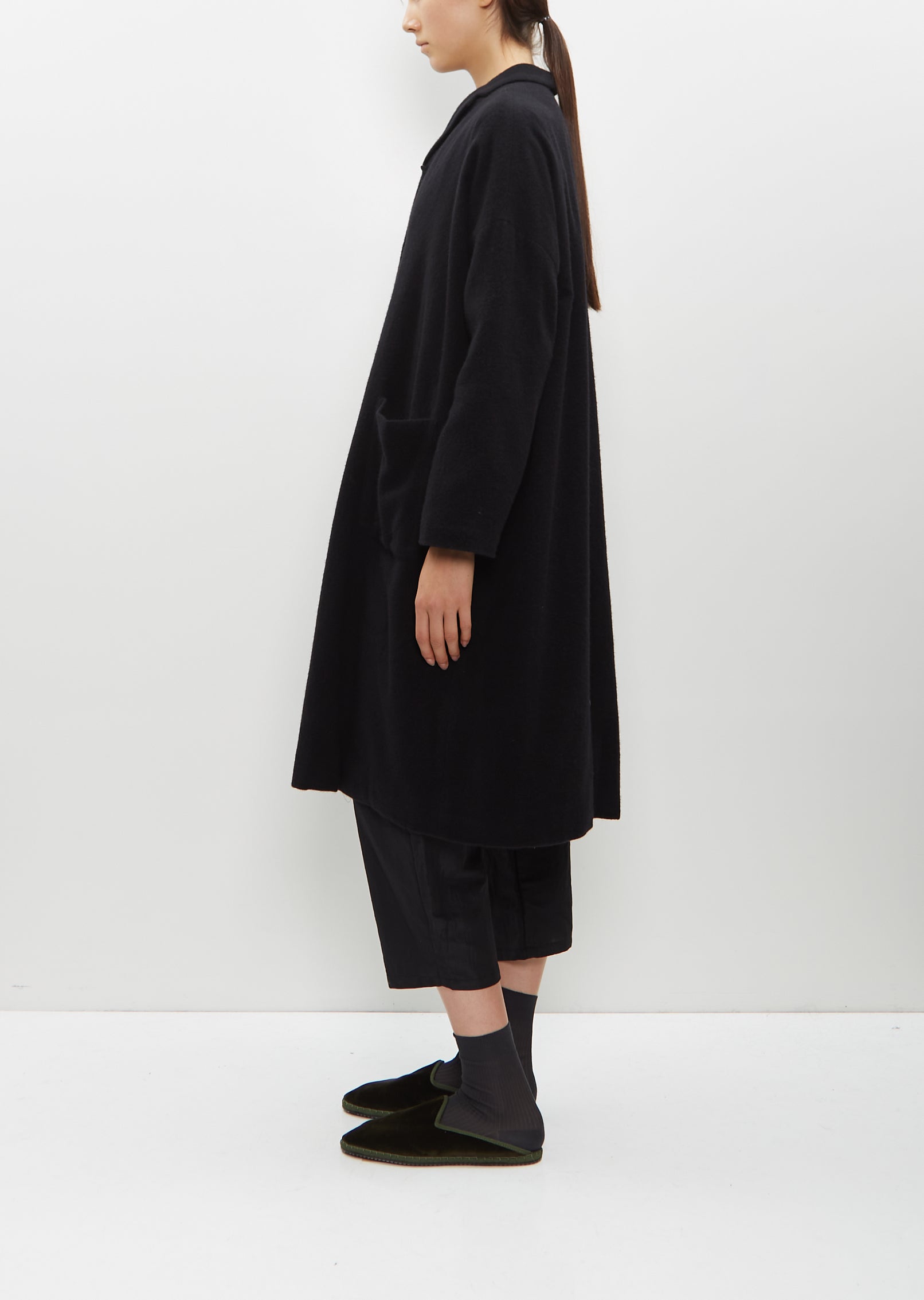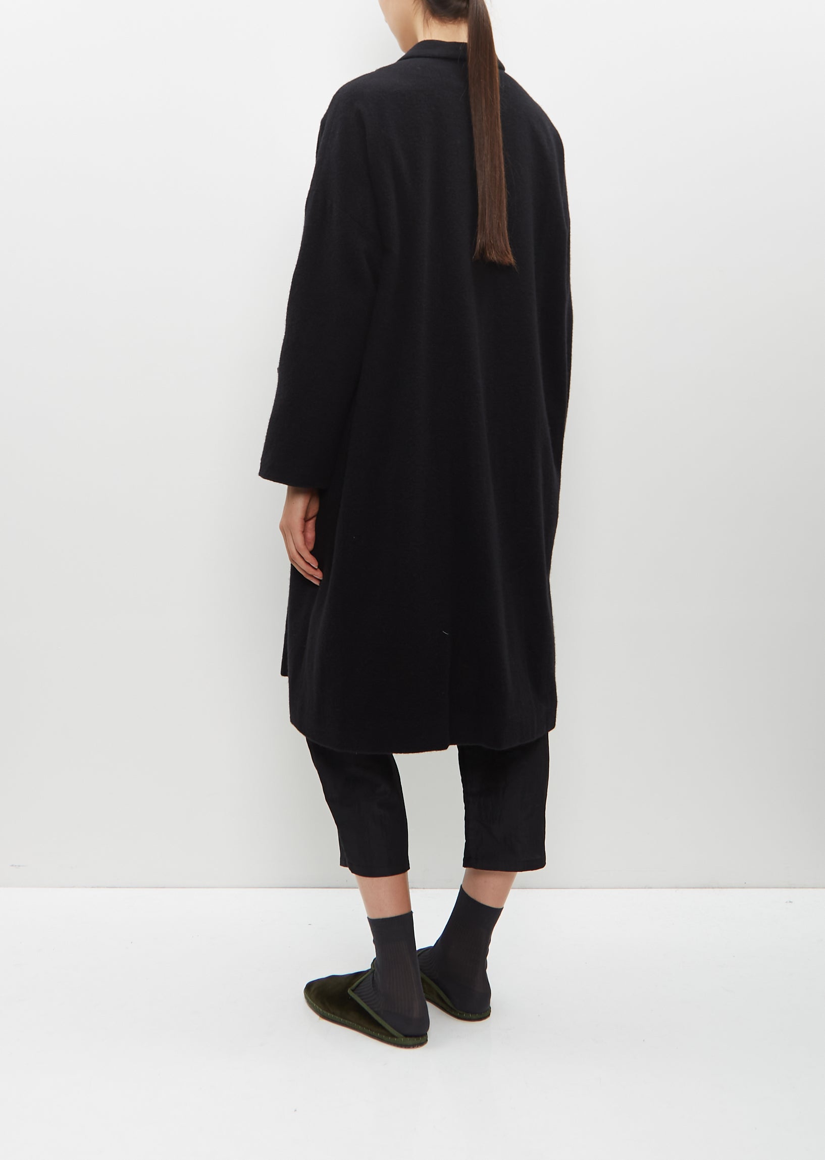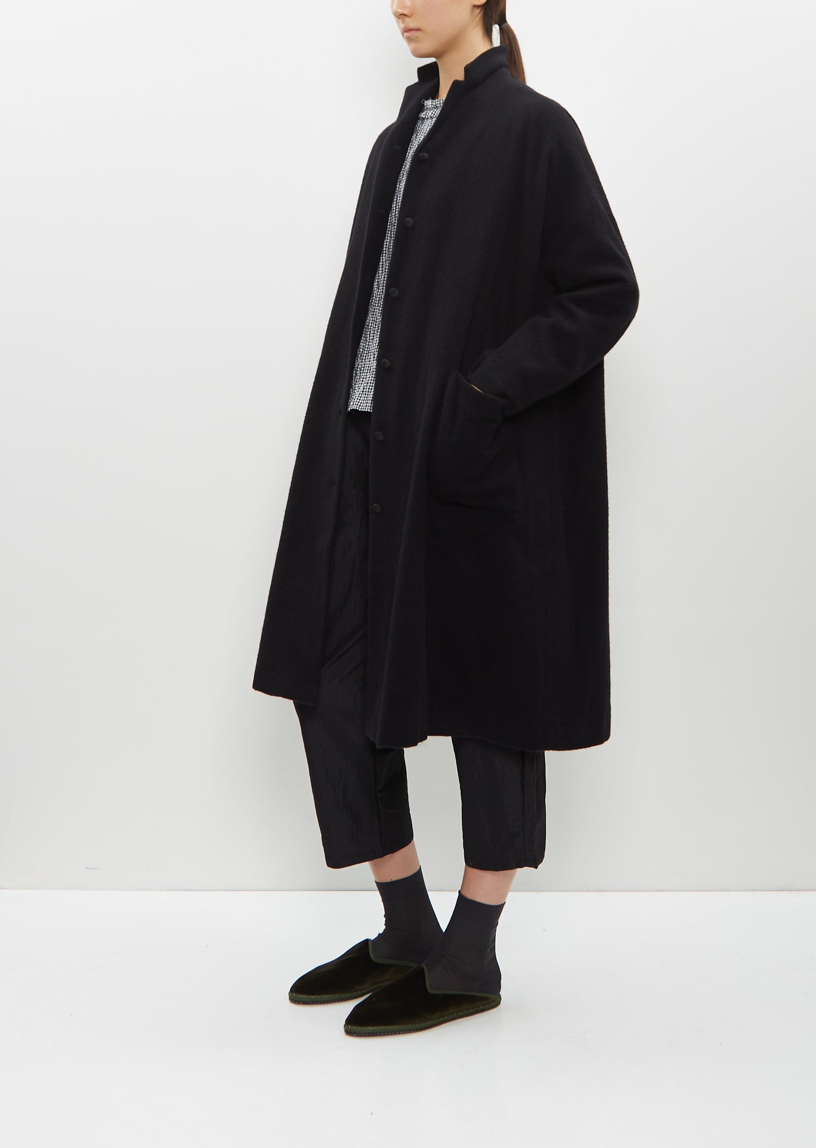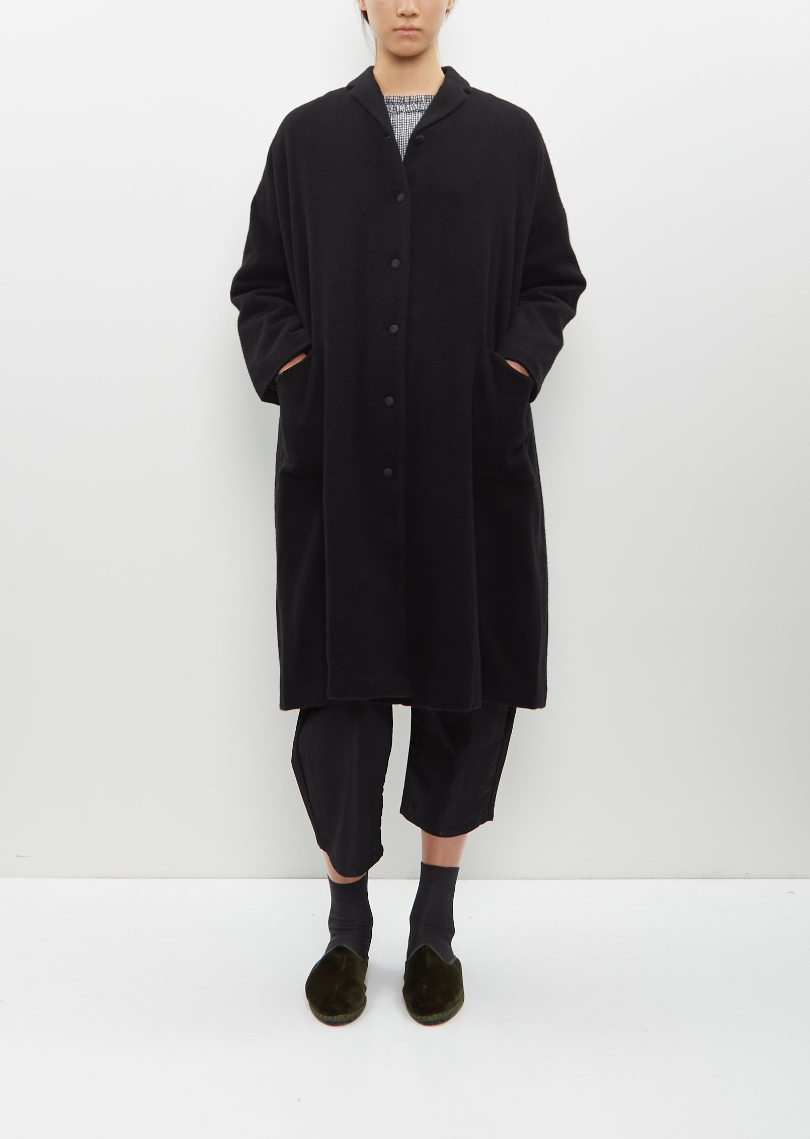 Astraea black coat with a mini notched lapels in wool and cashmere blend fleece. Features dropped shoulders, two deep patch pockets at front and a tonal buttons closure. Easy fit. Fully lined in tonal cotton fabric.