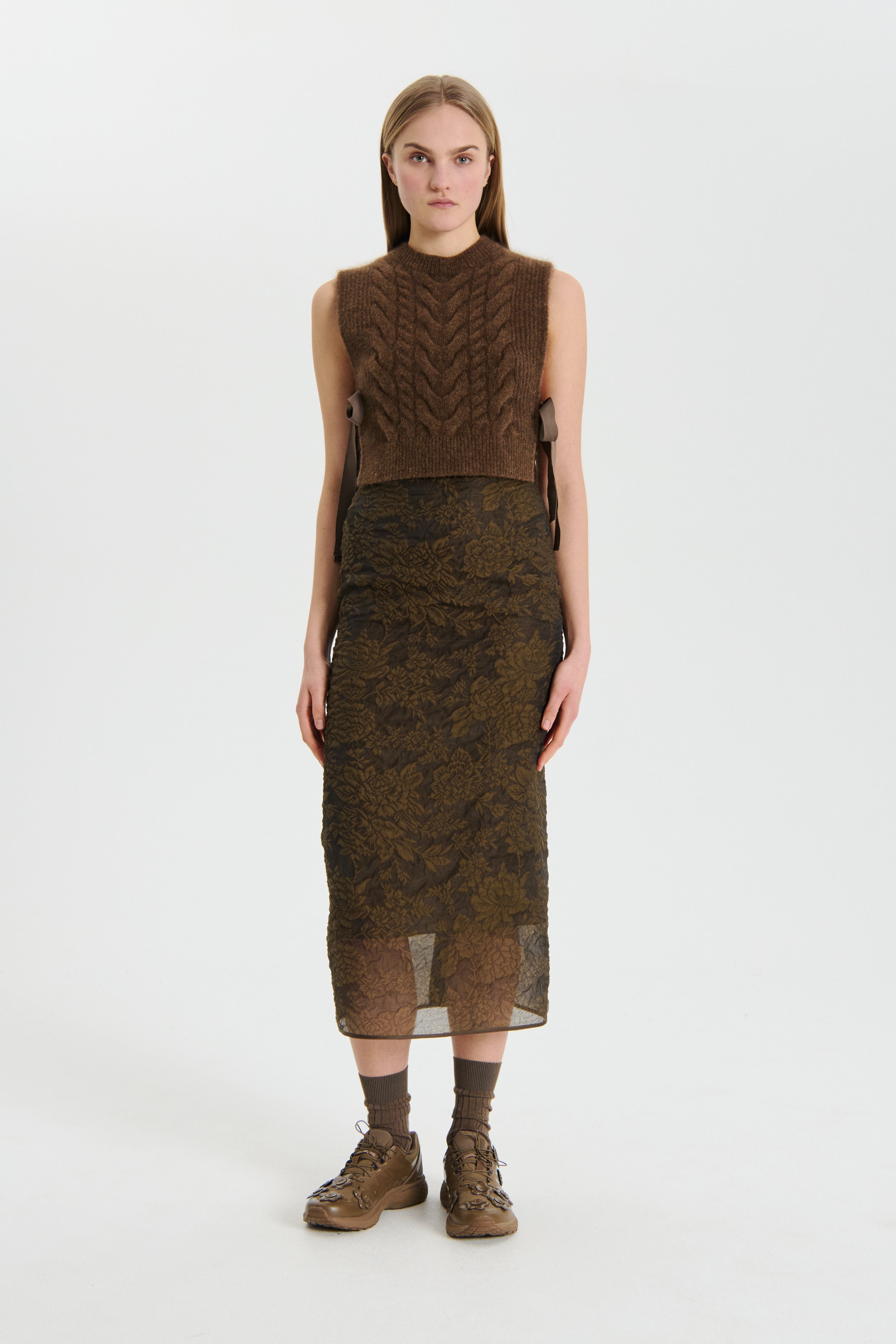 The knitted sweater is a sleeveless, brown cable – knit vest. It features a high – neck design and is paired with a long, patterned skirt and brown shoes, creating a stylish and coordinated look.