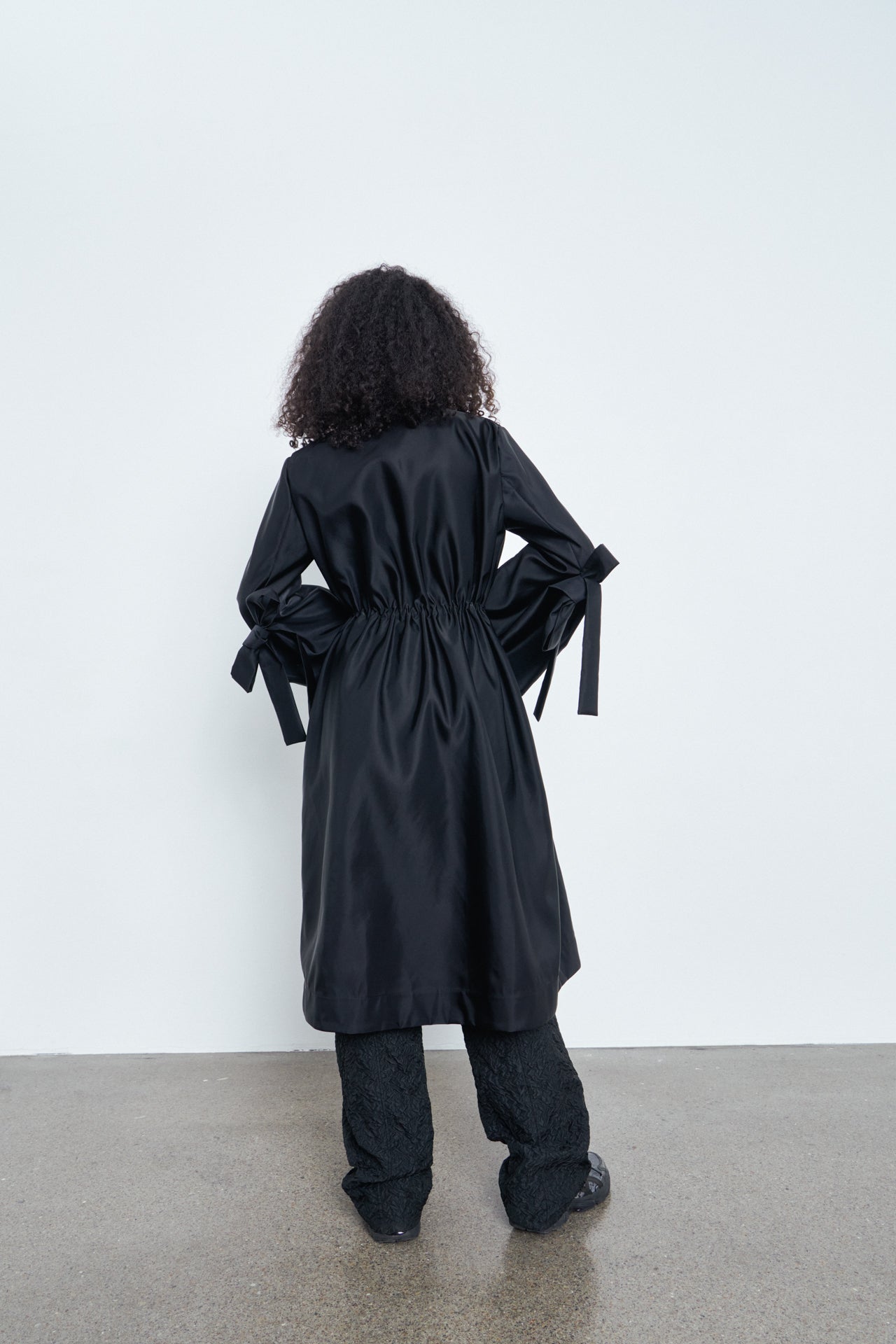The coat is a long, black garment with a belted waist. It features puffed sleeves and a button – up front. The coat is paired with black pants and shoes, creating a cohesive and stylish look.