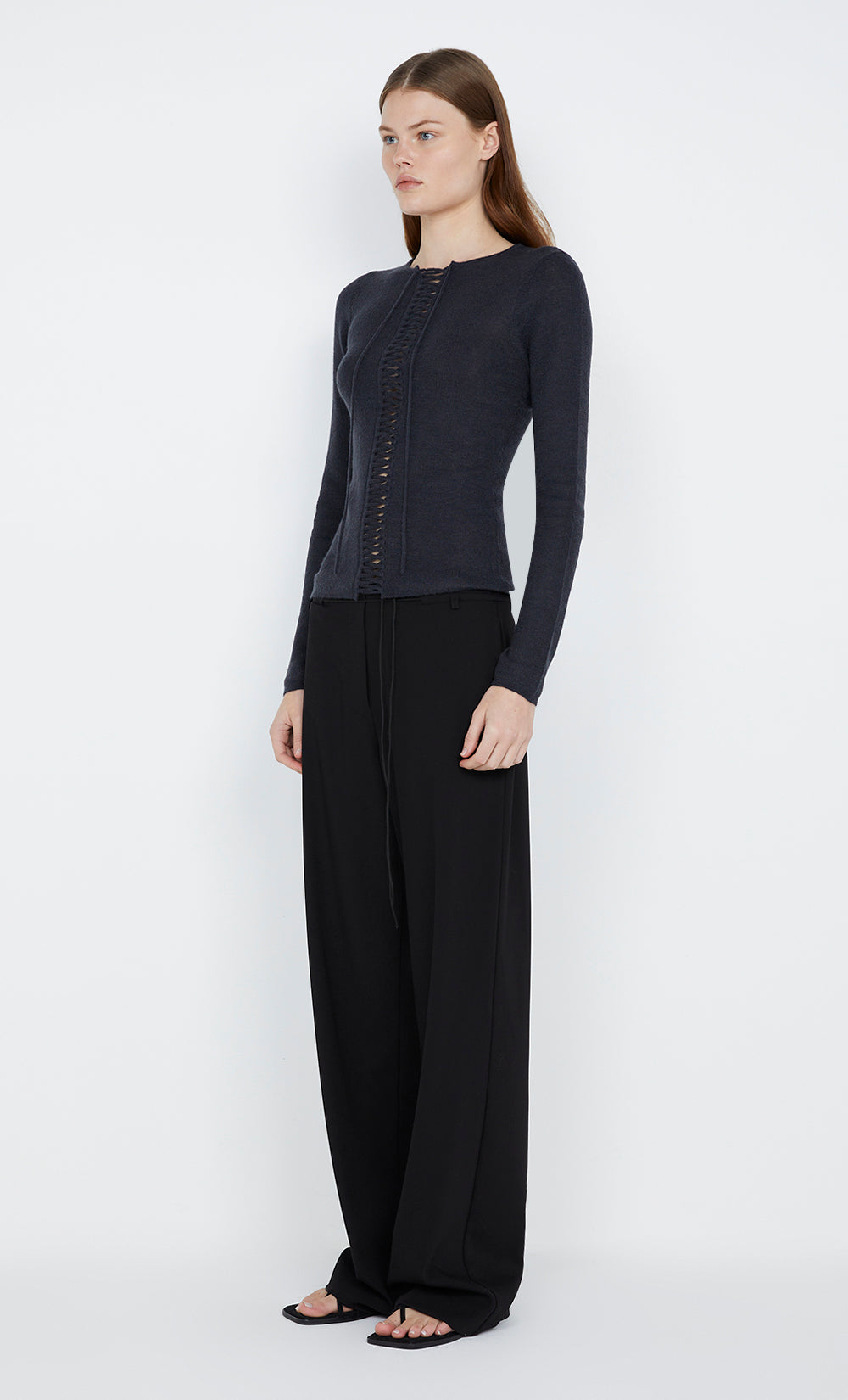 The Carys Knit Top is the perfect work to weekend wardrobe staple. Featuring a statement lace up detail on the centre front, which is self-tying at the top, with a scoop neckline. Styled with Naida Straight Leg Pant.