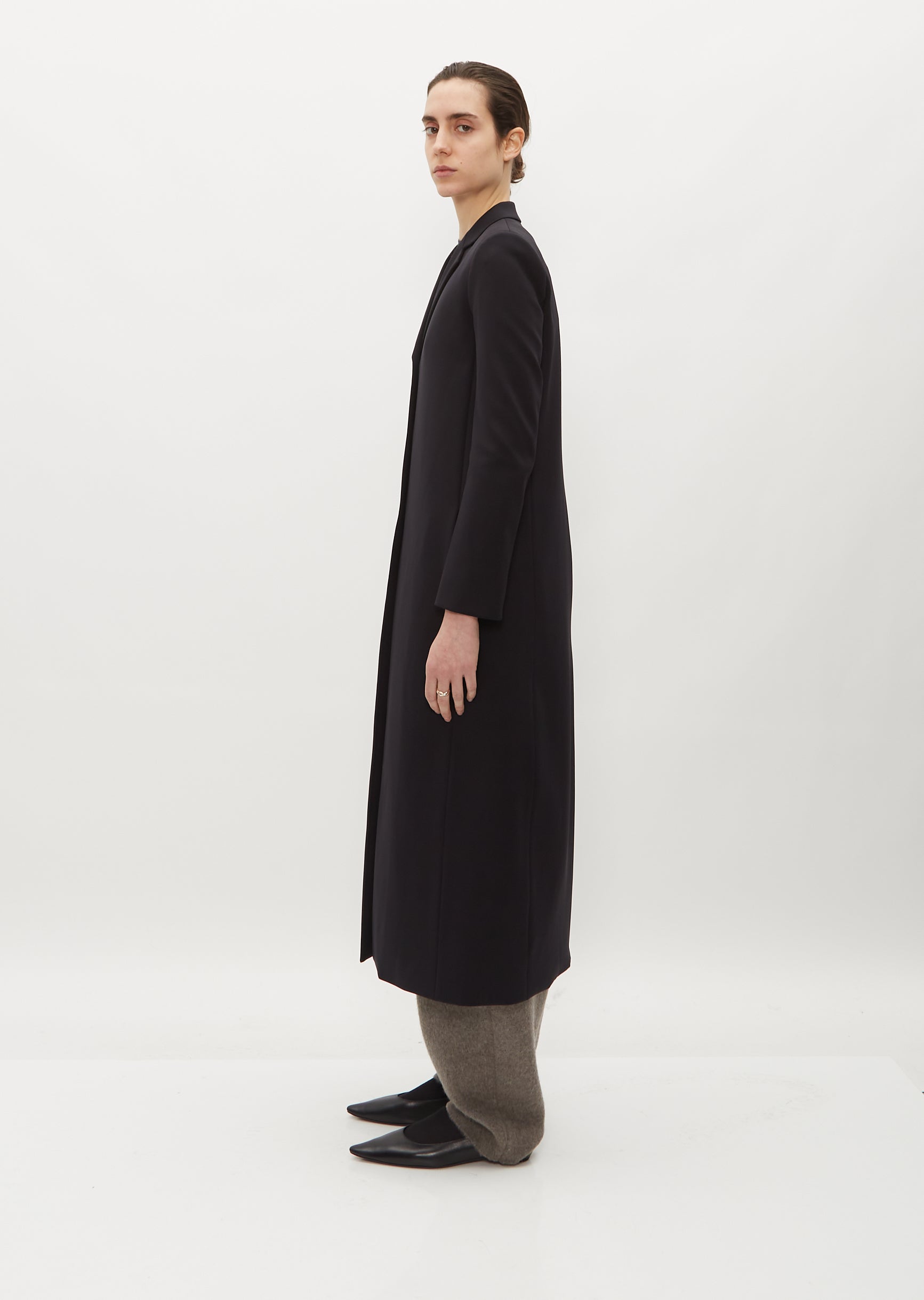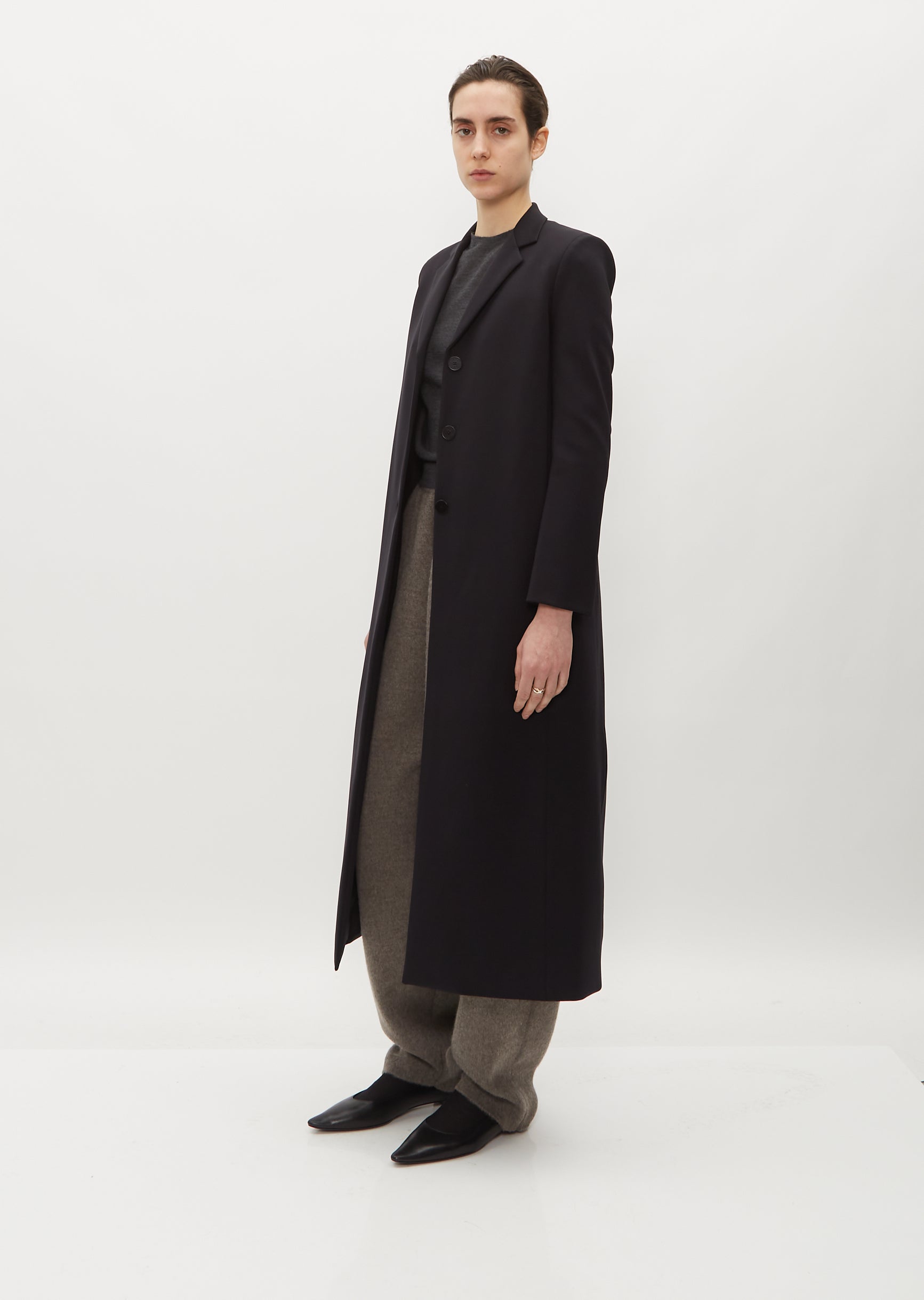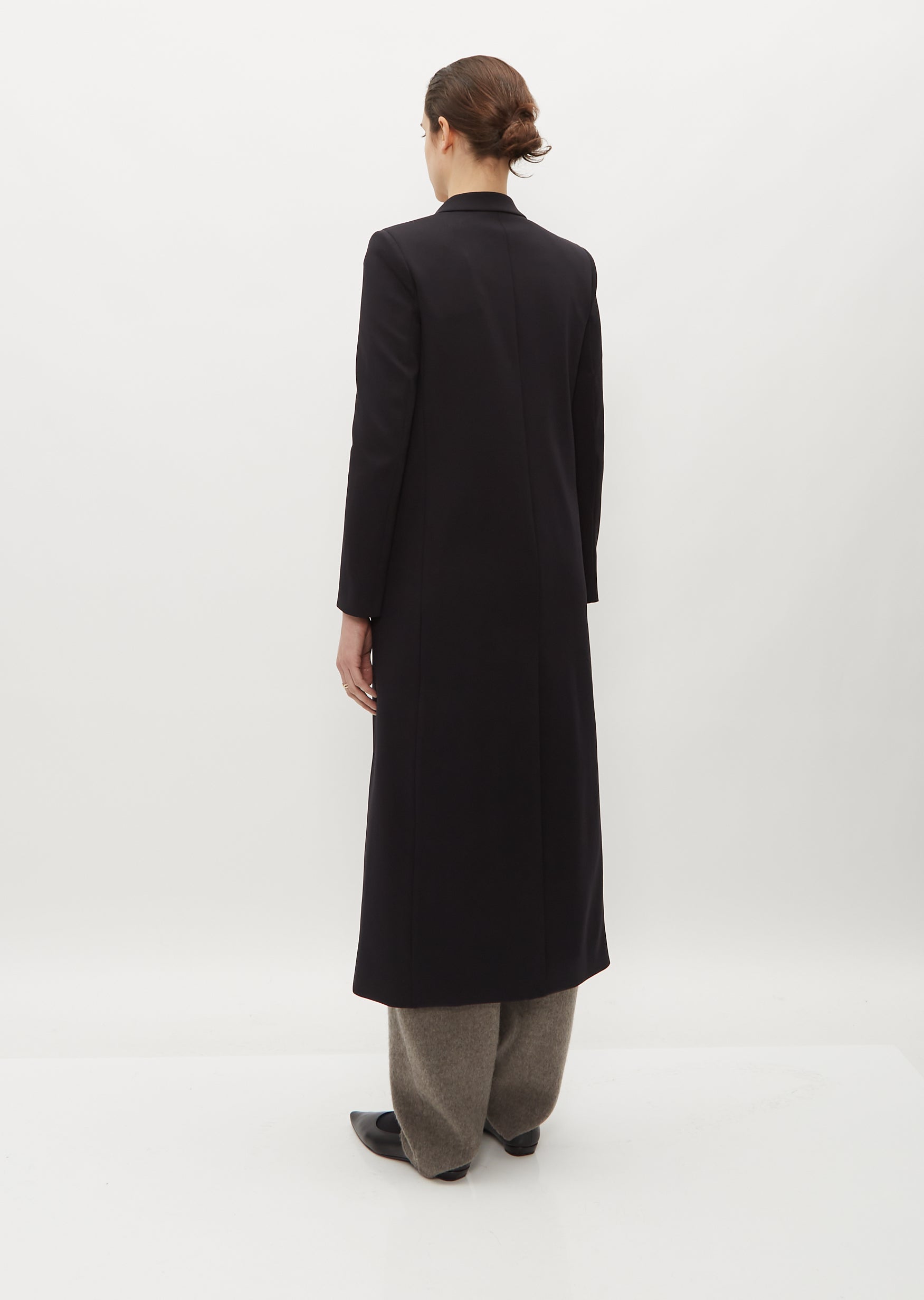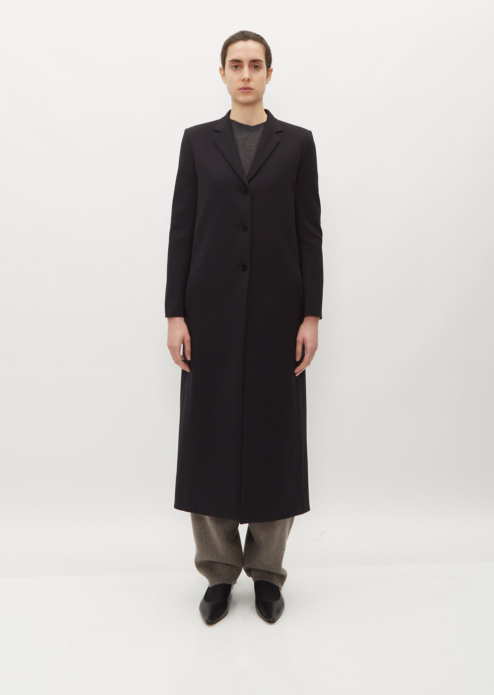 Cerys  black  coat with notched lapels and deep patch pockets in wool. Features set in shoulders, welt pocket at chest, side flap pockets and buttons closure at front. Finished with tonal buttons. Fully lined.