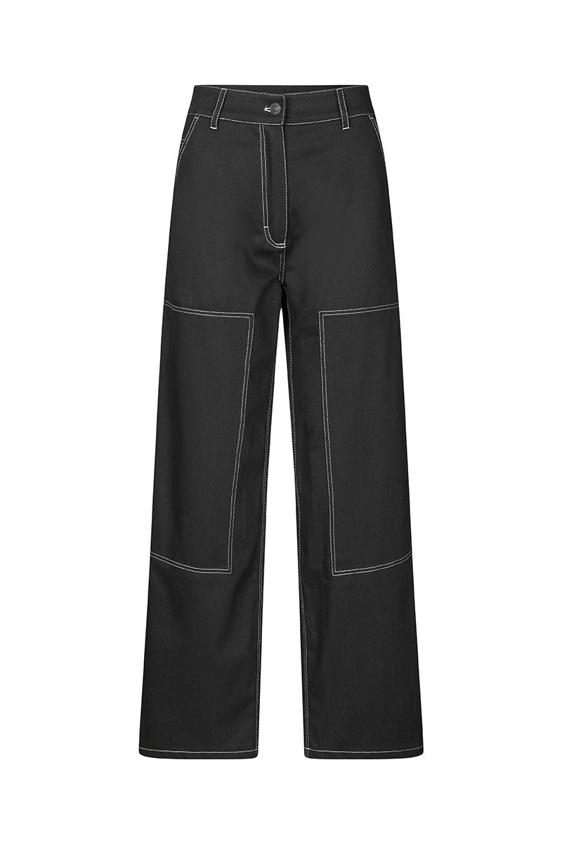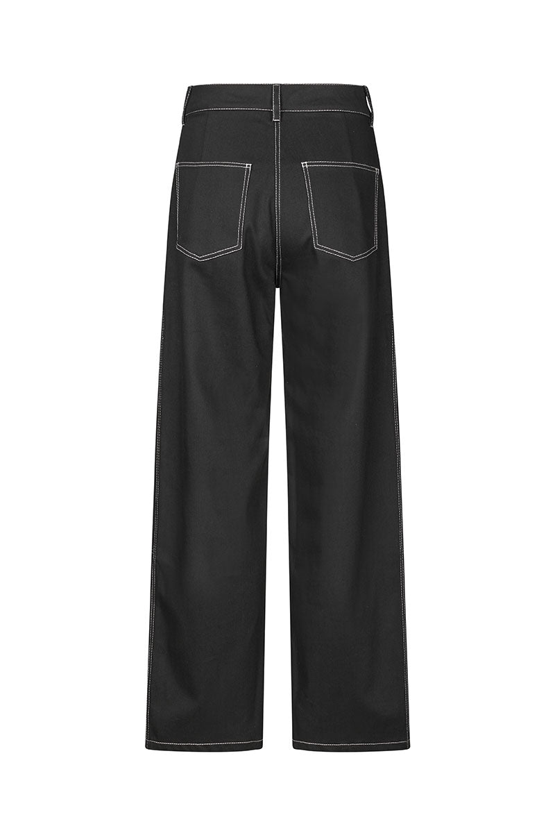 The bottoms are wide – leg, black pants. They feature a high – waisted design with visible seaming details and two patch pockets on the front. The pants have a relaxed, flowing fit, making them both stylish and comfortable.