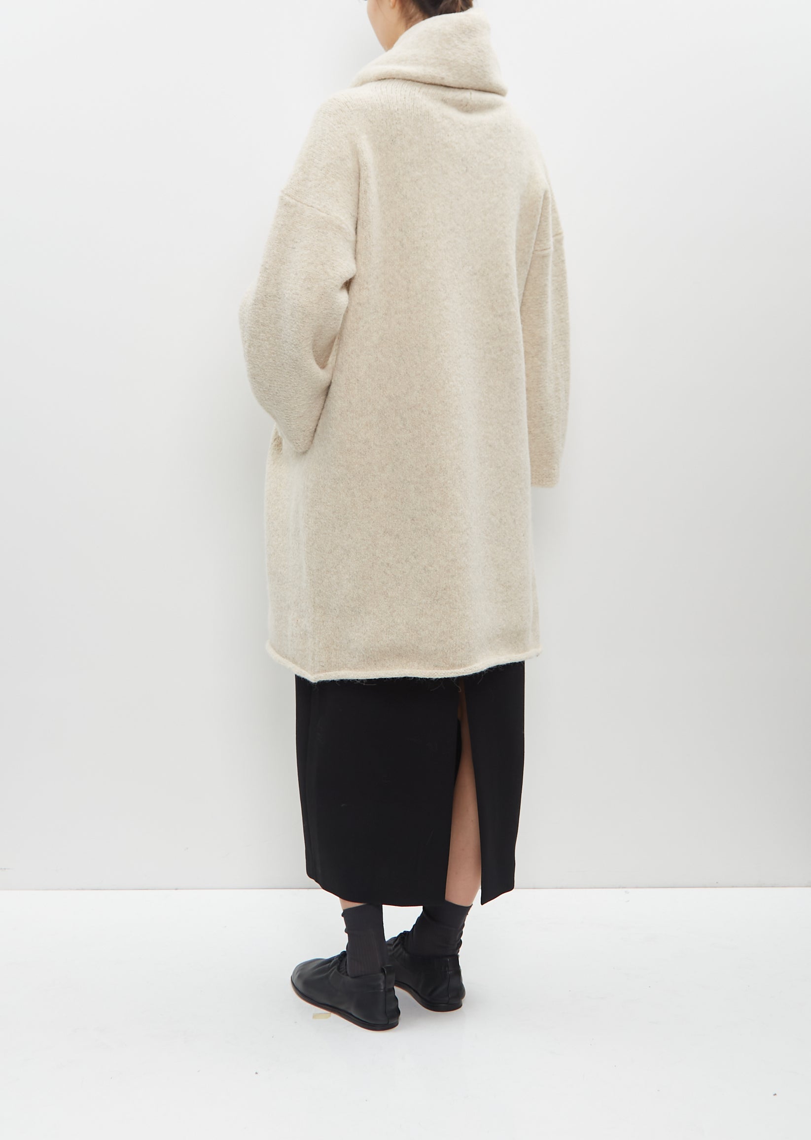 Knitted in felted mid-weight alpaca knit with slight stretch, this versatile sweater coat features a hood, dropped shoulders and self-lined front slit pockets. Finished with a rolled hemline. Subtle cocoon silhouette with an oversized fit.