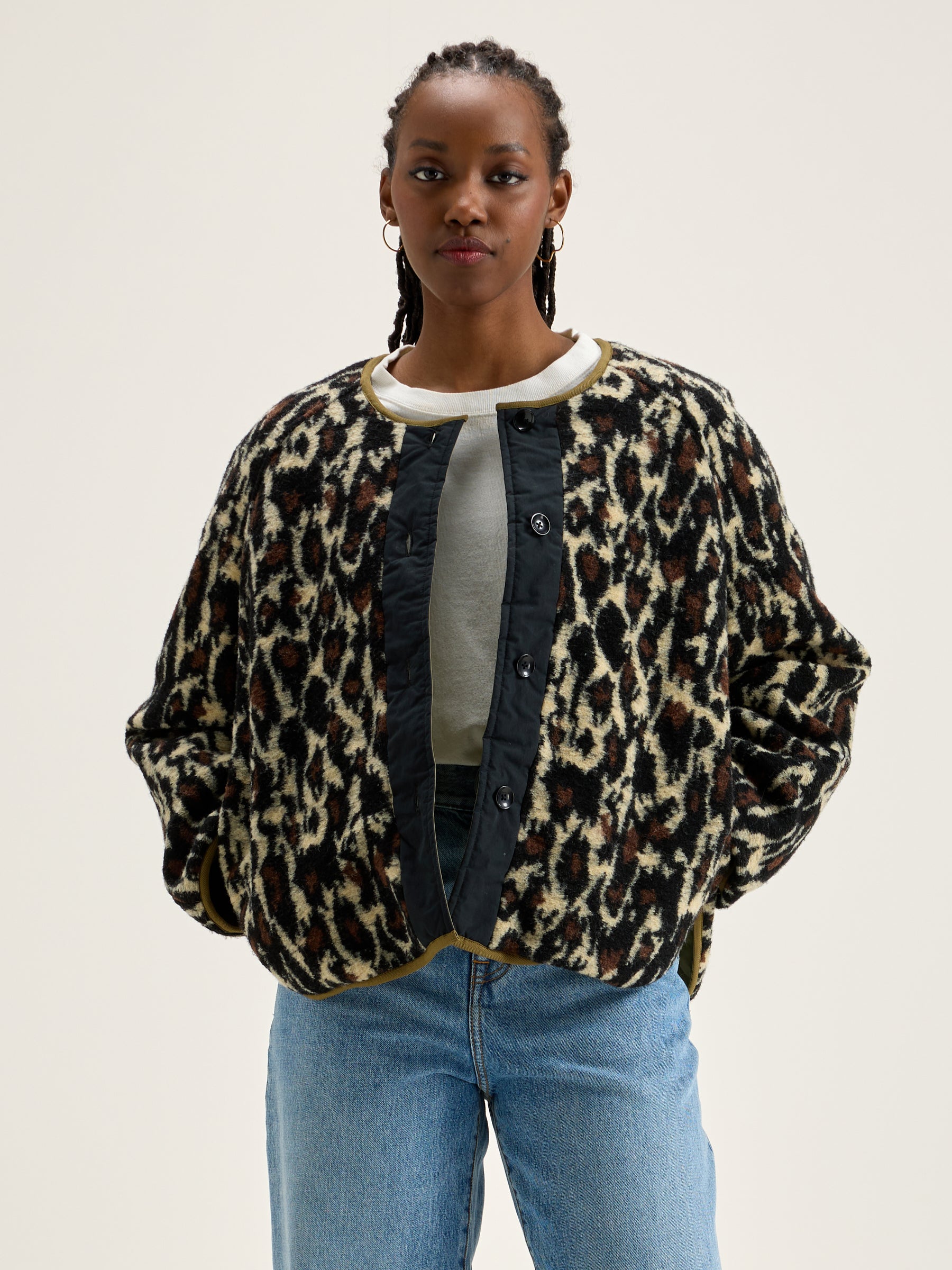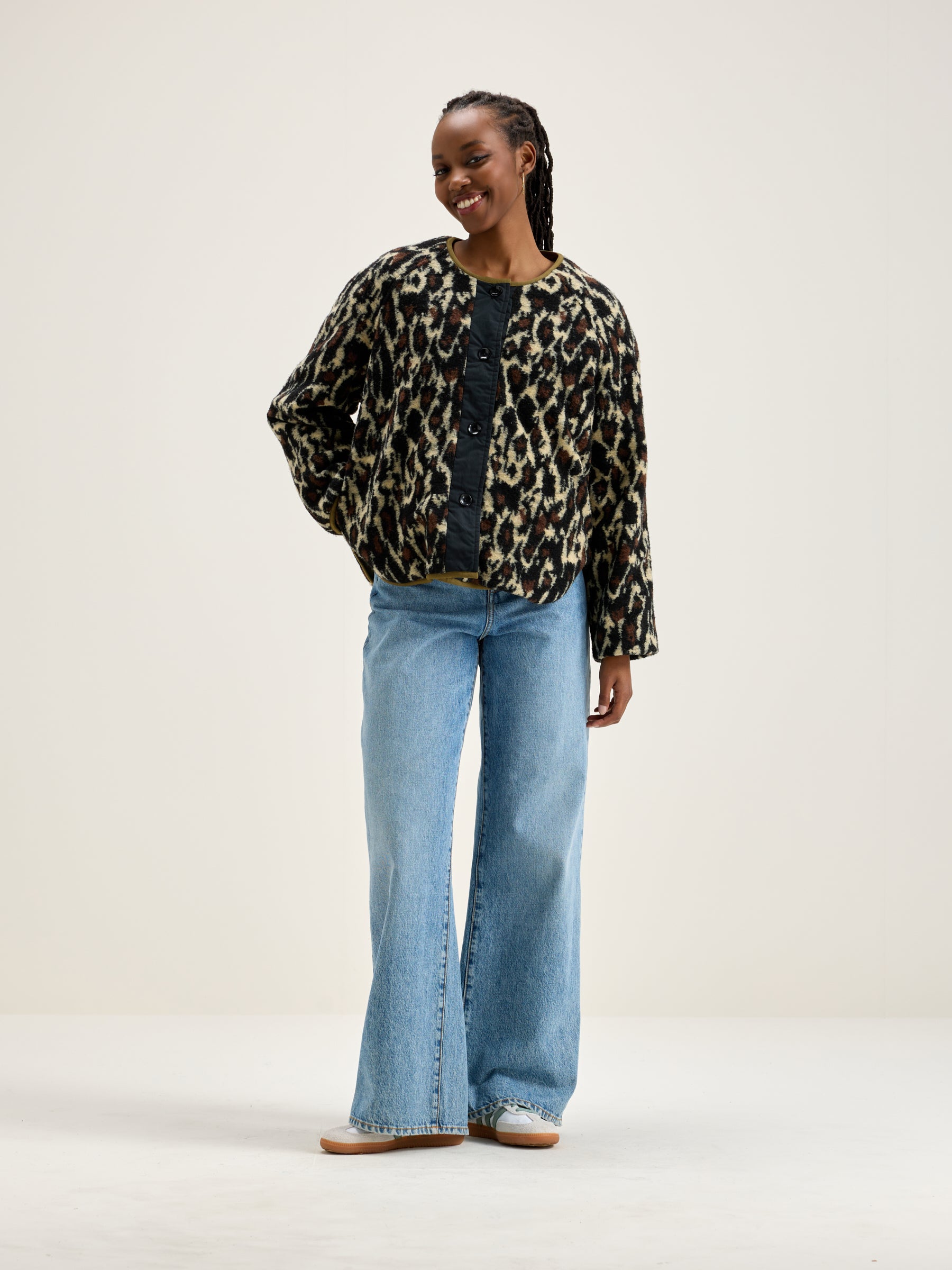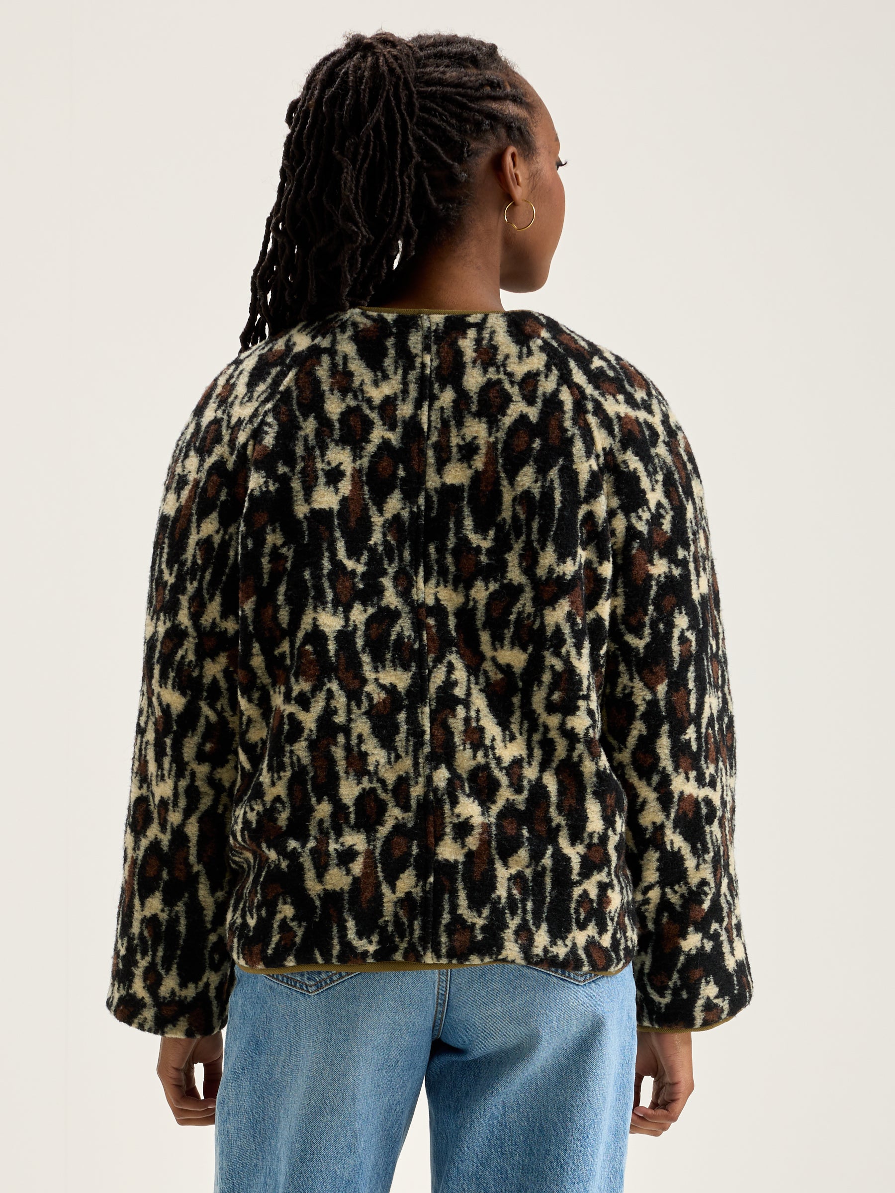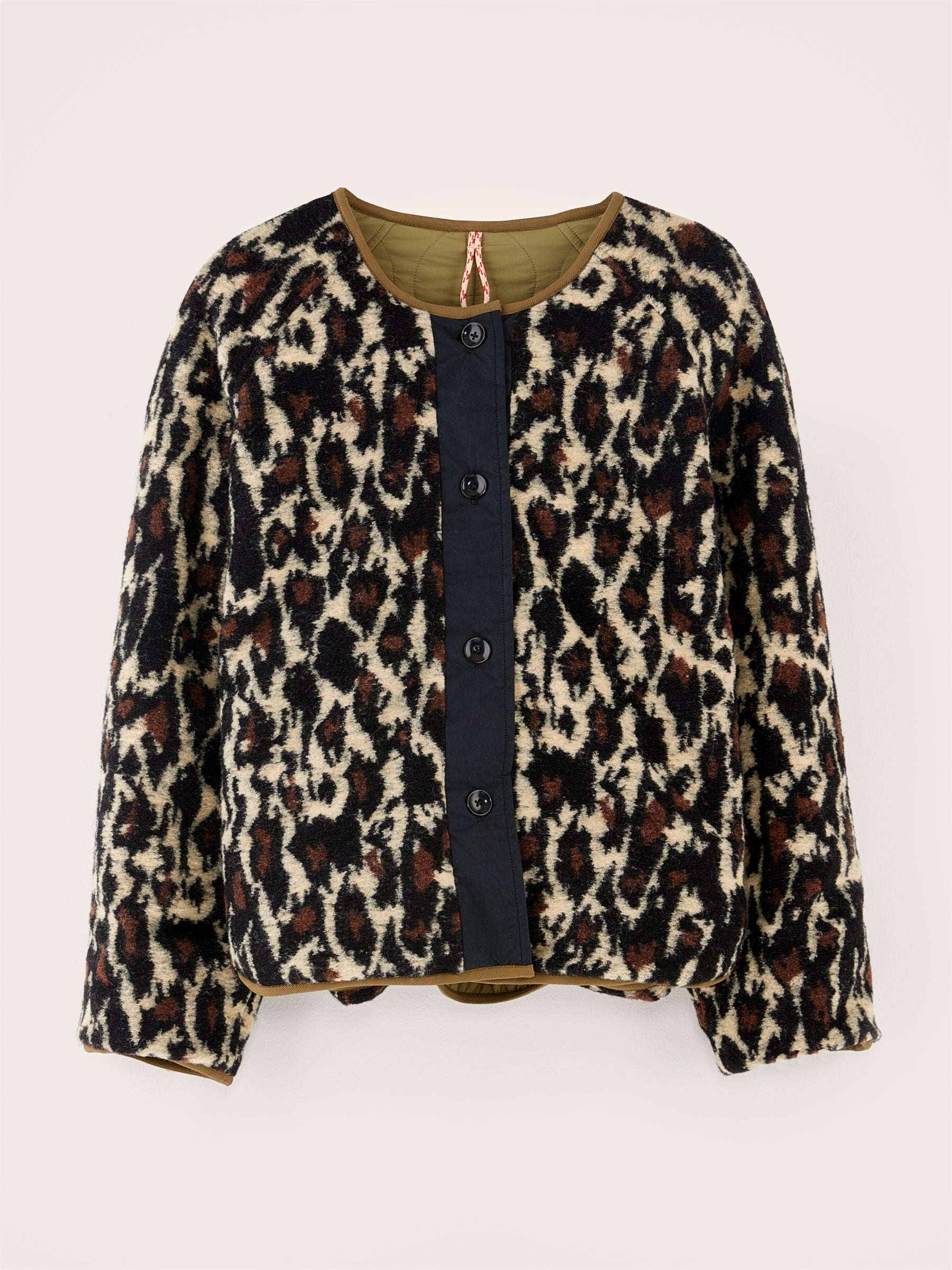 Reversible oversized jacket with raglan sleeves. One side in khaki ripstop and the other in leopard print fleece.