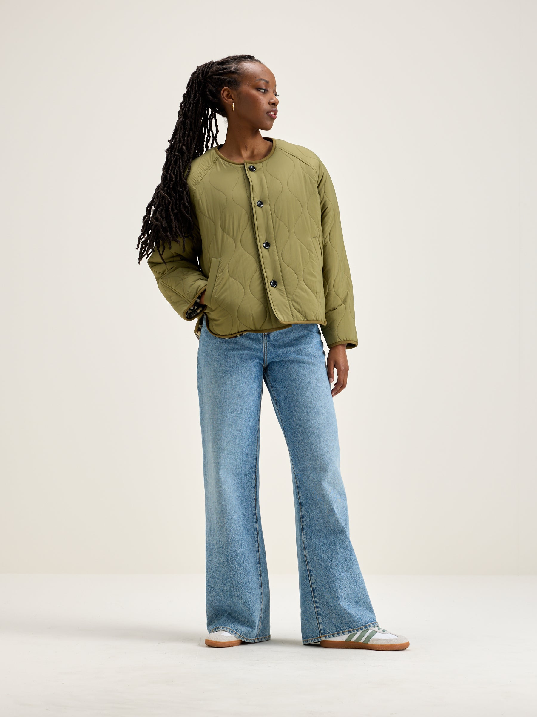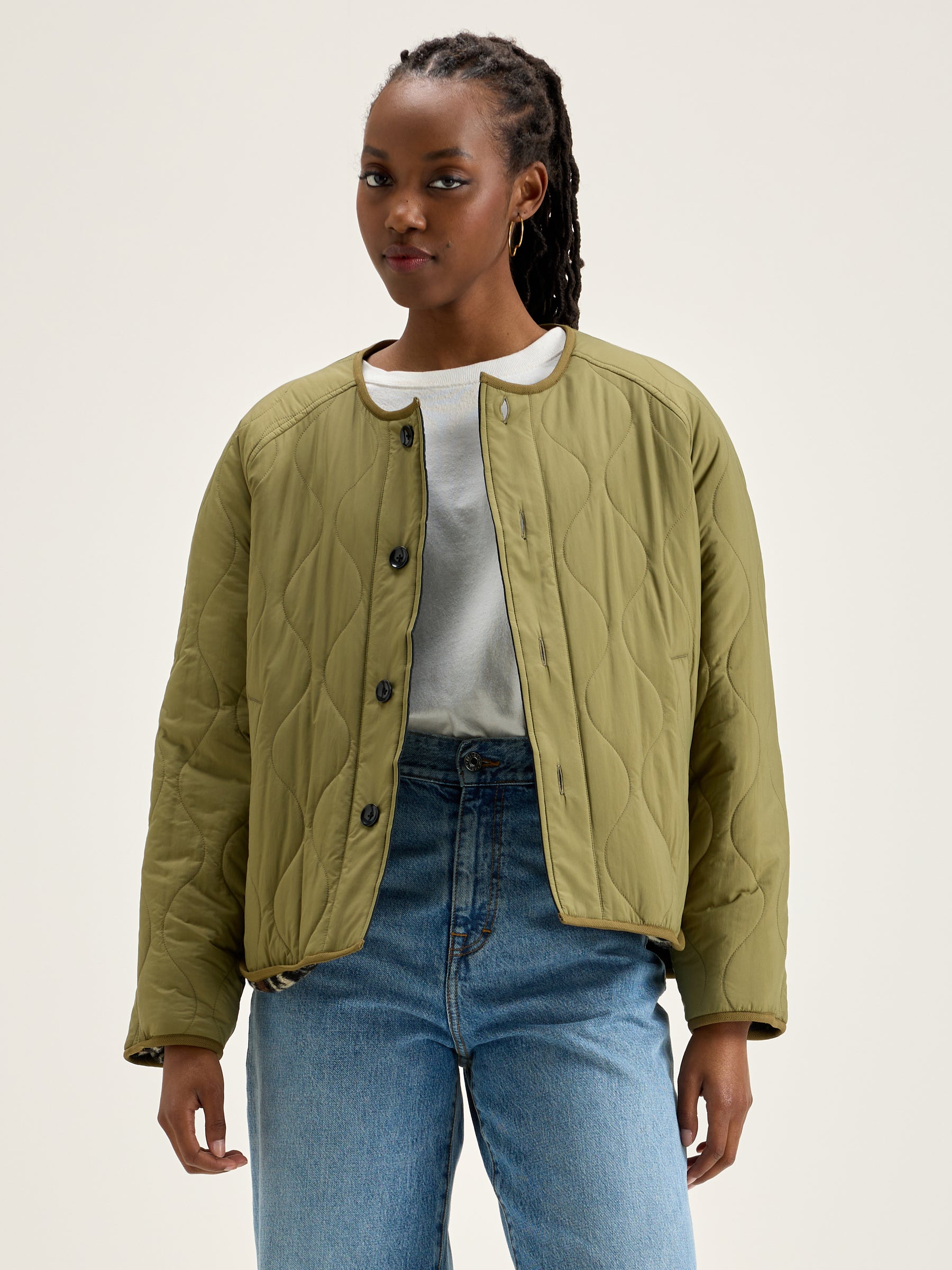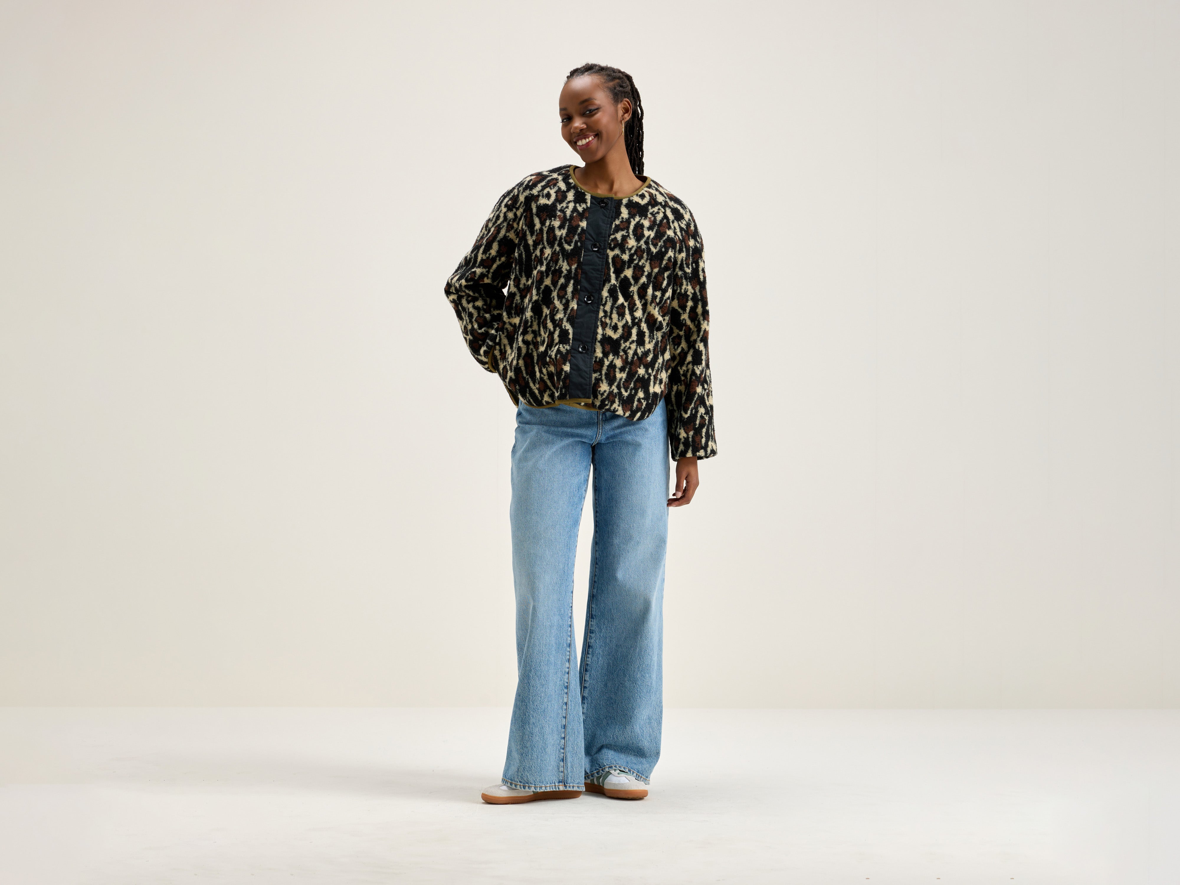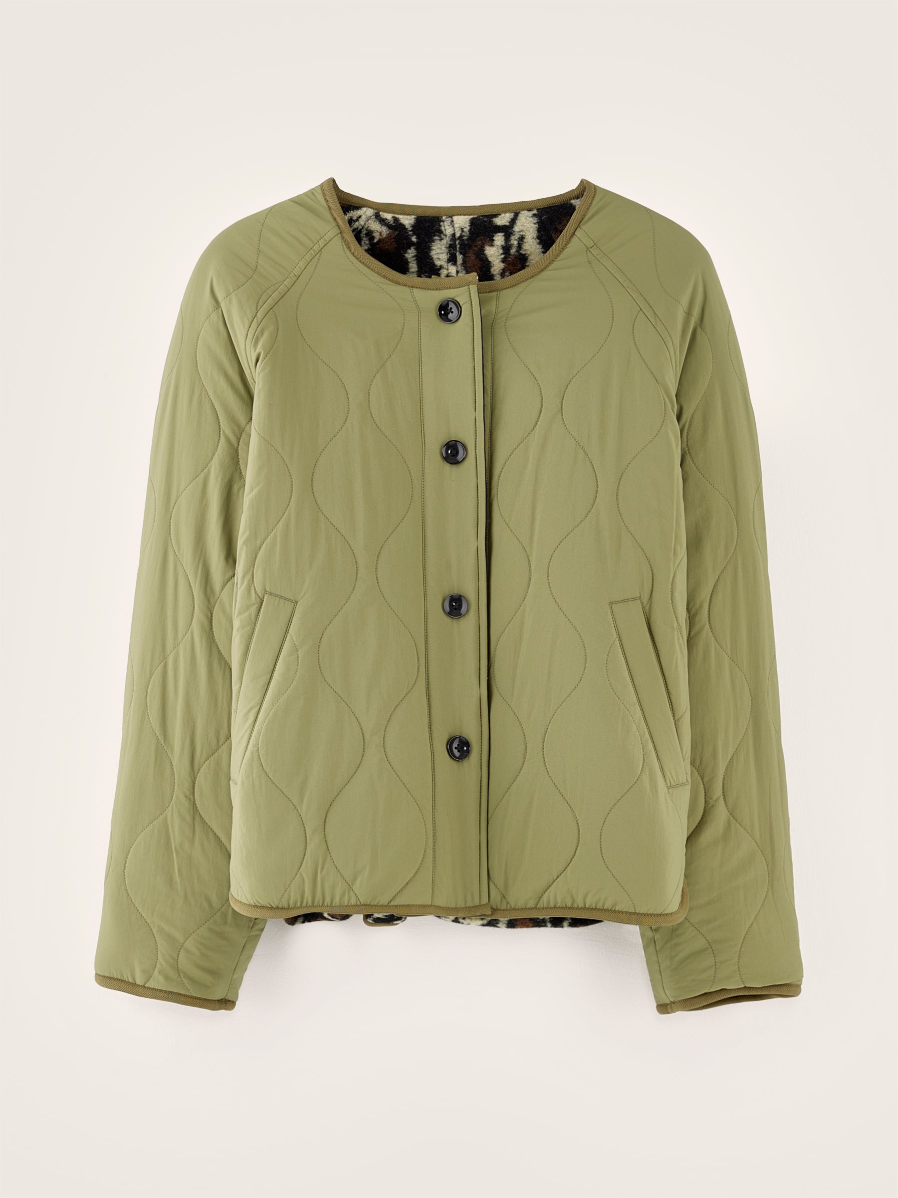 Reversible oversized jacket with raglan sleeves. One side in khaki ripstop and the other in leopard print fleece.