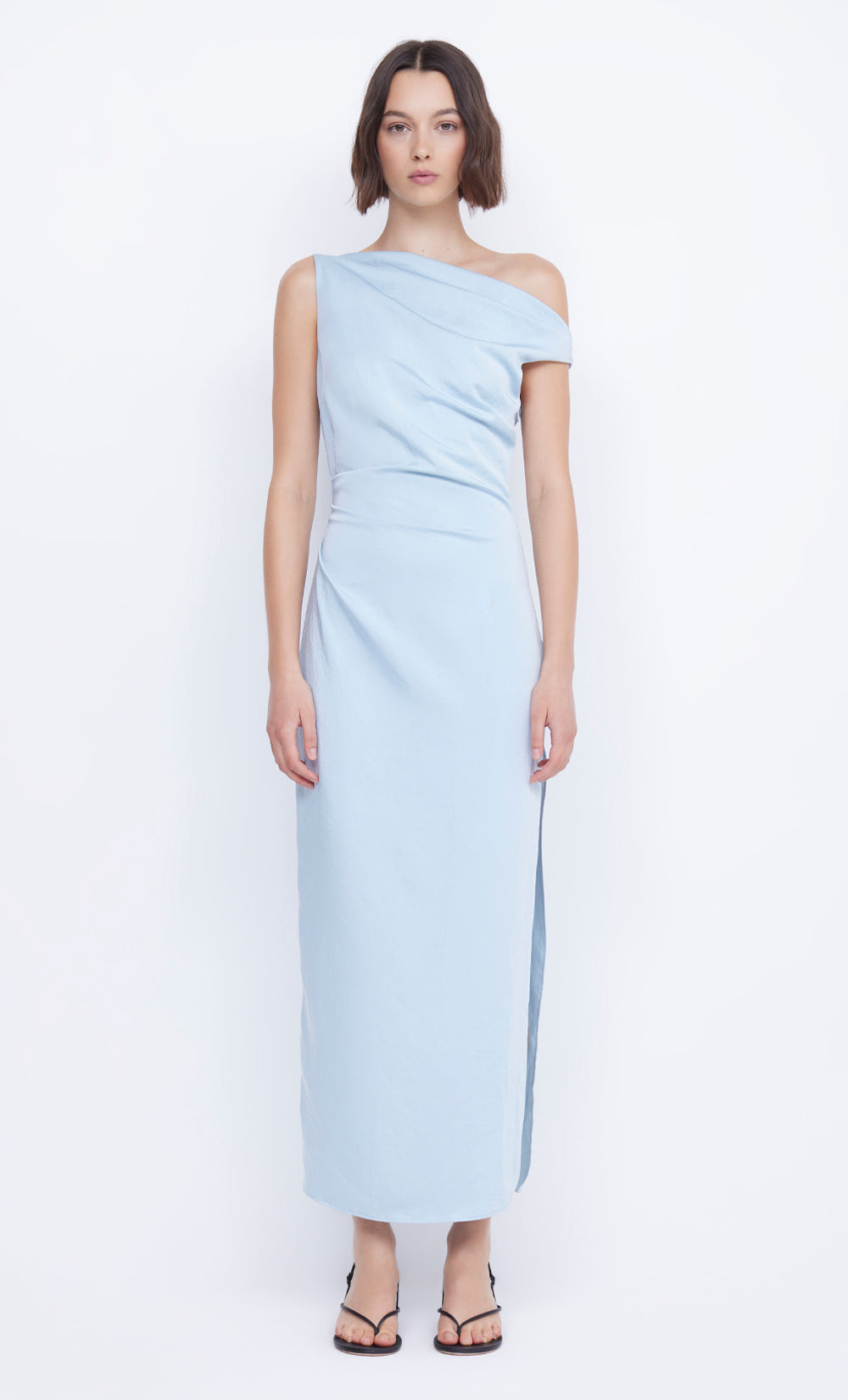 The Freya Midi Dress is an elegant and chic style. The eventwear midi dress features asymmetrical, off the shoulder neckline, tucks at side seams to flatter the silhouette, mid thigh side split, darts for shaping and lining to full length.