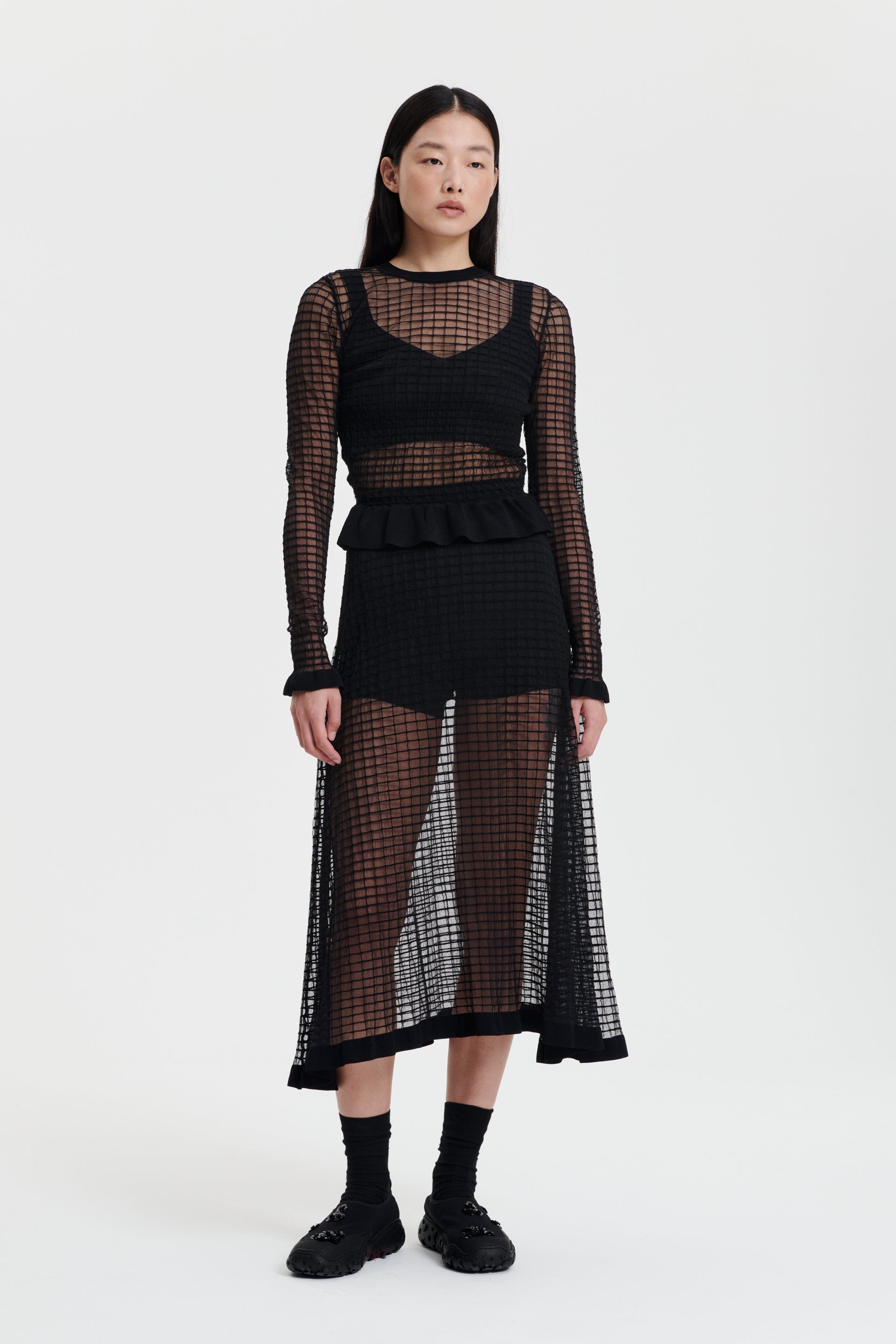 Sheer grid maxi skirt Crafted for a flowy silhouette Layered sheer grid design Elegant tiered structure Adjustable waist with tie Detail Lightweight and breathable fabric Body: 100% Polyester Gentle hand wash separately with mild detergent.