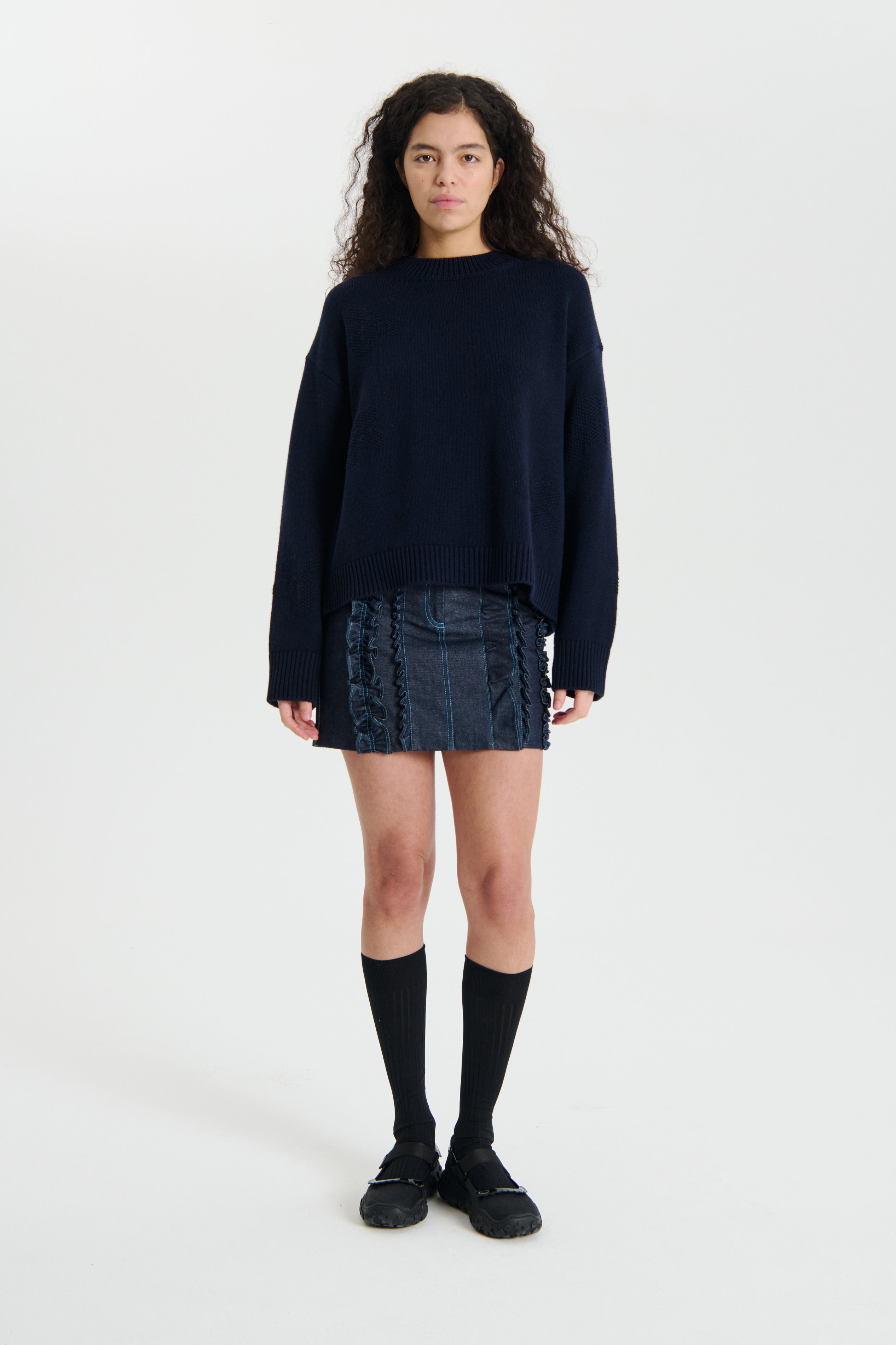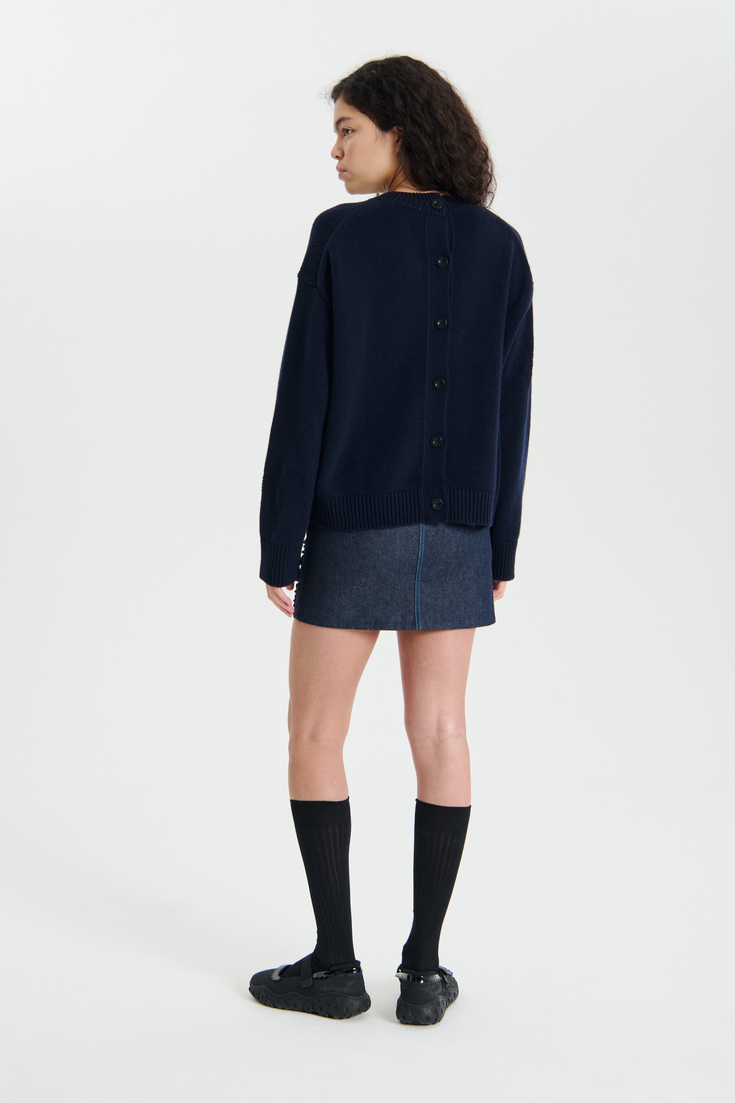 The knitted sweater is a deep navy blue color with a soft, textured appearance. It features a button – down back design, long sleeves, and a relaxed fit. The sweater pairs well with the denim skirt and black shoes, creating a stylish and coordinated look.