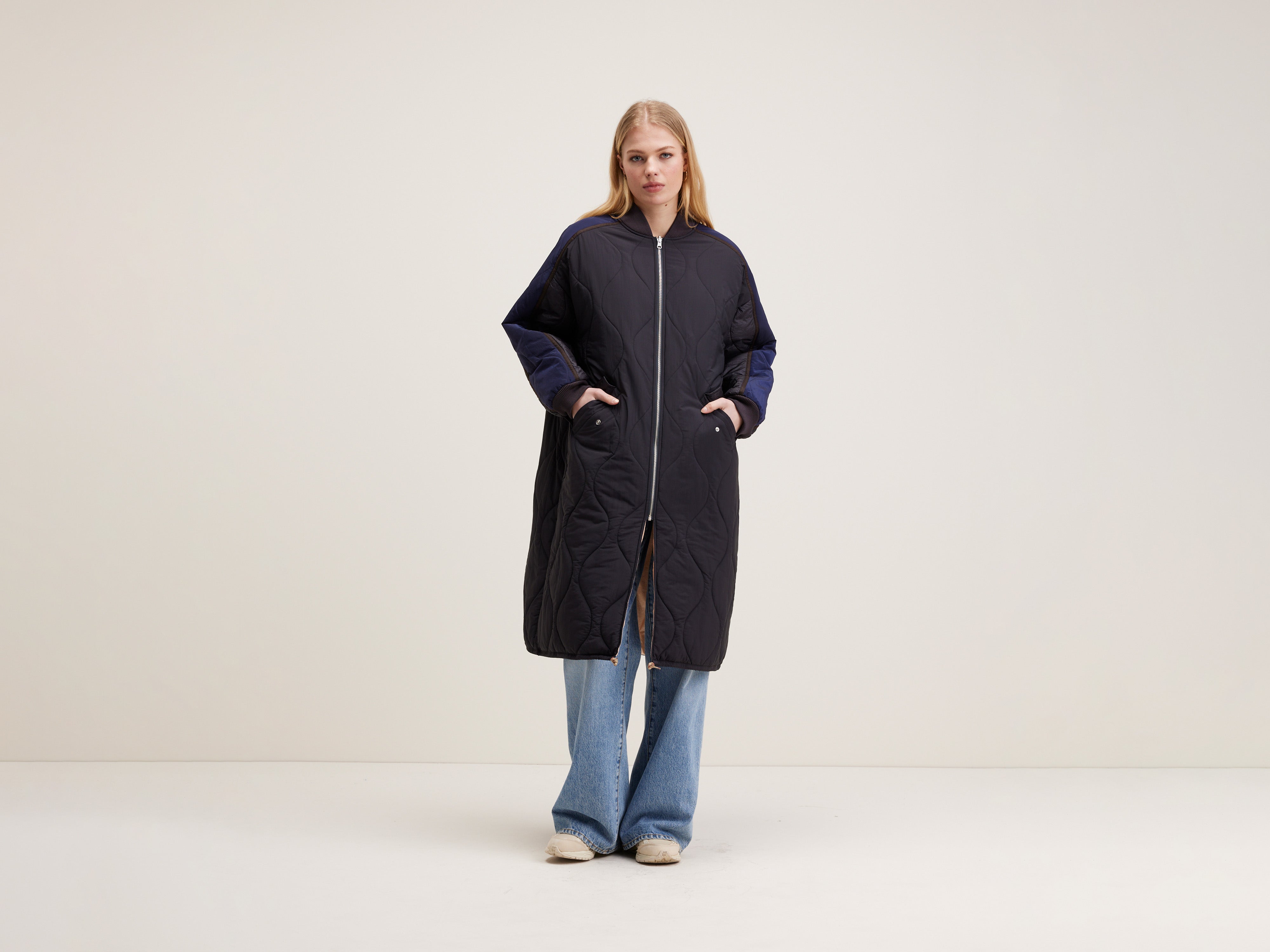 Reversible oversized quilted coat in black with navy blue inlays.