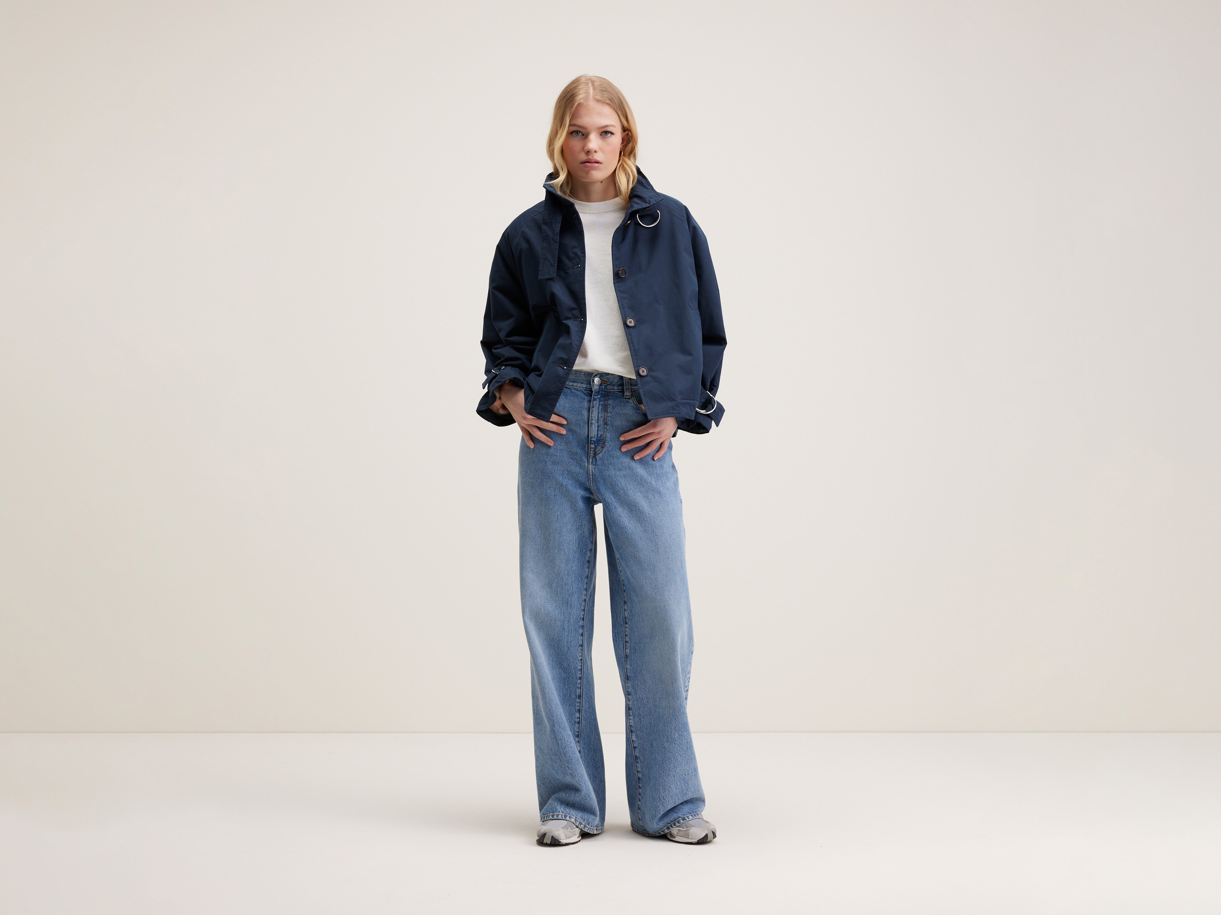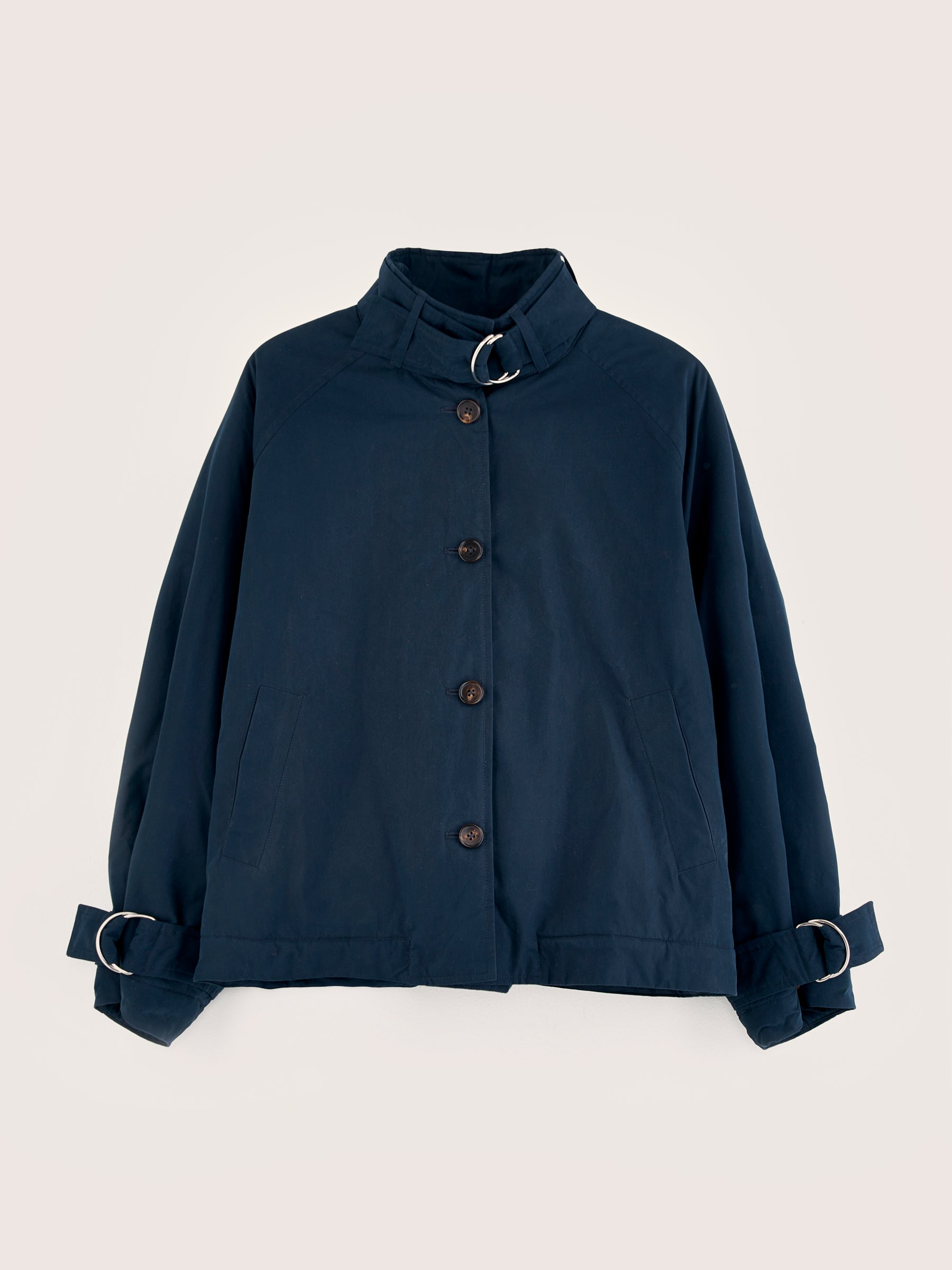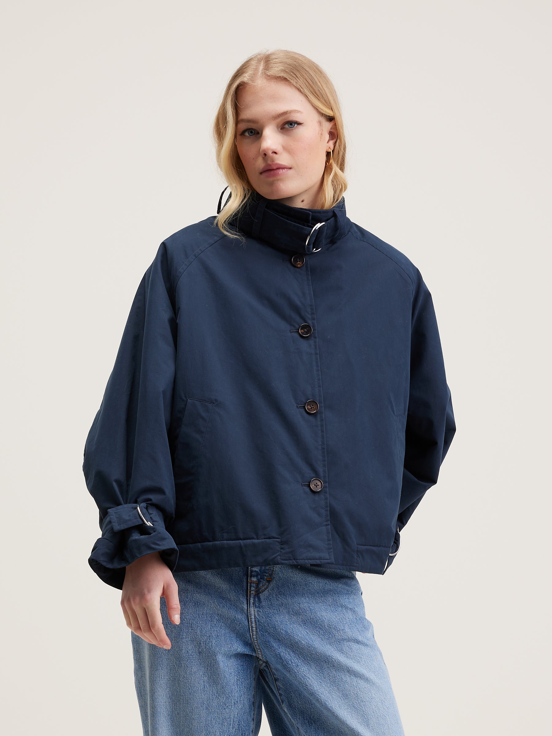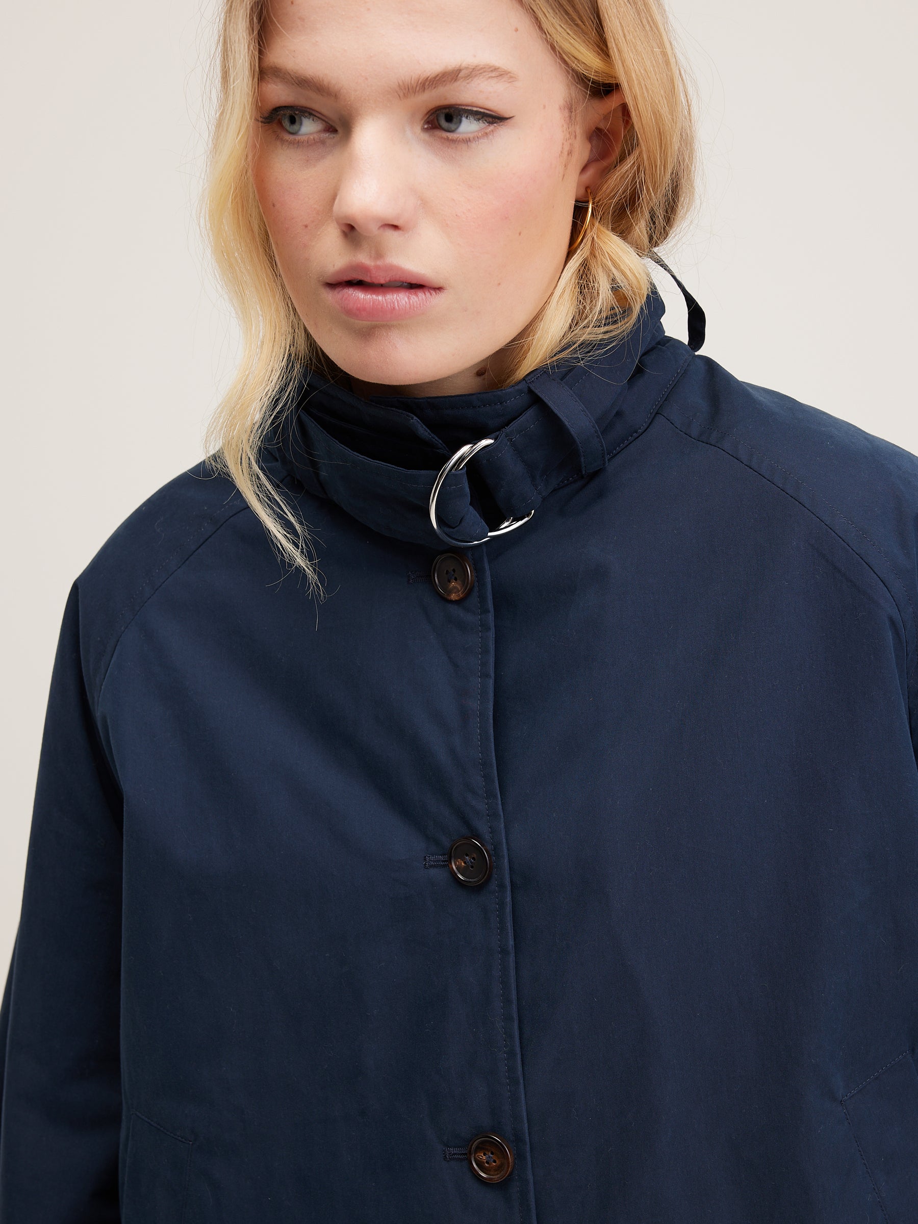 Short and oversized, trench-style jacket in navy blue, lined with a wooly fabric with grey checks.