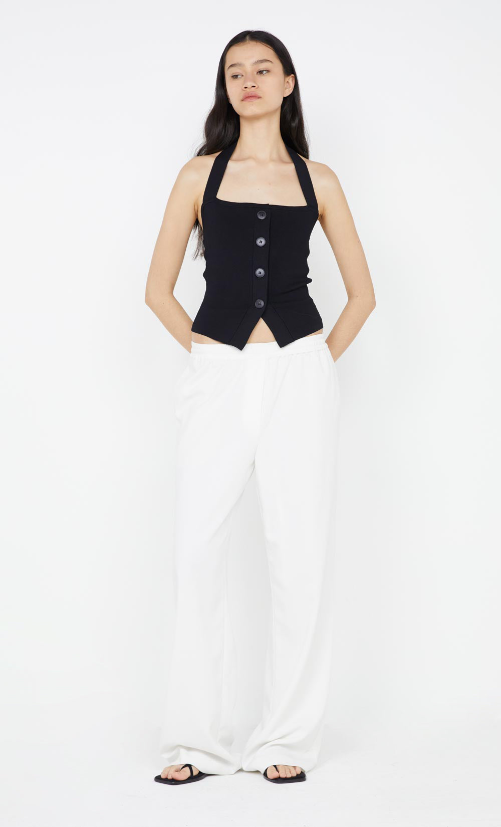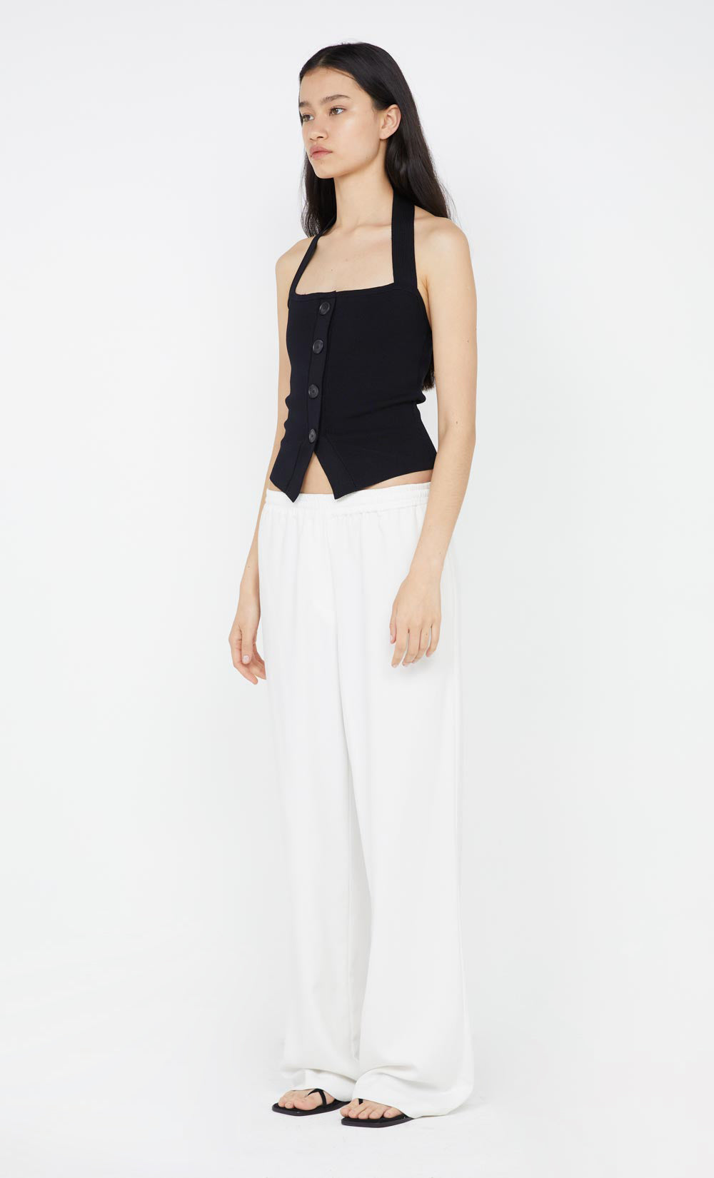 Crafted from a luxurious heavy knit dress the Kalila Top is an effortless wardrobe essential. Featuring a straight neckline and a halter neck strap, with button closures on the centre front detailed with a split hem at centre front.