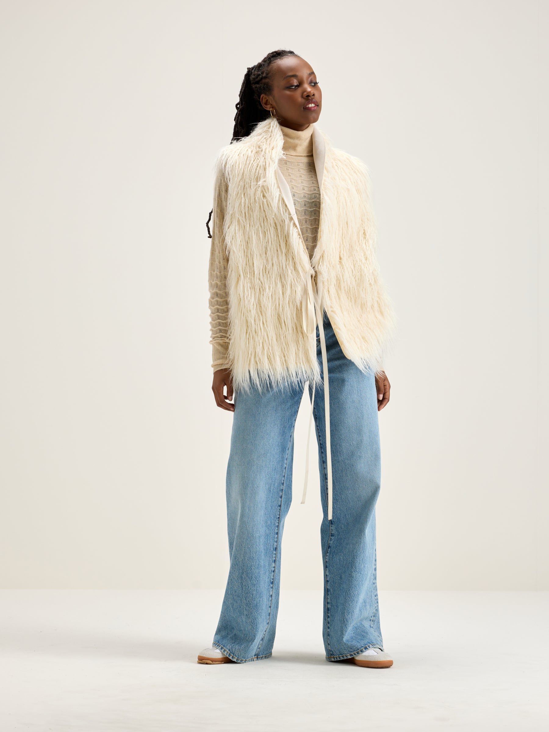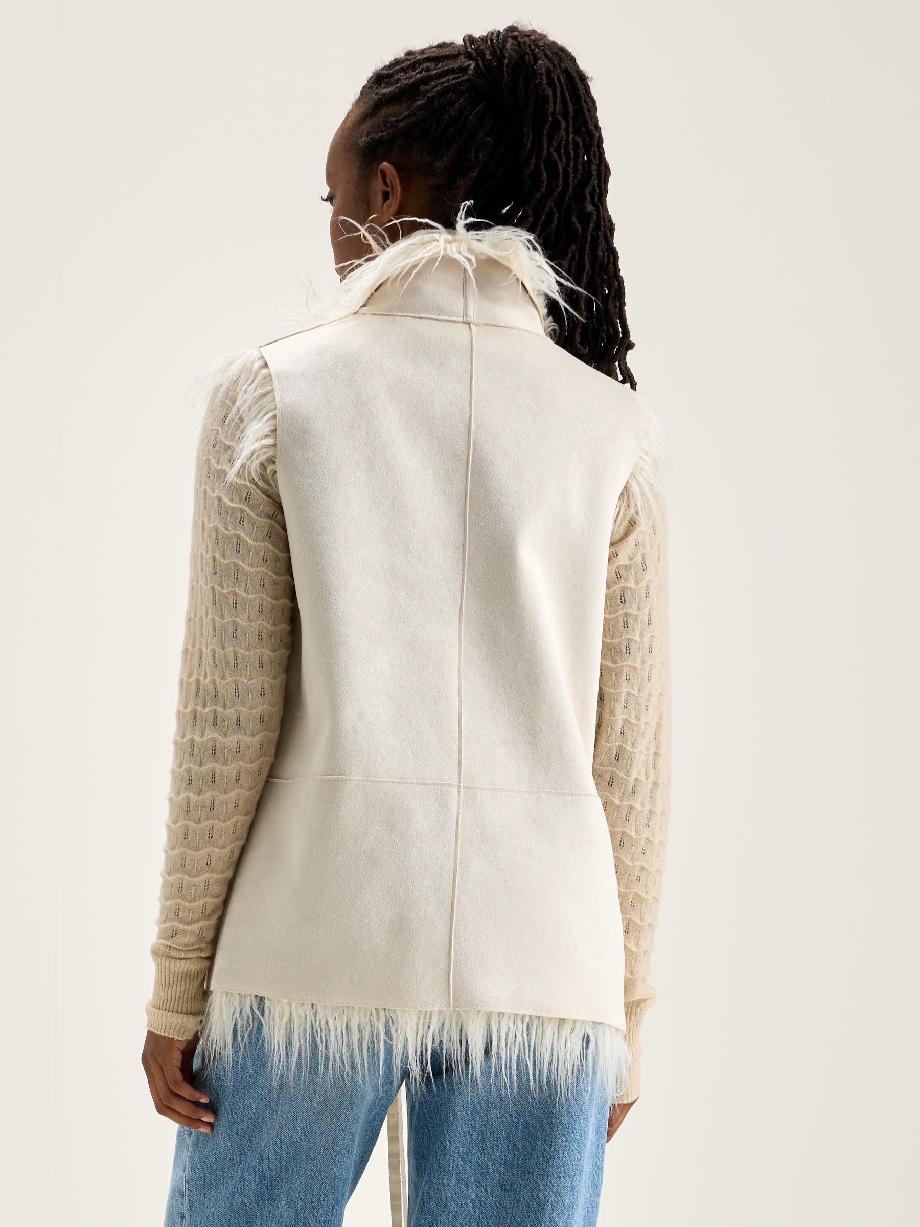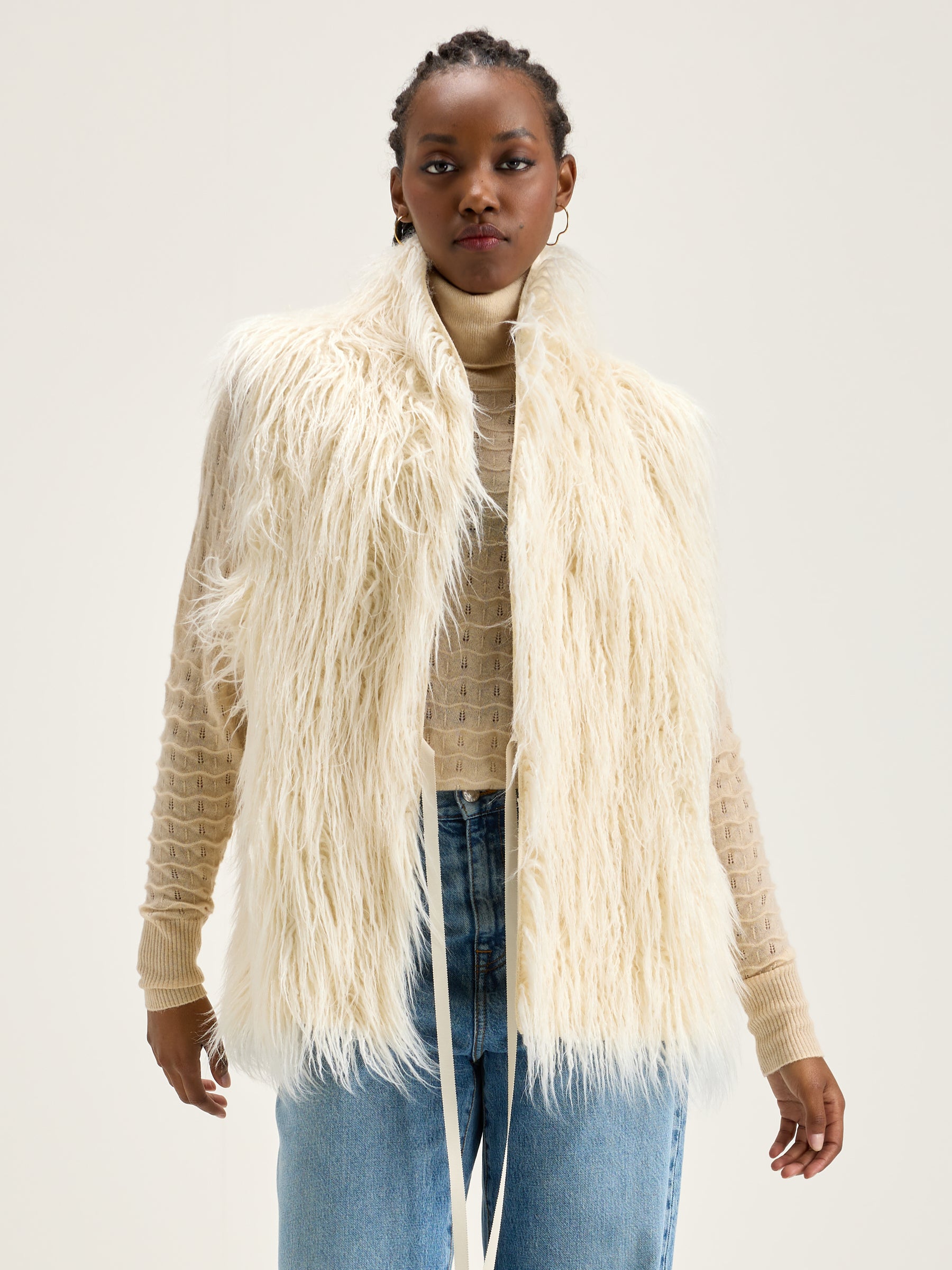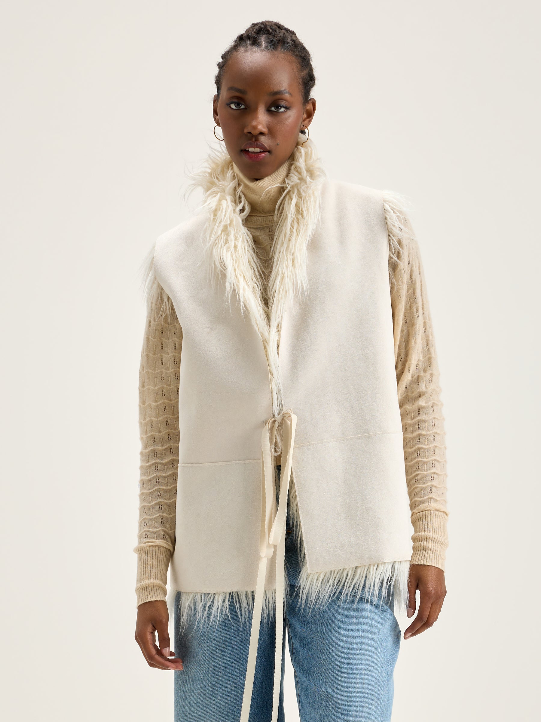 Reversible sleeveless vest with a self-tie belt, made from ecru faux fur on one side and faux suede on the other.