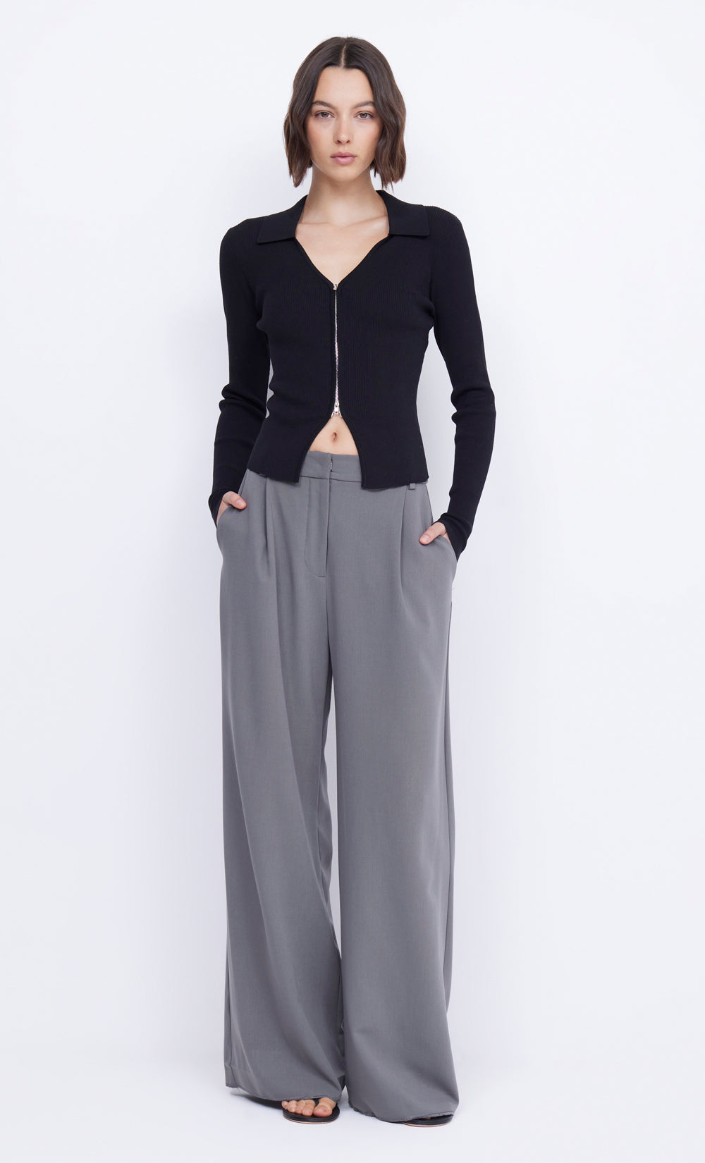 Crafted from a ribbed knit fabric, the Kelilah Cardigan features a v-neck and centre front zip closure with a collar. Hem finishes at low waist for a flattering cropped look. Styled with our Marissa Straight Leg Pant.