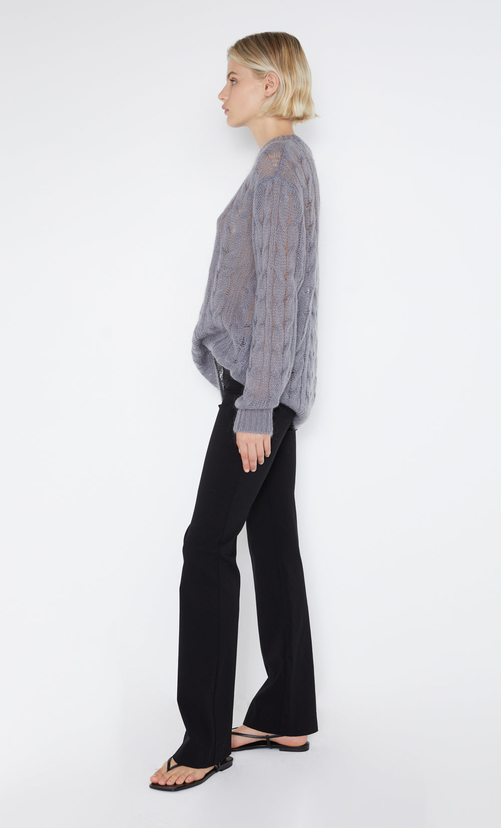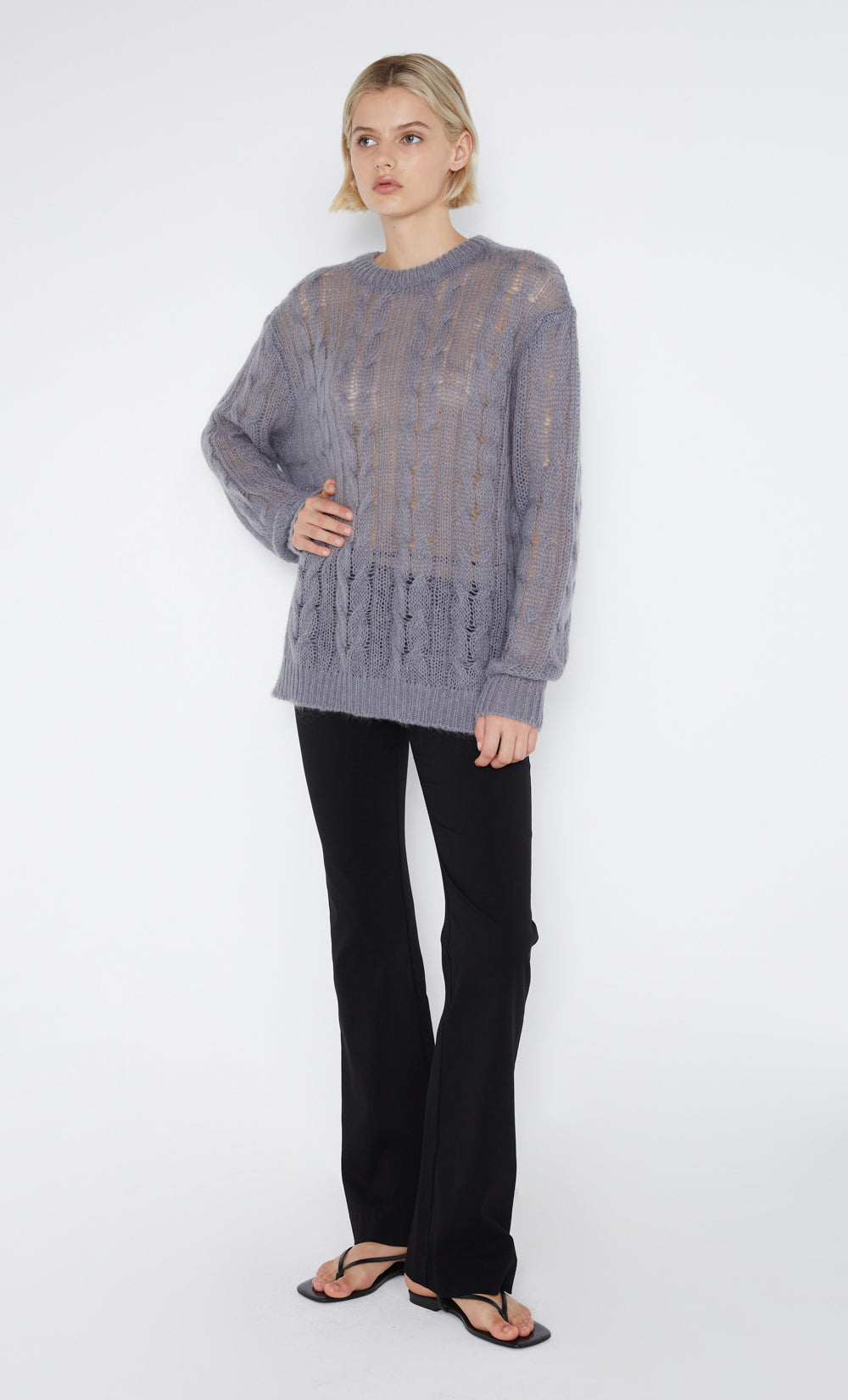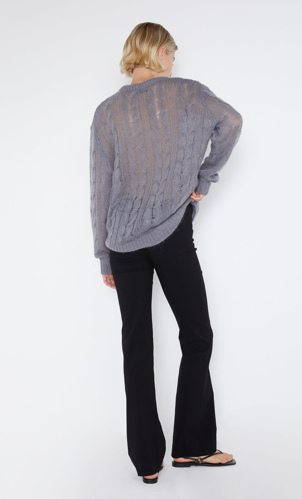 The Kiko Jumper is crafted from a slightly sheer, cable knit fabric in a relaxed silhouette. The easy-to-wear knit features dropped shoulder detailing. Styled with the Harmony Asym Pant.