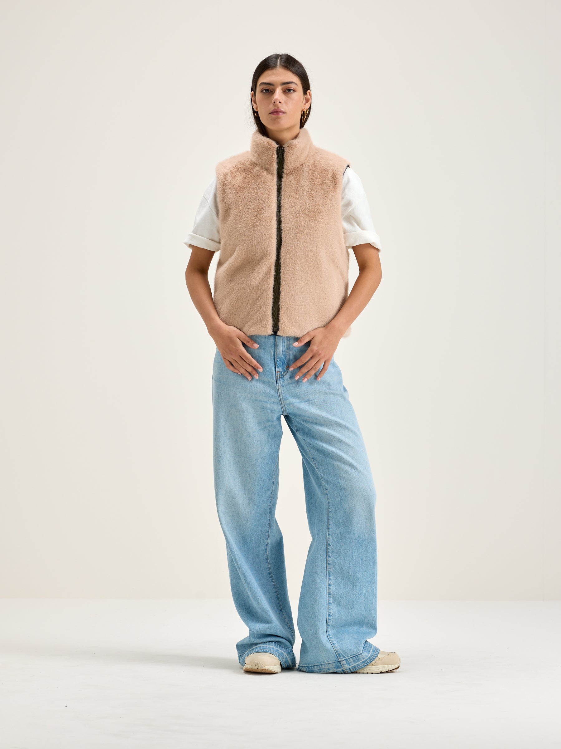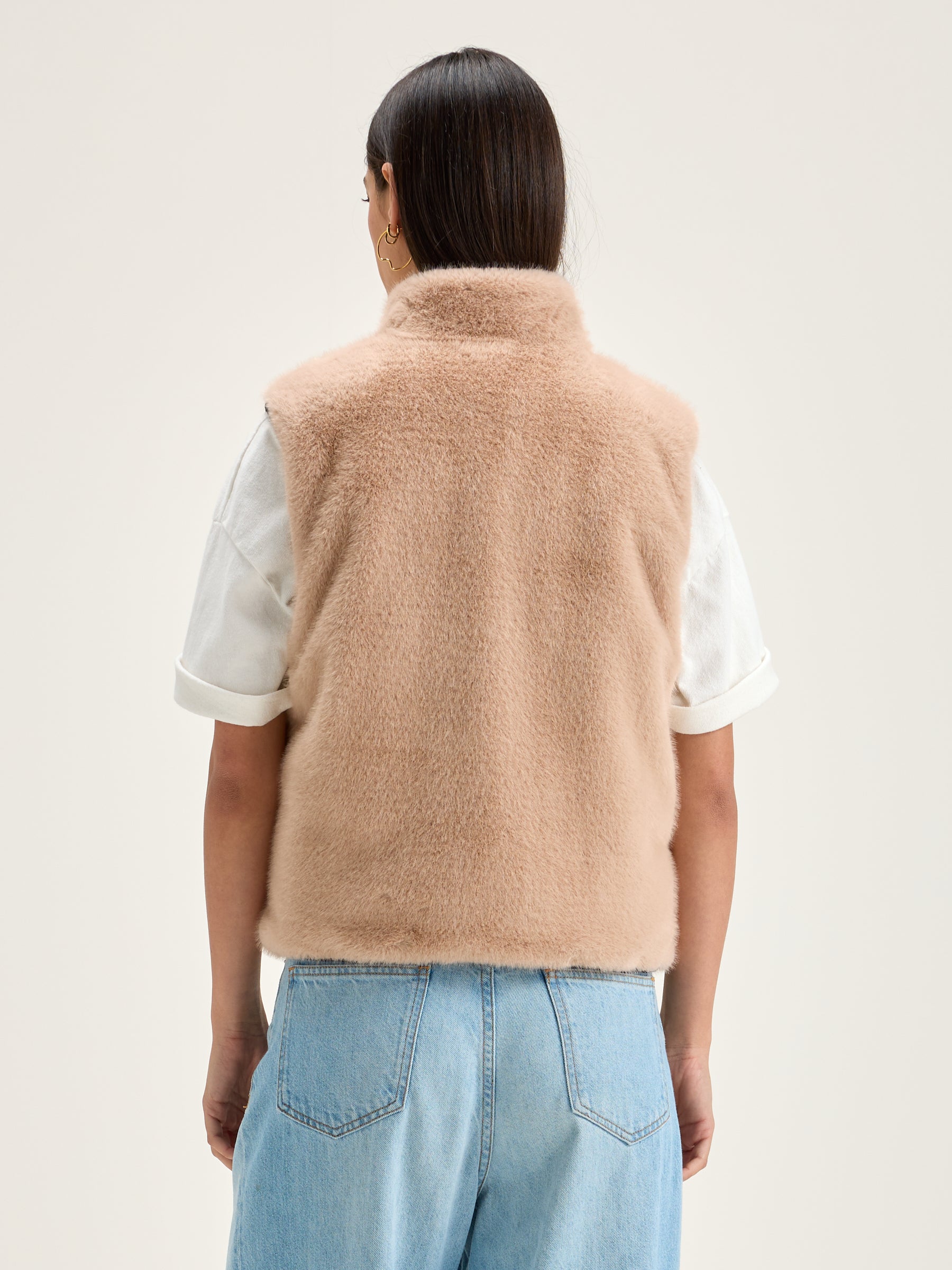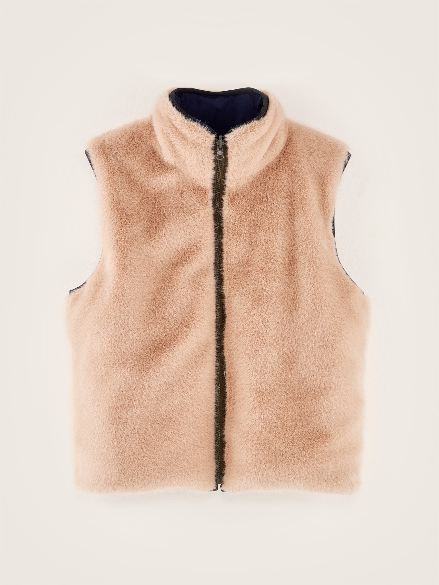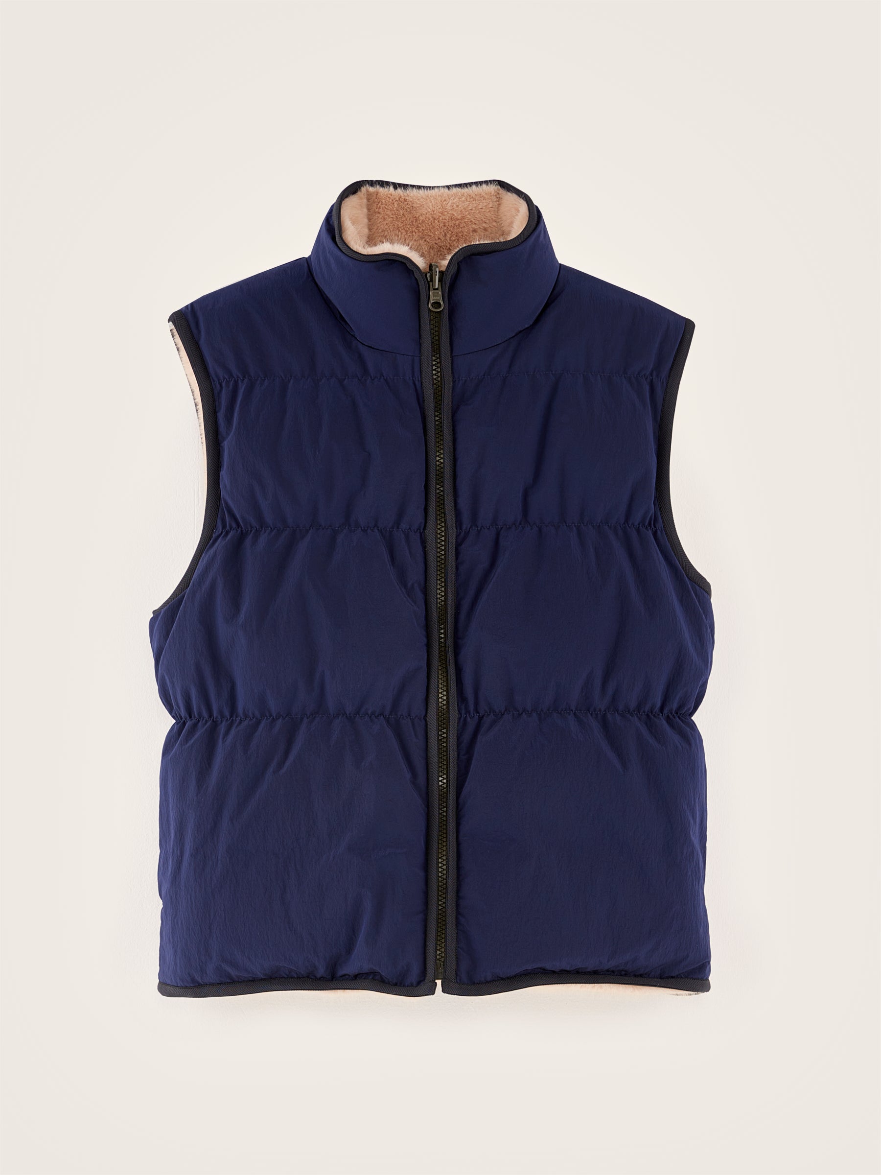 Navy blue reversible zip-front bodywarmer with a light pink faux fur lining.