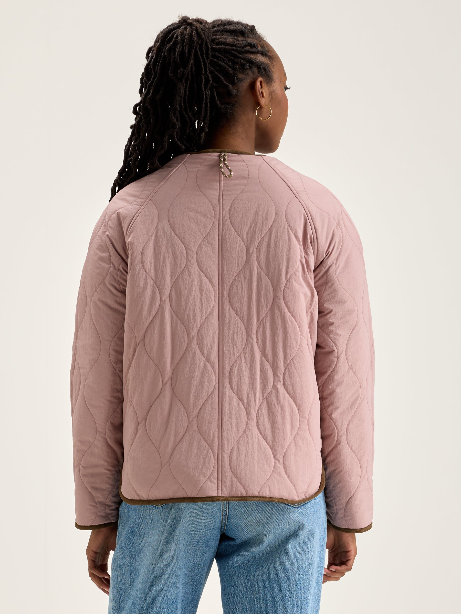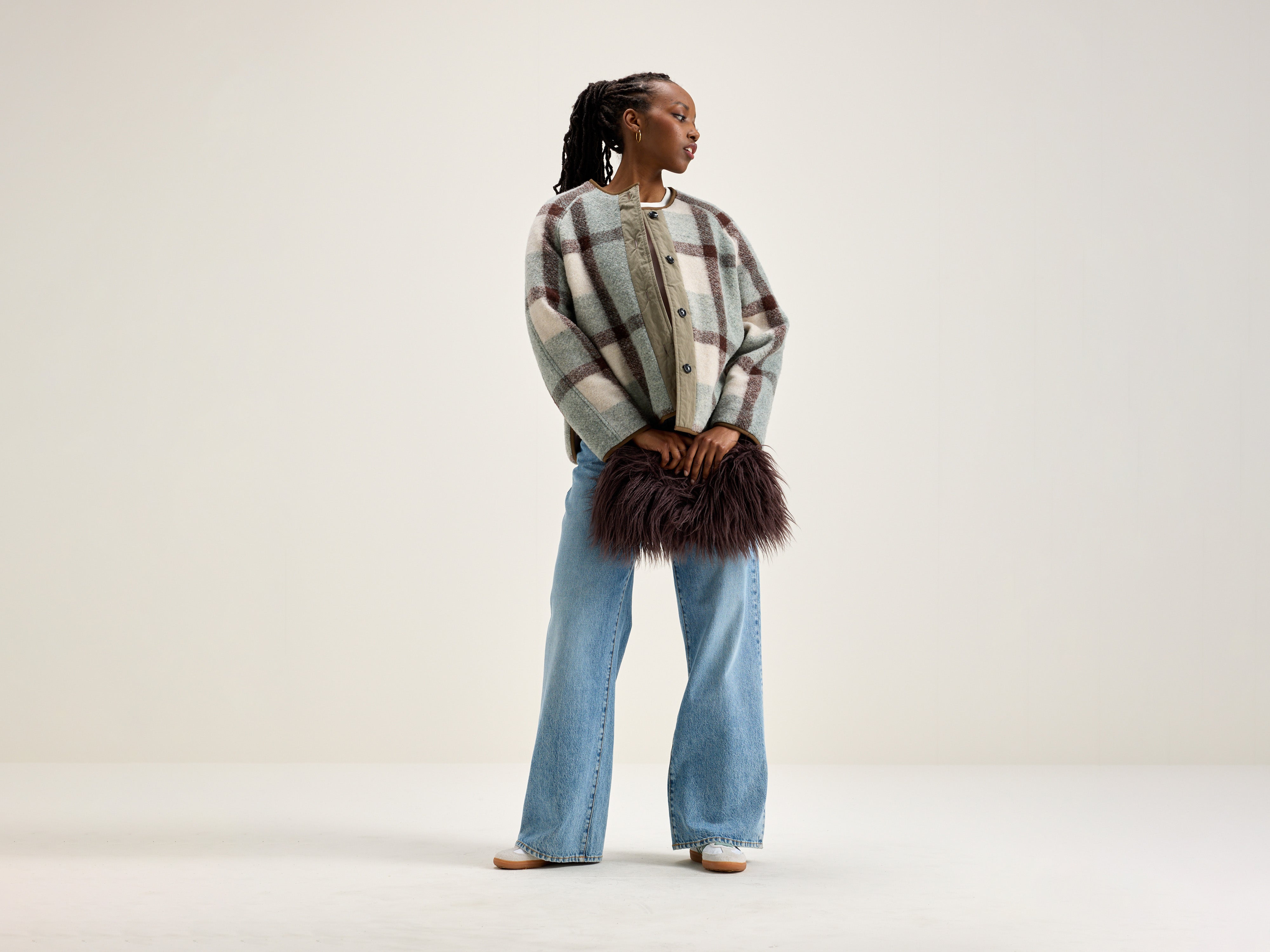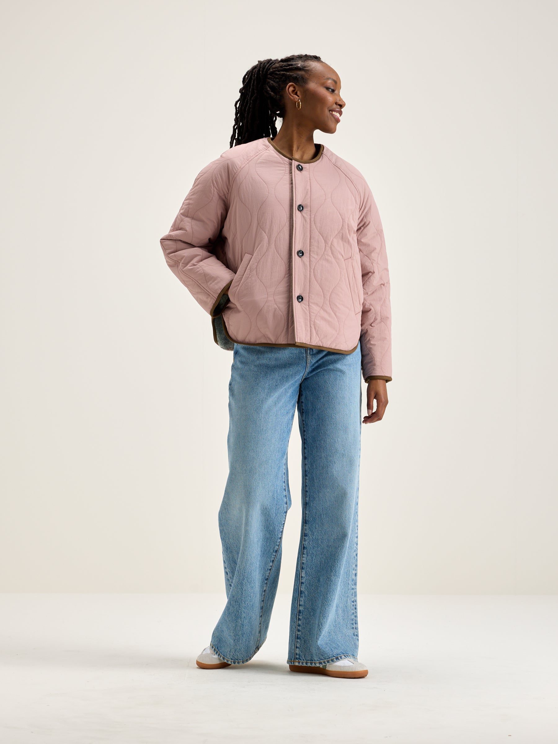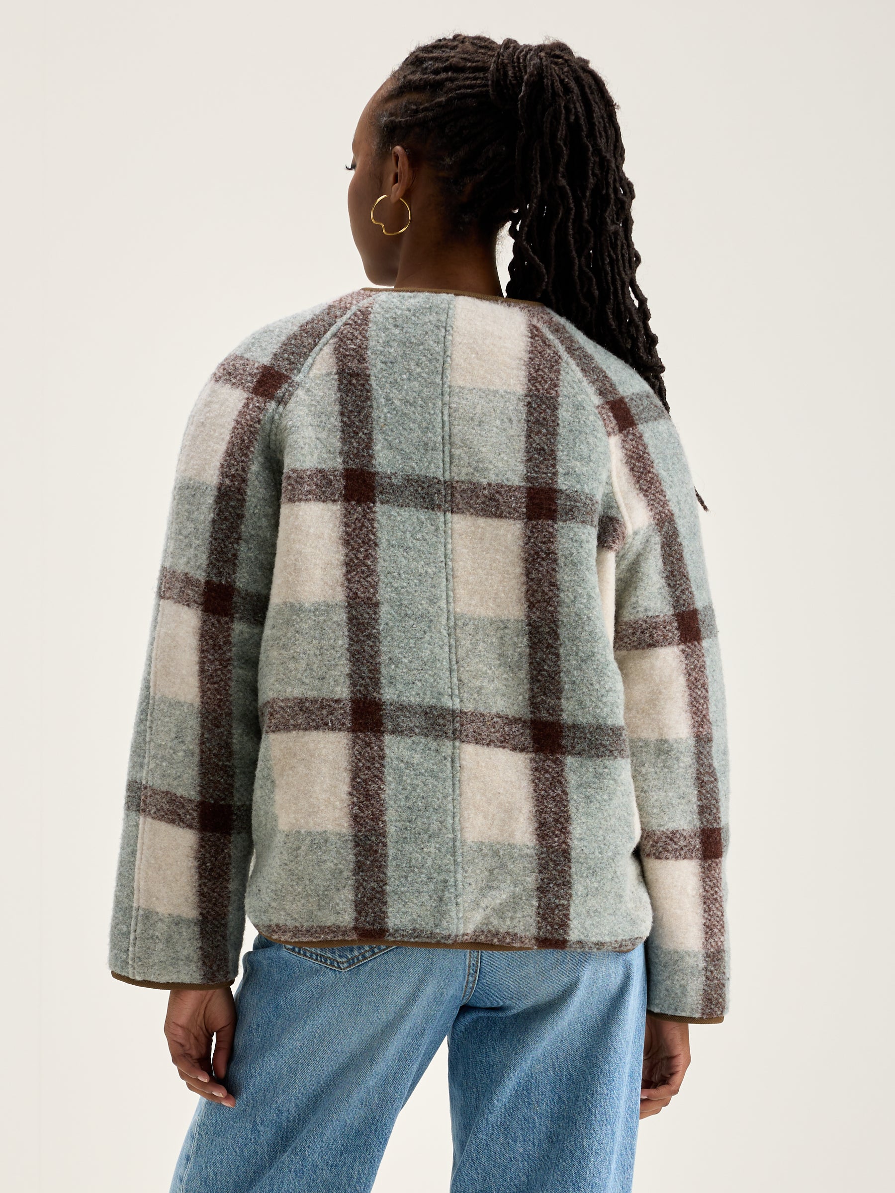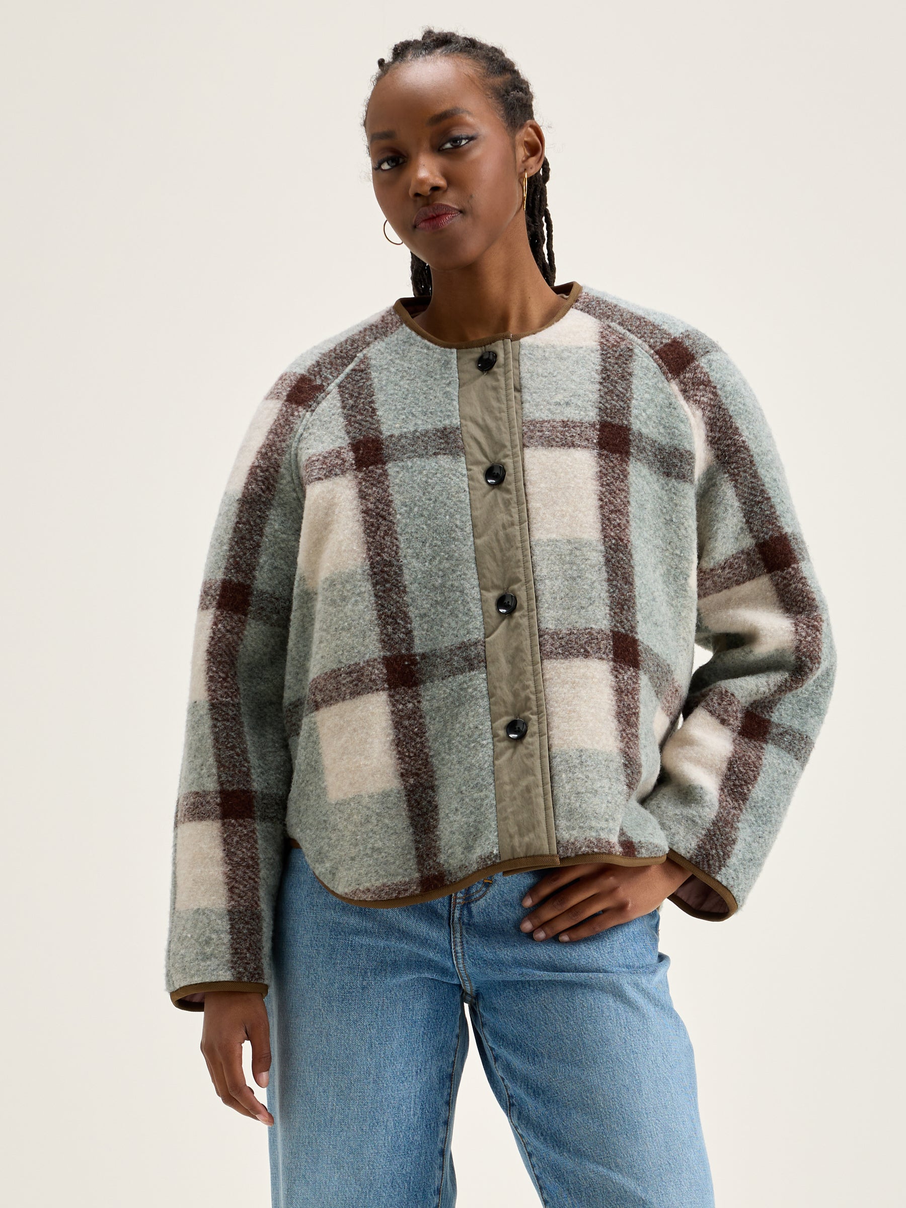 Reversible oversized jacket with raglan sleeves. One side in blush pink ripstop and the other in a checkered wool blend.