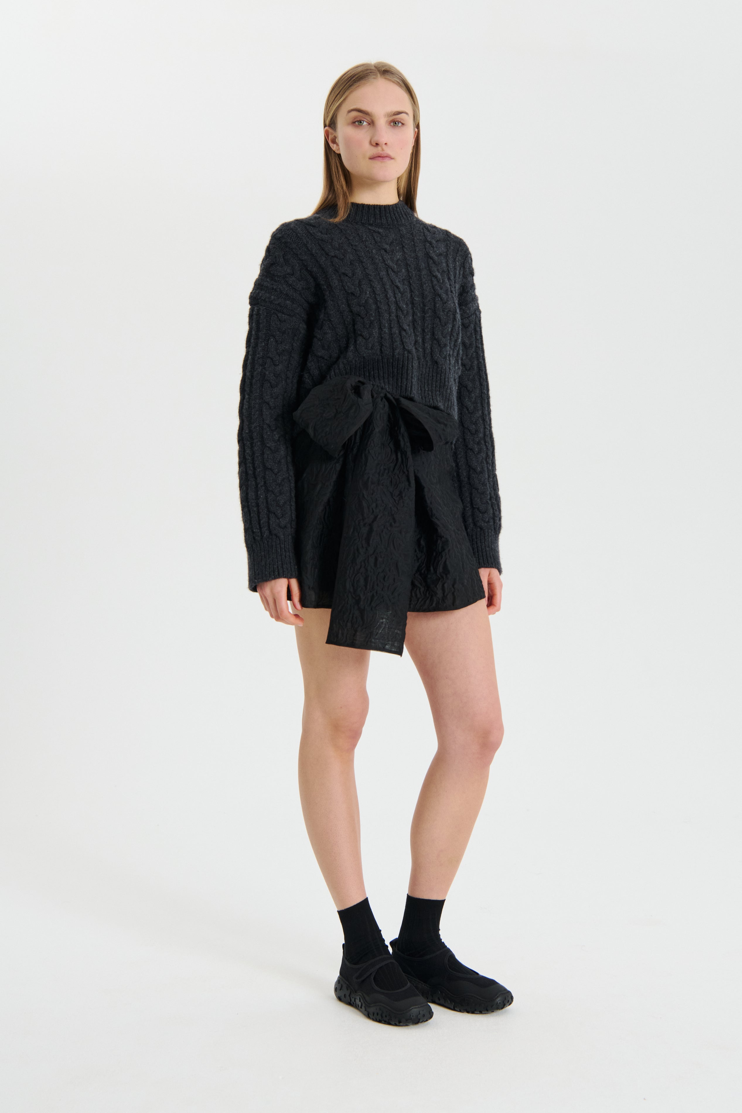 The knitted sweater is a dark gray color with a chunky, cable – knit texture. It features a high – neck design and long sleeves, providing a cozy and stylish look. The sweater pairs well with the black skirt and black shoes, creating a coordinated and fashionable outfit.
