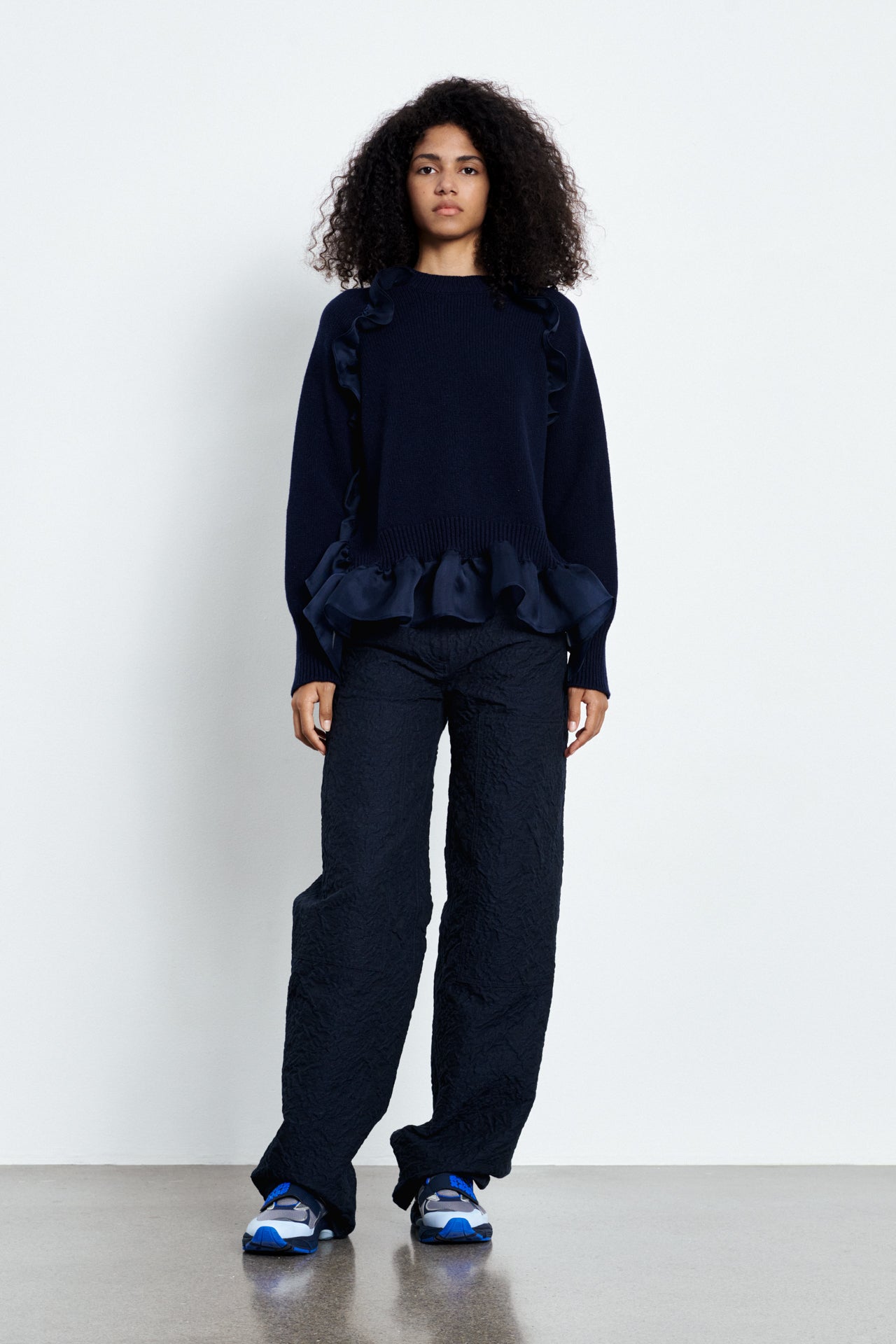 The bottoms are wide – leg, navy – blue pants. They feature a textured, crinkled fabric that adds visual interest. The pants have a relaxed, flowing fit and are paired with blue and white athletic shoes, creating a casual yet stylish look.