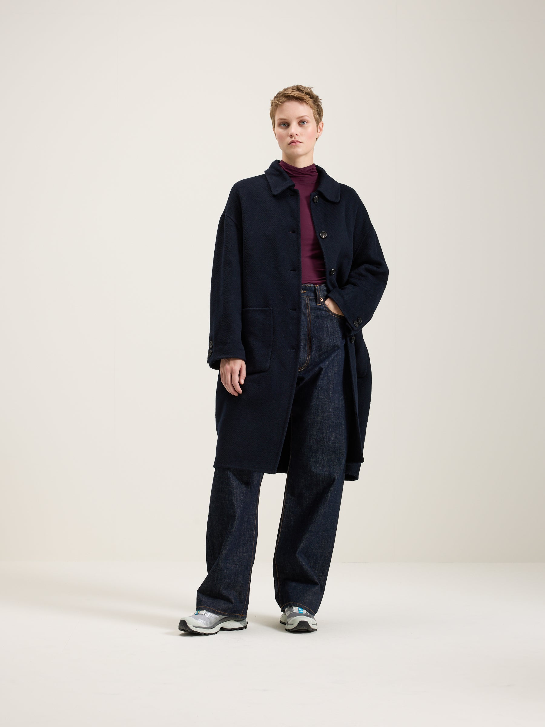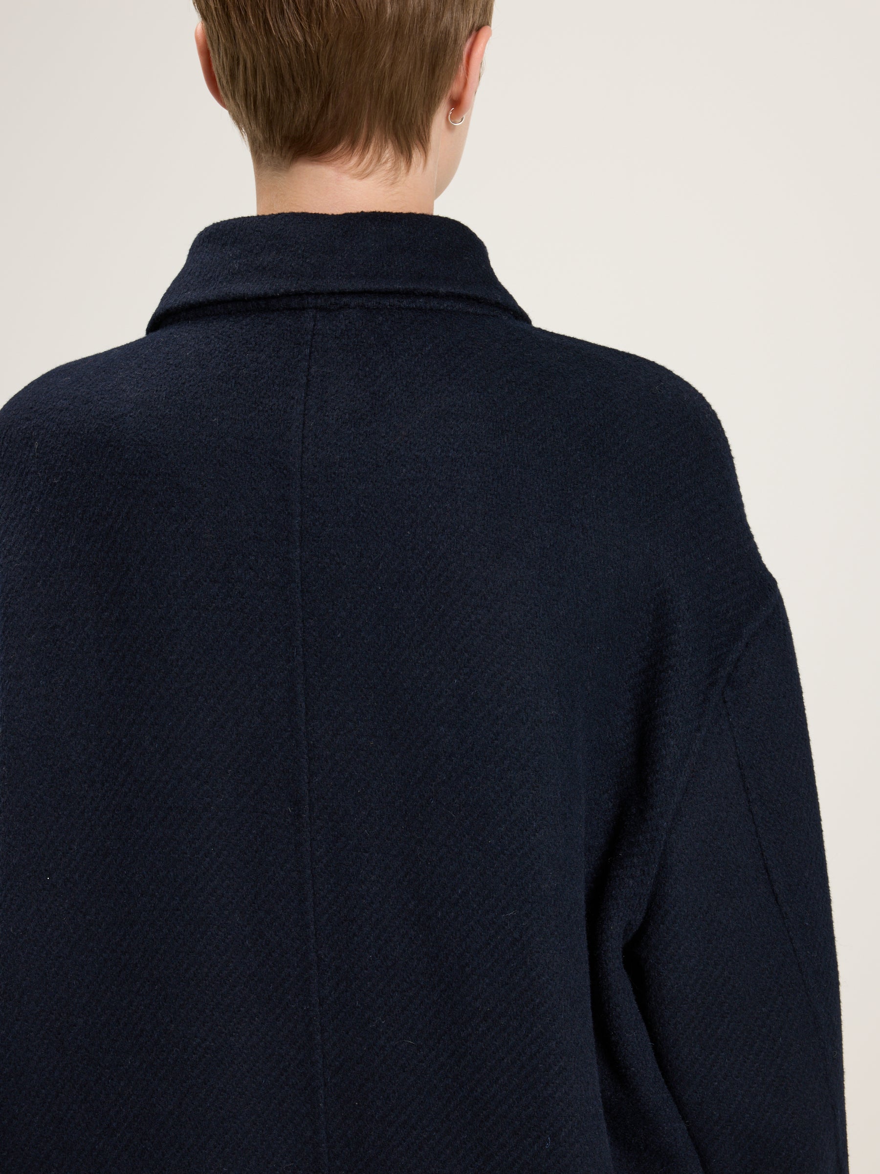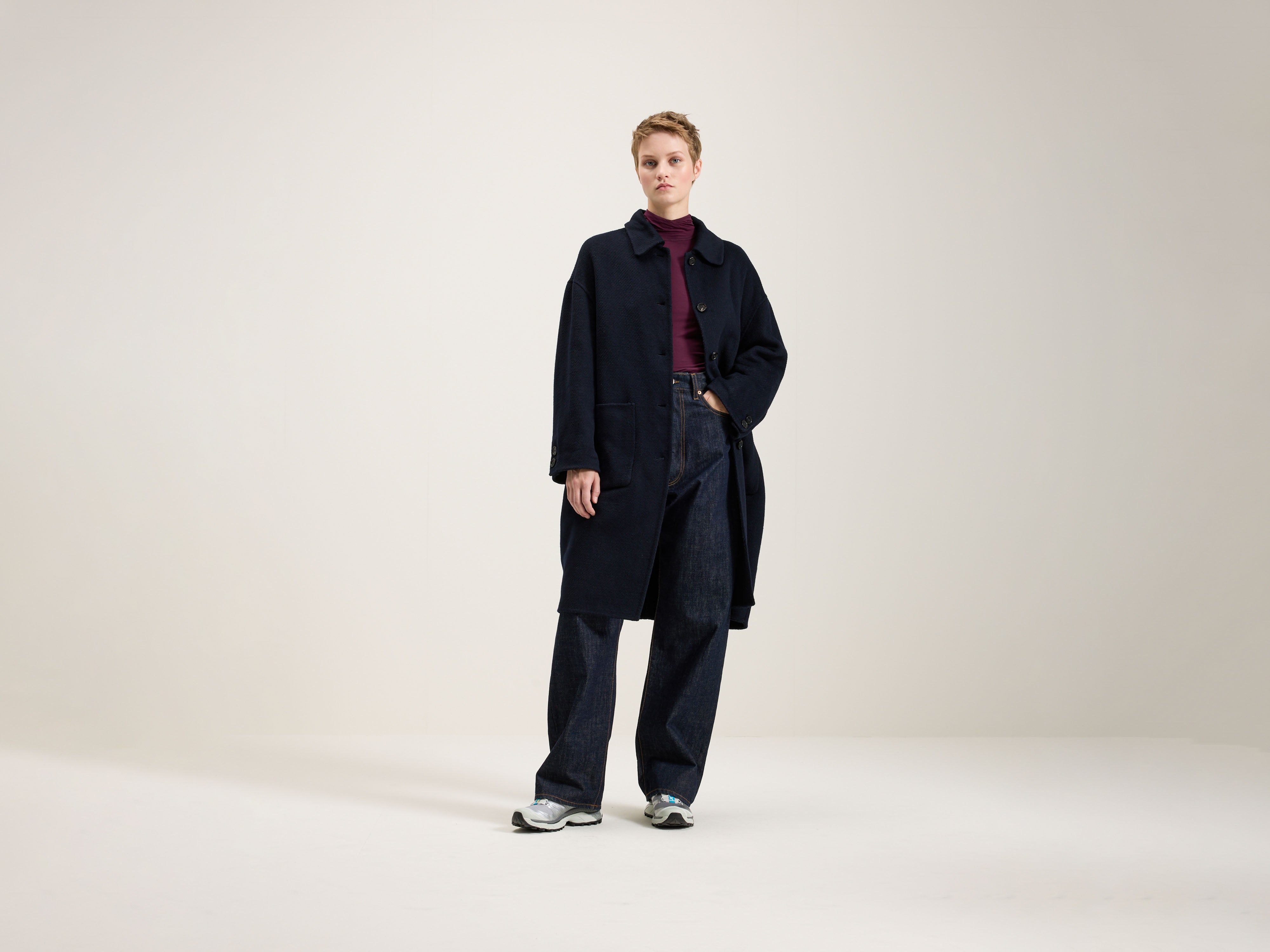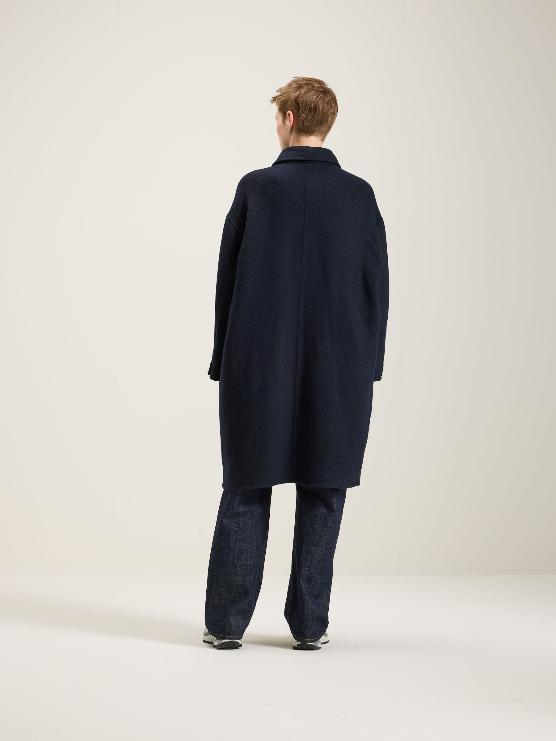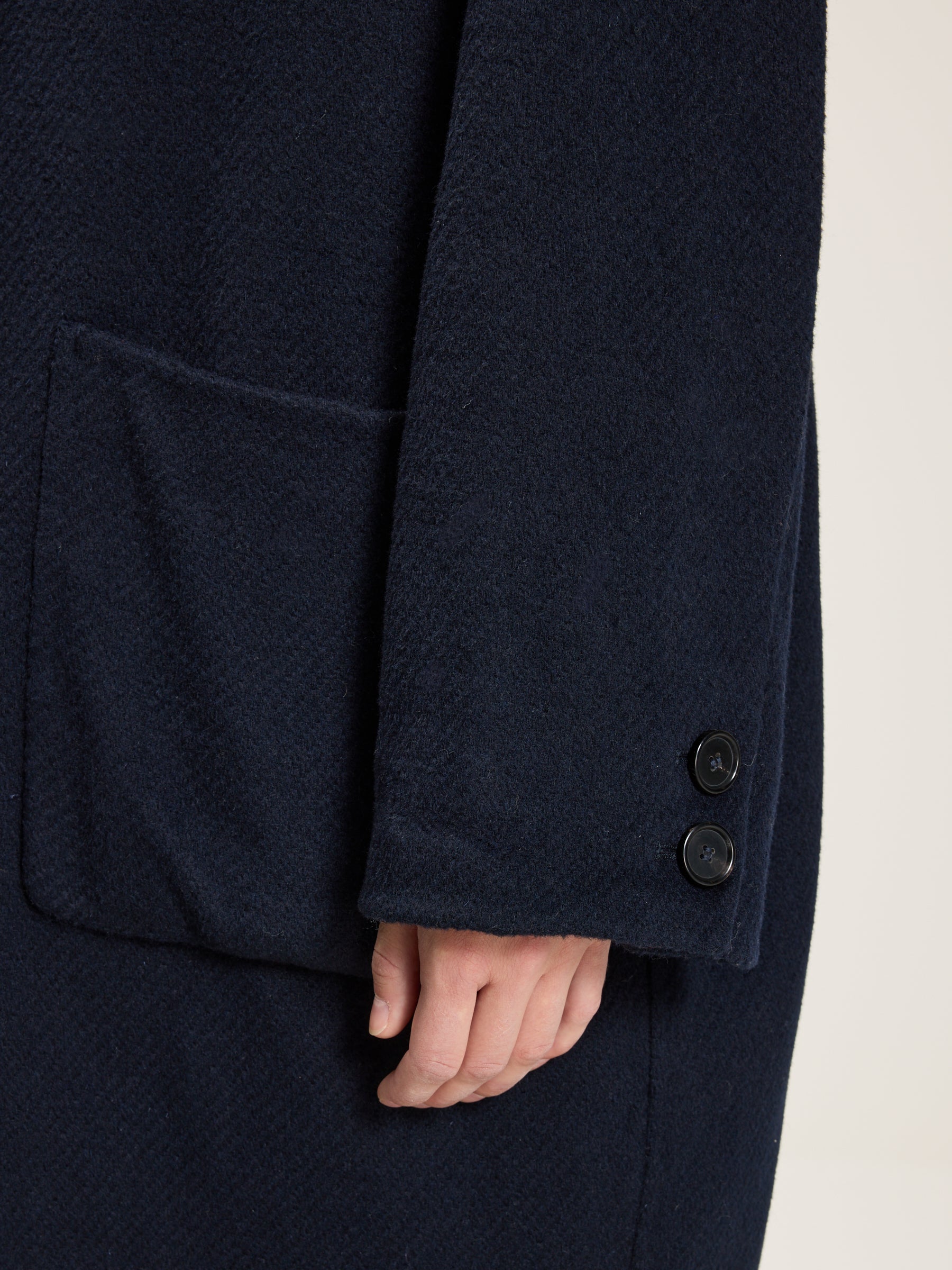 Classic button-front coat in navy blue featuring dropped shoulders and patched pockets.