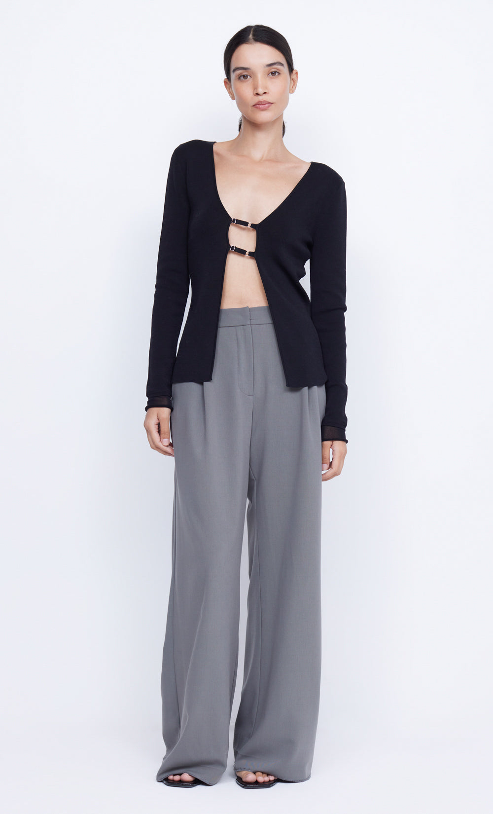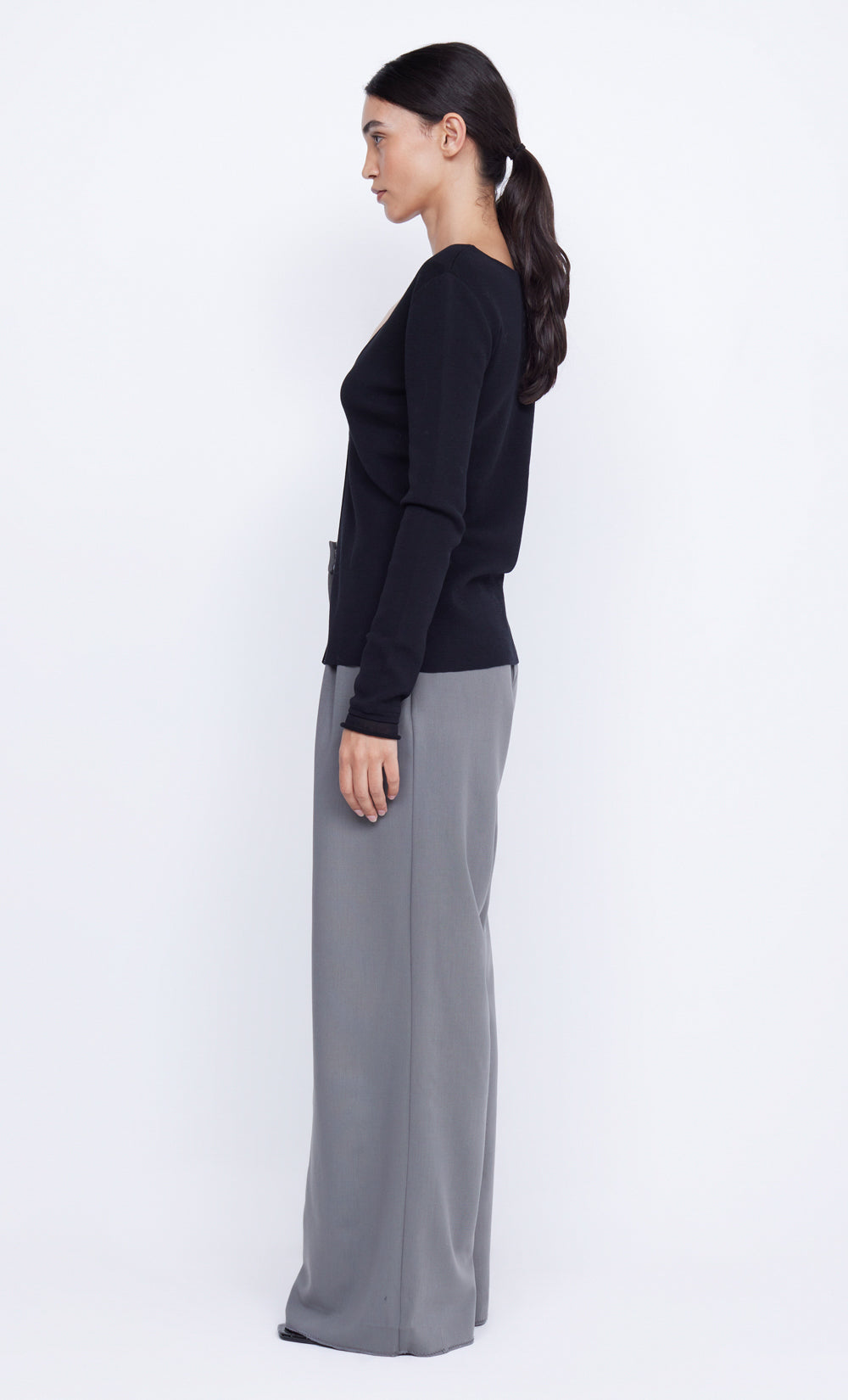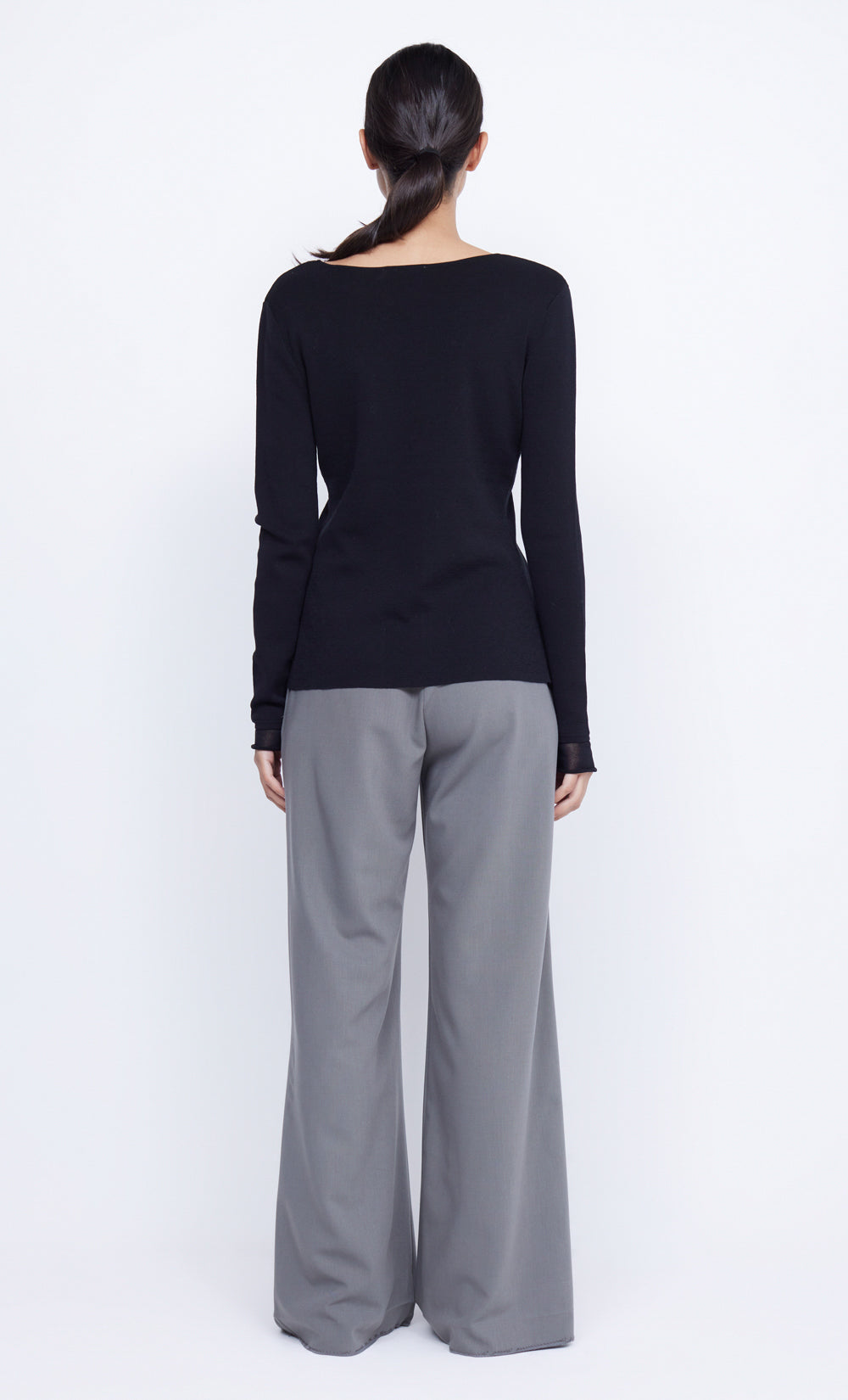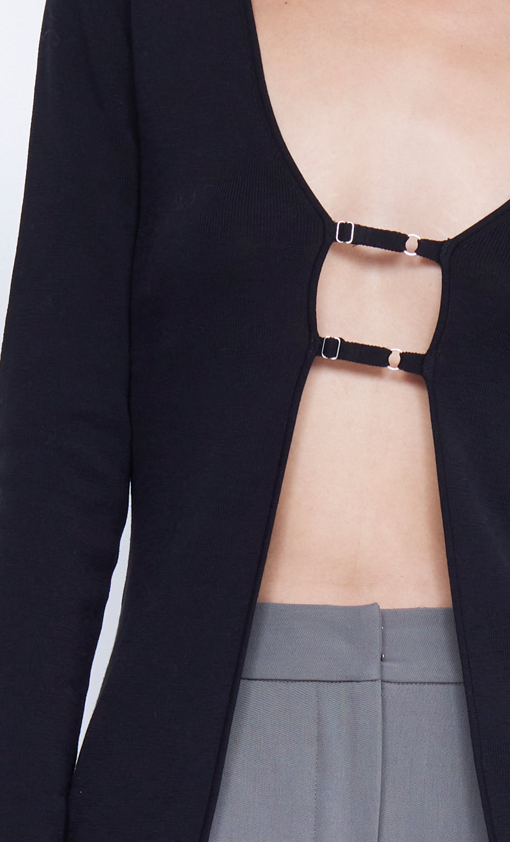 The Miya Long Sleeve Top features a deep v-neckline, open center front and secured by two adjustable rouleau straps.
