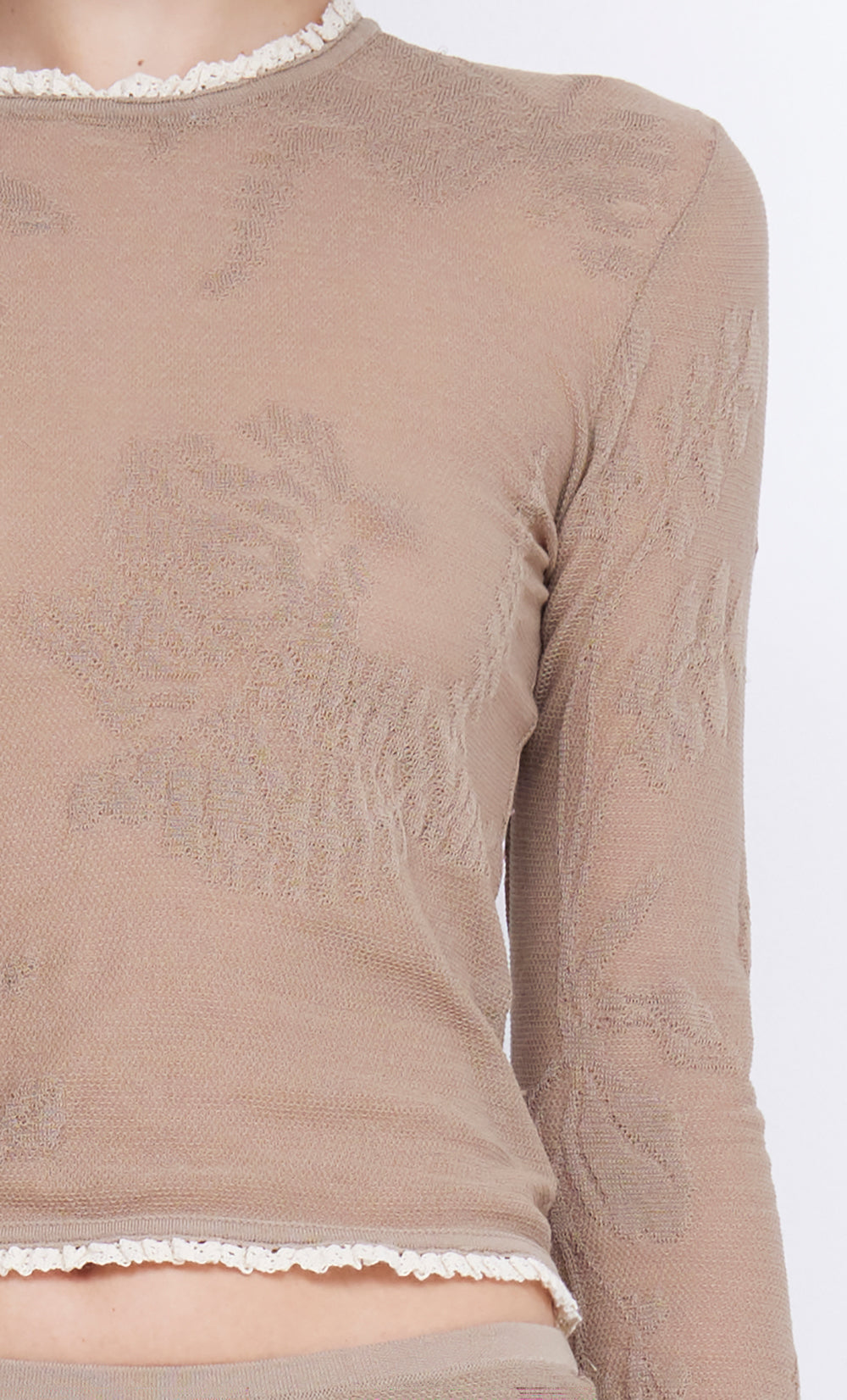 The Nana Top is crafted from a semi-sheer knit fabric in a French lingerie style. The long sleeve top features a crew neck in a slightly cropped silhouette. Edges are Finished with contrast ivory trim.