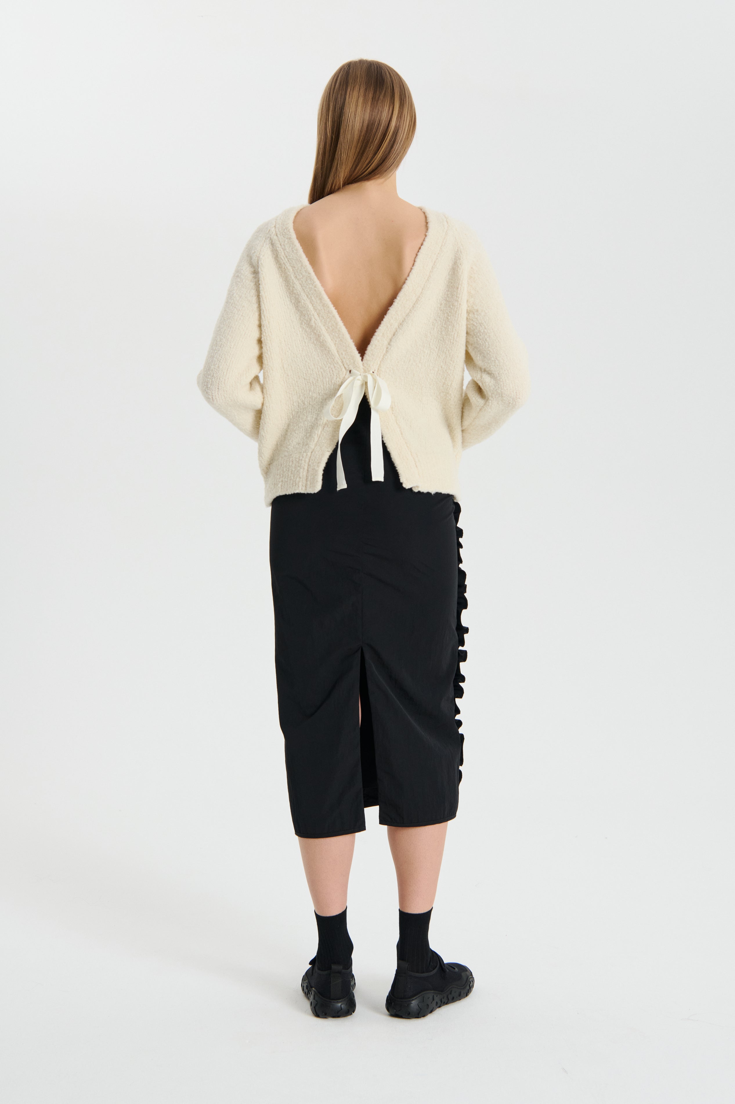 The knitted sweater is a light beige color with a soft, textured appearance. It has long sleeves and a relaxed fit, making it both stylish and comfortable. The sweater pairs well with the black, intricately patterned skirt and the black shoes, creating a cohesive and elegant outfit.