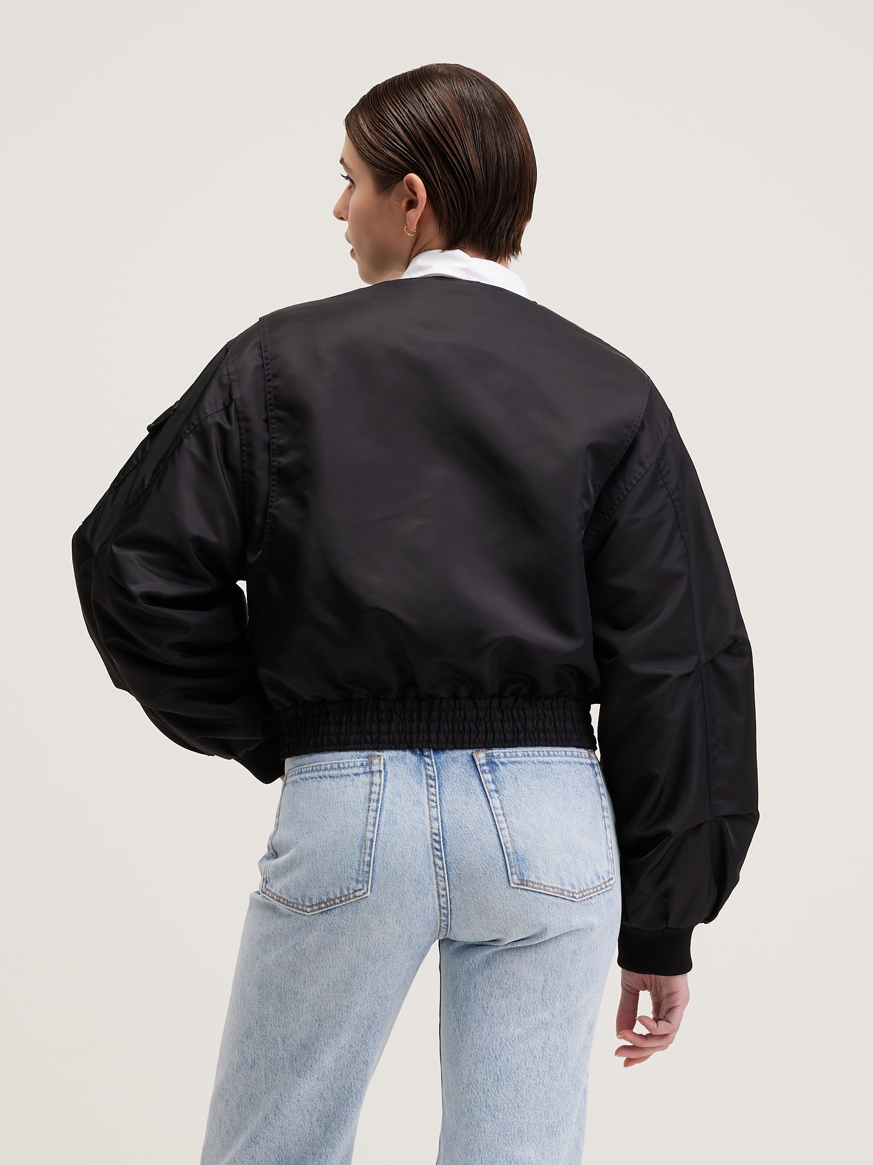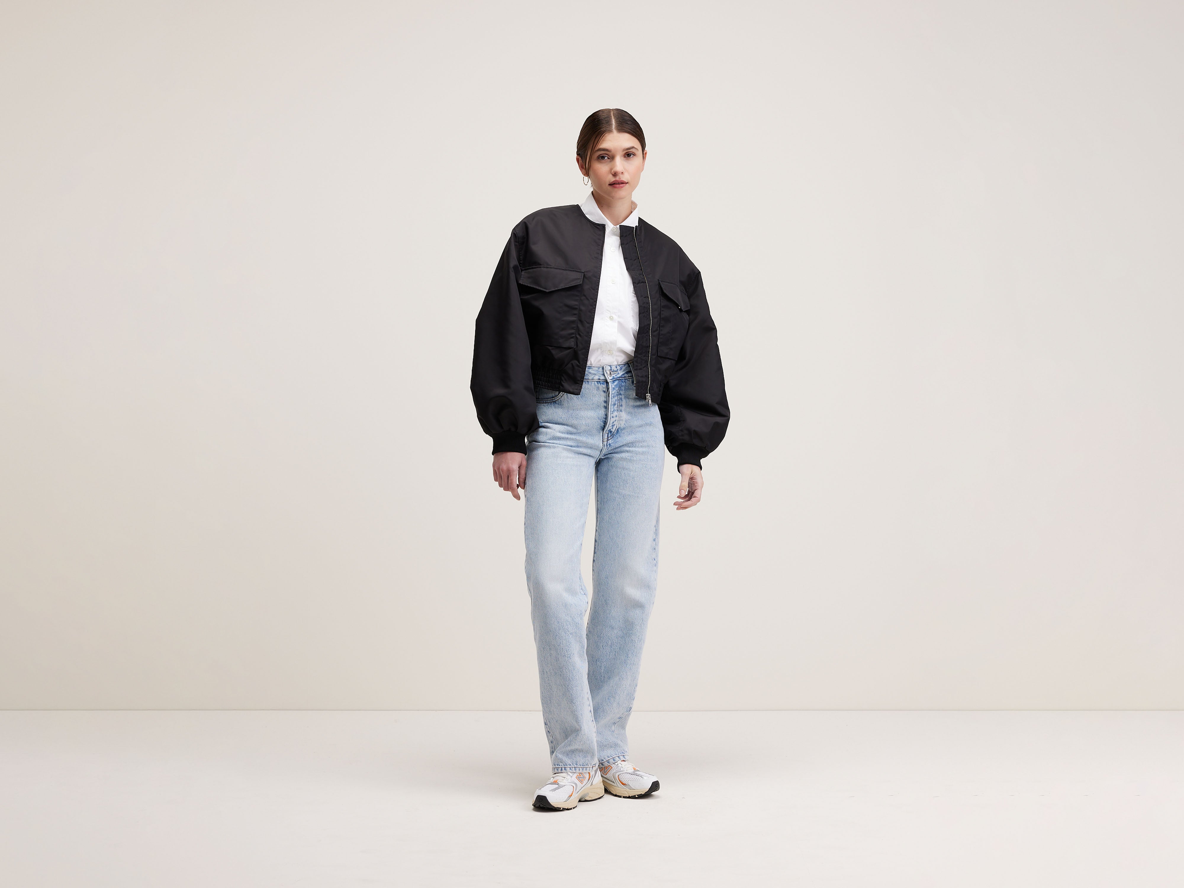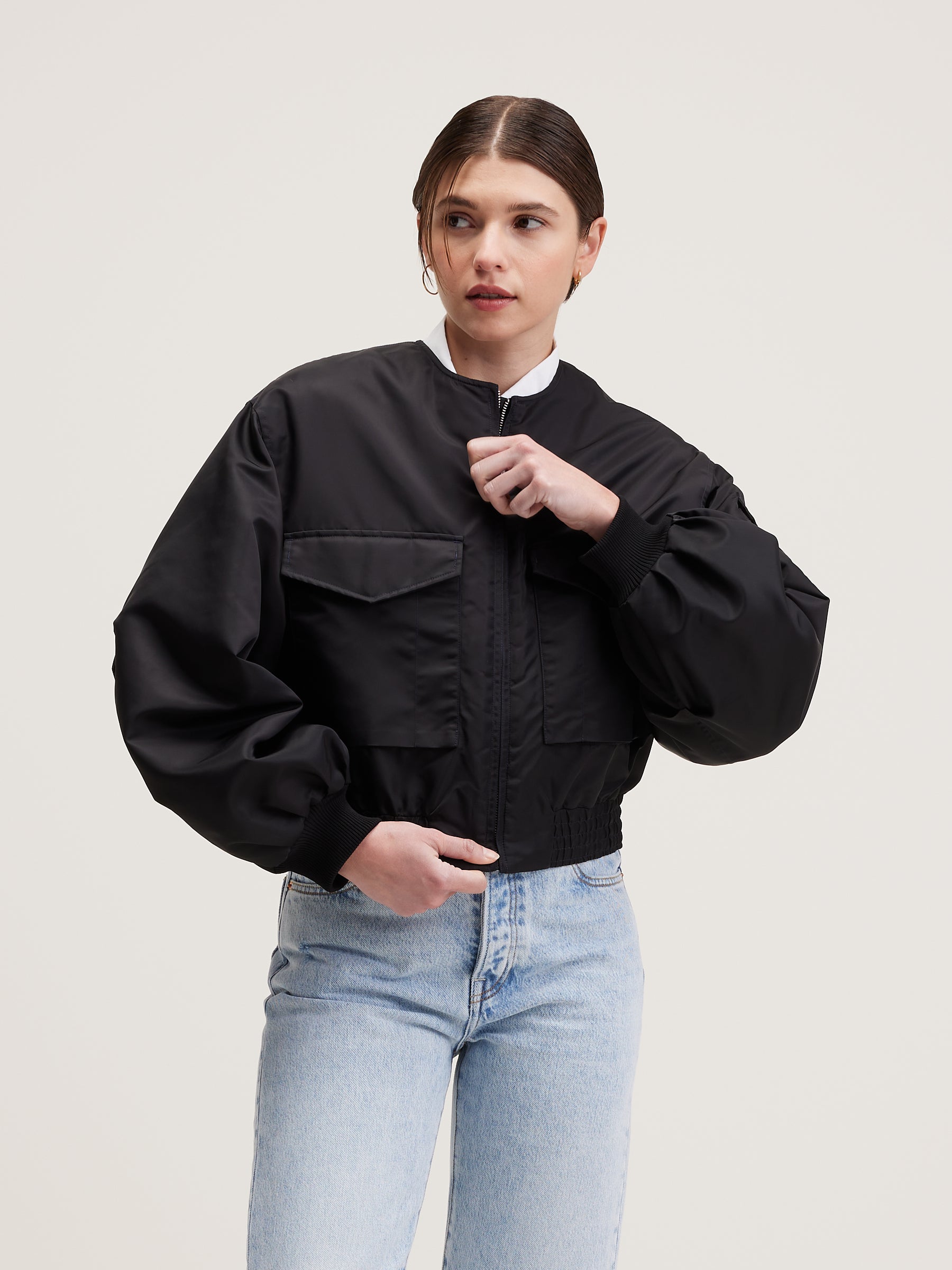 Collarless jacket in off-black canvas with a silver zip fastening.