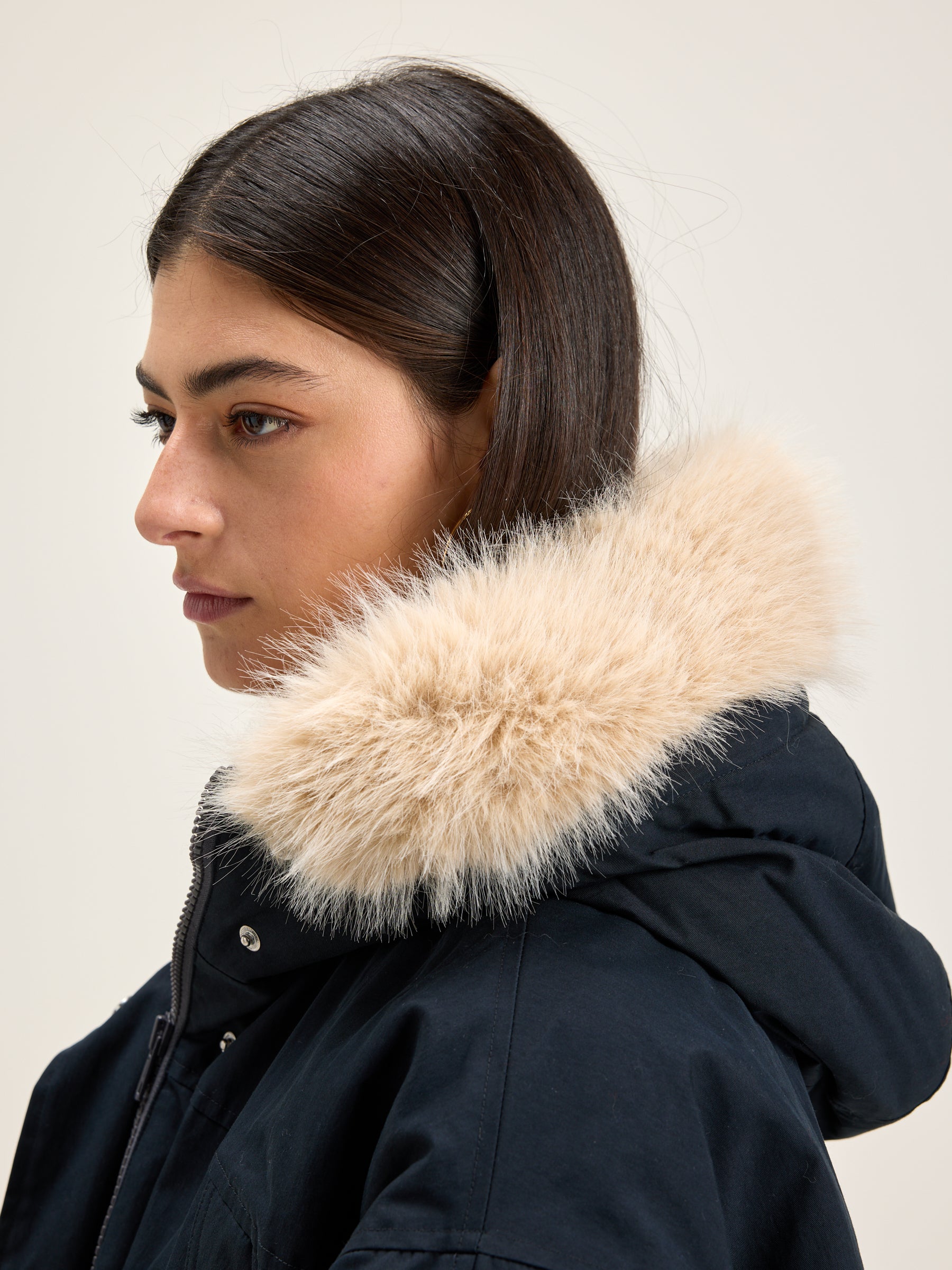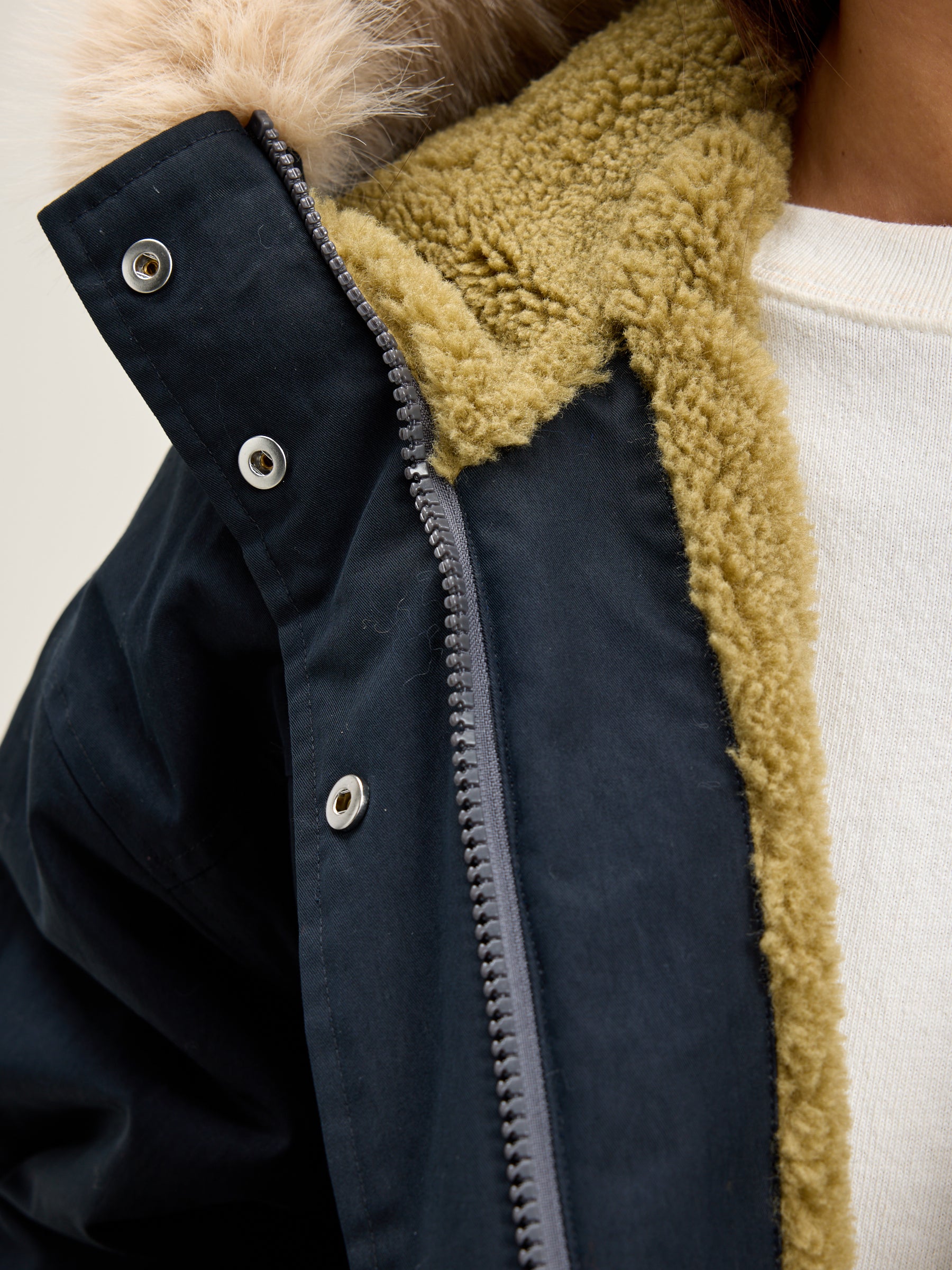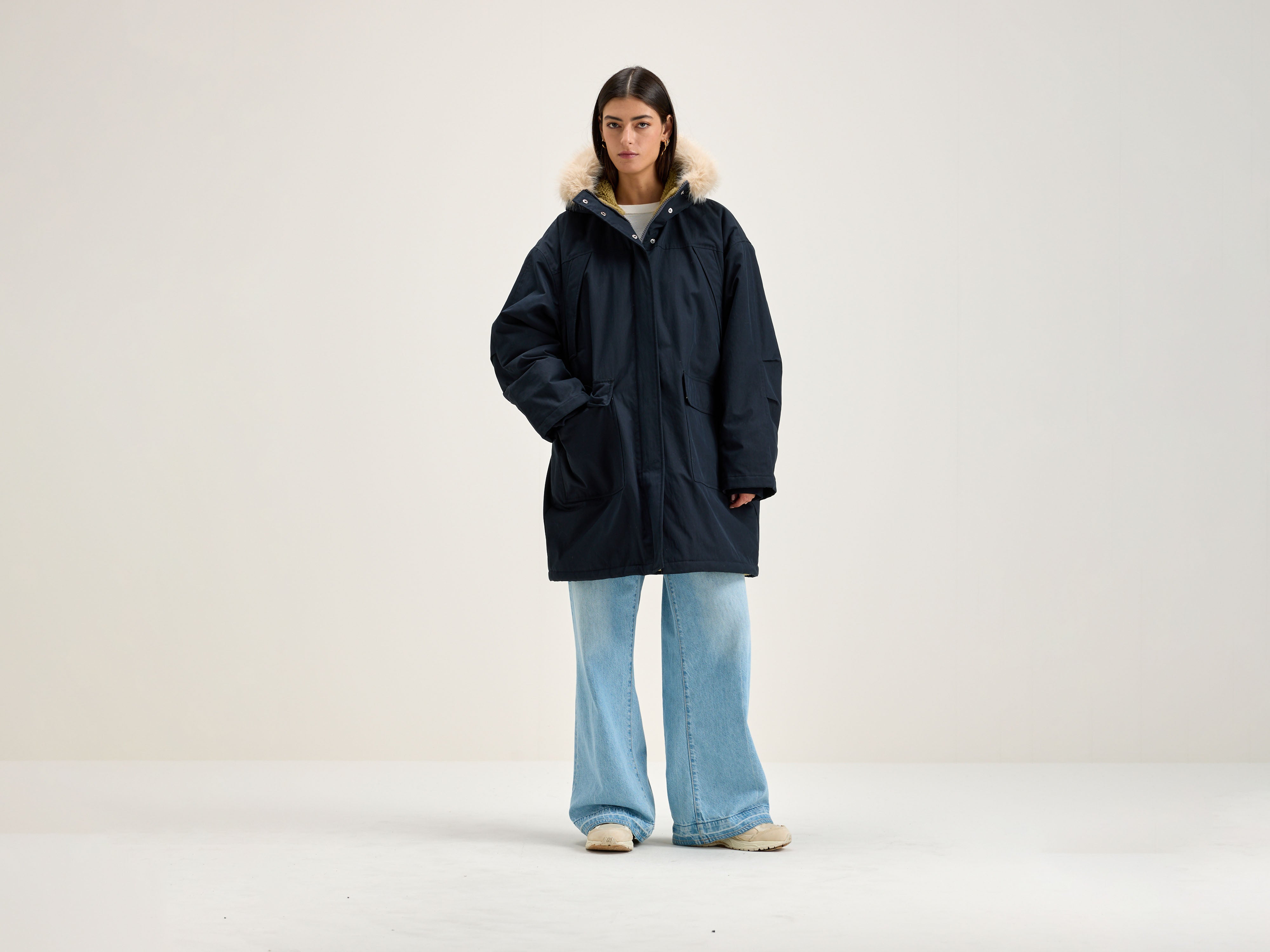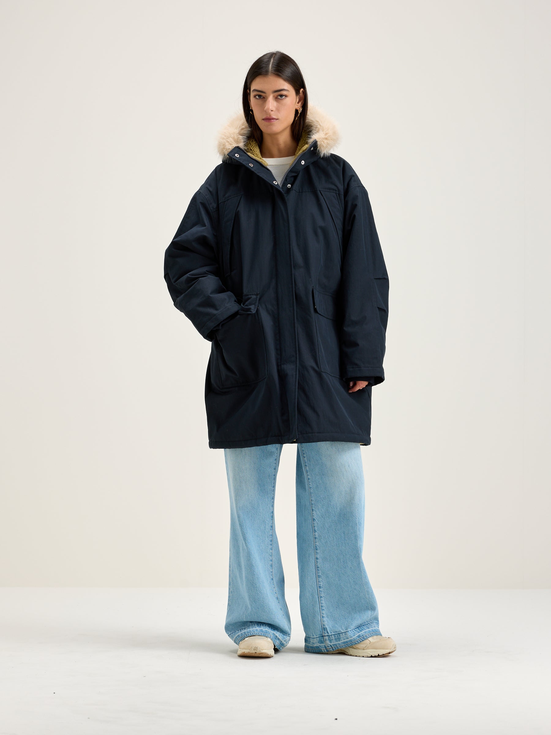 Navy blue duffle coat-style parka with faux fur trimmed hood, voluminous sleeves, ribbed cuffs, and lined with teddy fabric.
