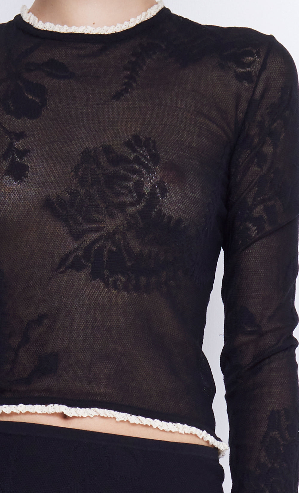 The Peony Knit Top is crafted from a semi-sheer knit fabric in a French lingerie style. The long sleeve top features a crew neck in a slightly cropped silhouette. Edges are Finished with contrast ivory trim.