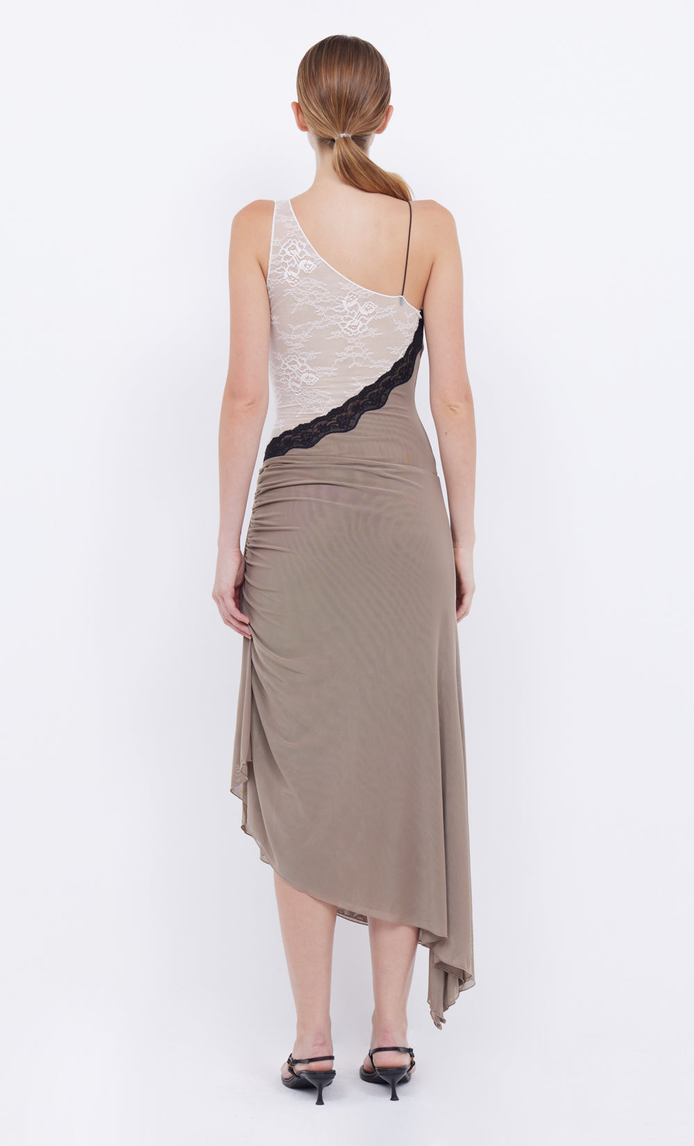The Serenity Dress is crafted from a combination of soft mesh and contrast stretch lace fabrics. The asymmetrical style features a v neckline, contrast black lace trim, mesh lining at the bust and mini skirt and semi sheer through the mid section. The dress is further detailed with a single rouleau strap, soft gathers throughout creating a flattering silhouette and finished with a draping, asymmetrical skirt.