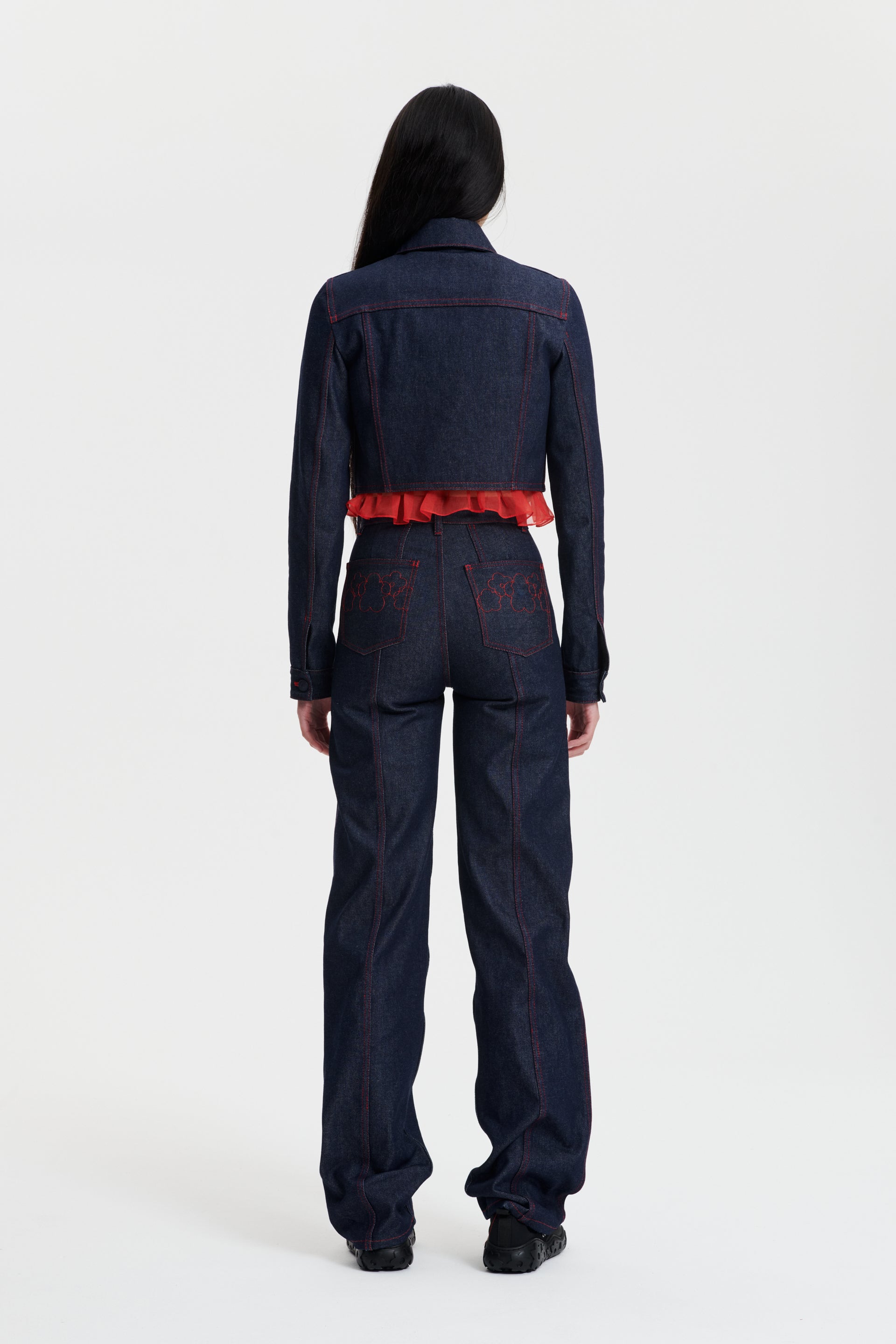 The bottoms are wide – leg, dark – denim jeans. They feature a high – waisted design with visible seaming details and are paired with a dark – denim jacket and black shoes, creating a coordinated and stylish look.