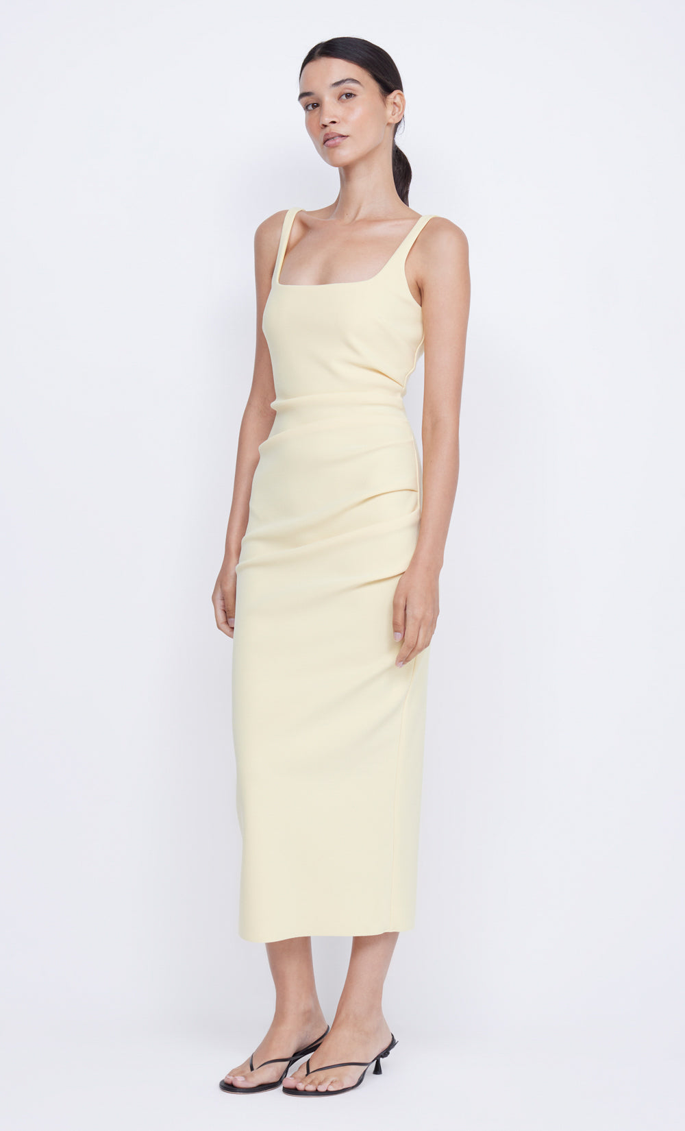 Cut from our signature bonded crepe fabric, the Victoria Midi Dress is a classic style. The midi dress features a square neckline and side tuck detailing, creating a flattering silhouette.