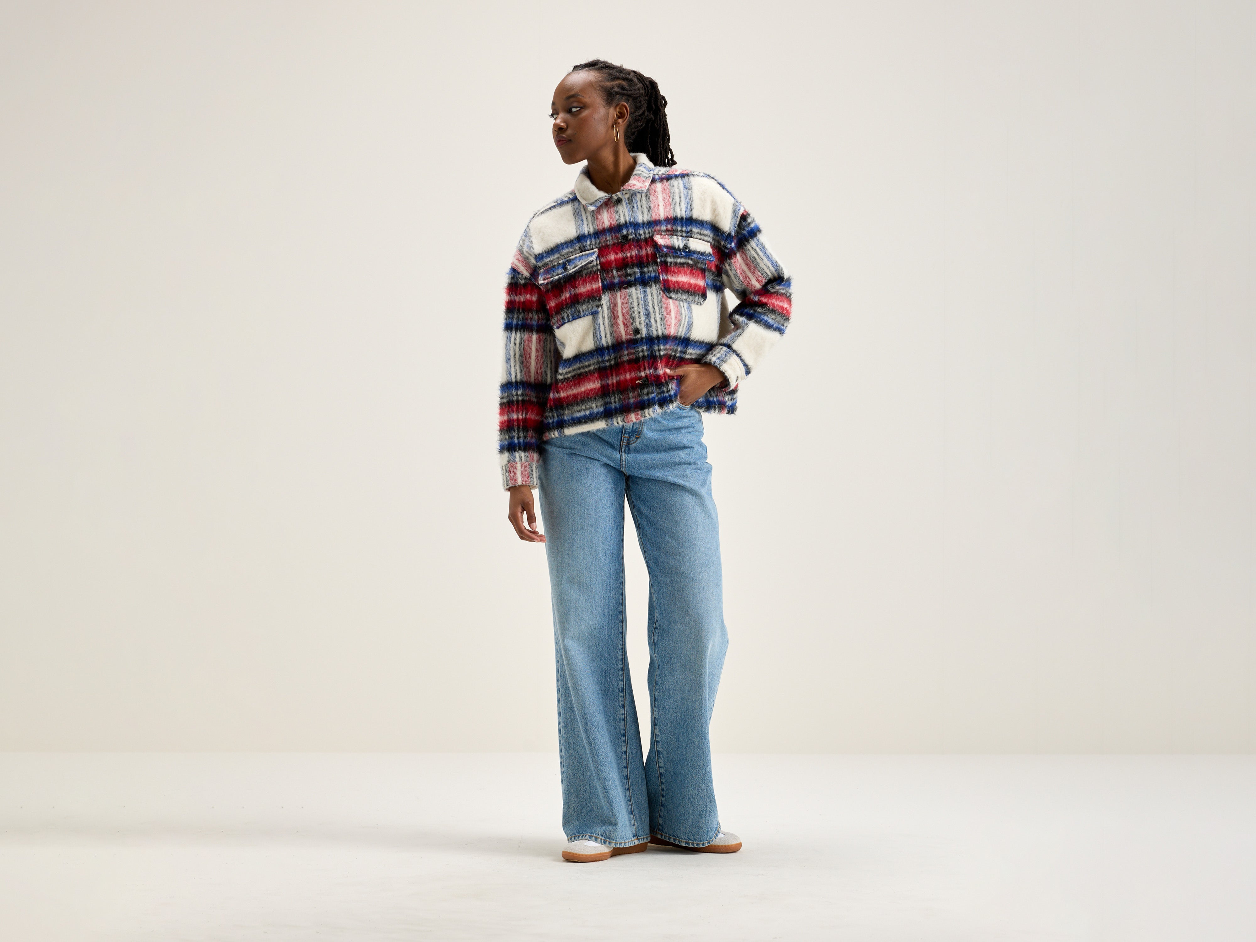 Checkered cotton blouse with gathered pleats and a raised collar.