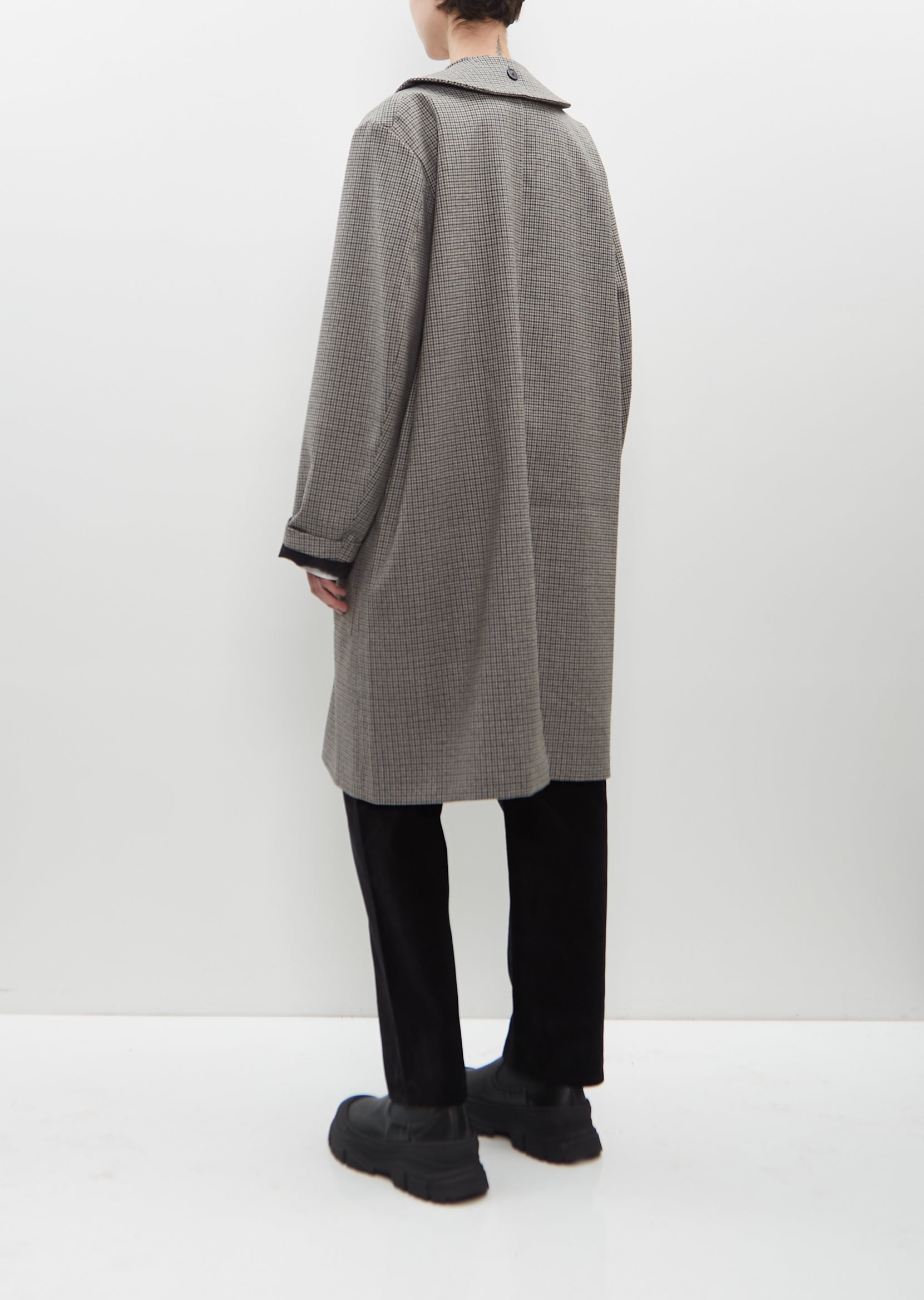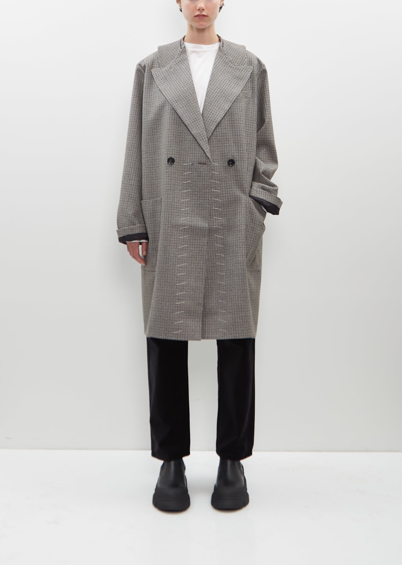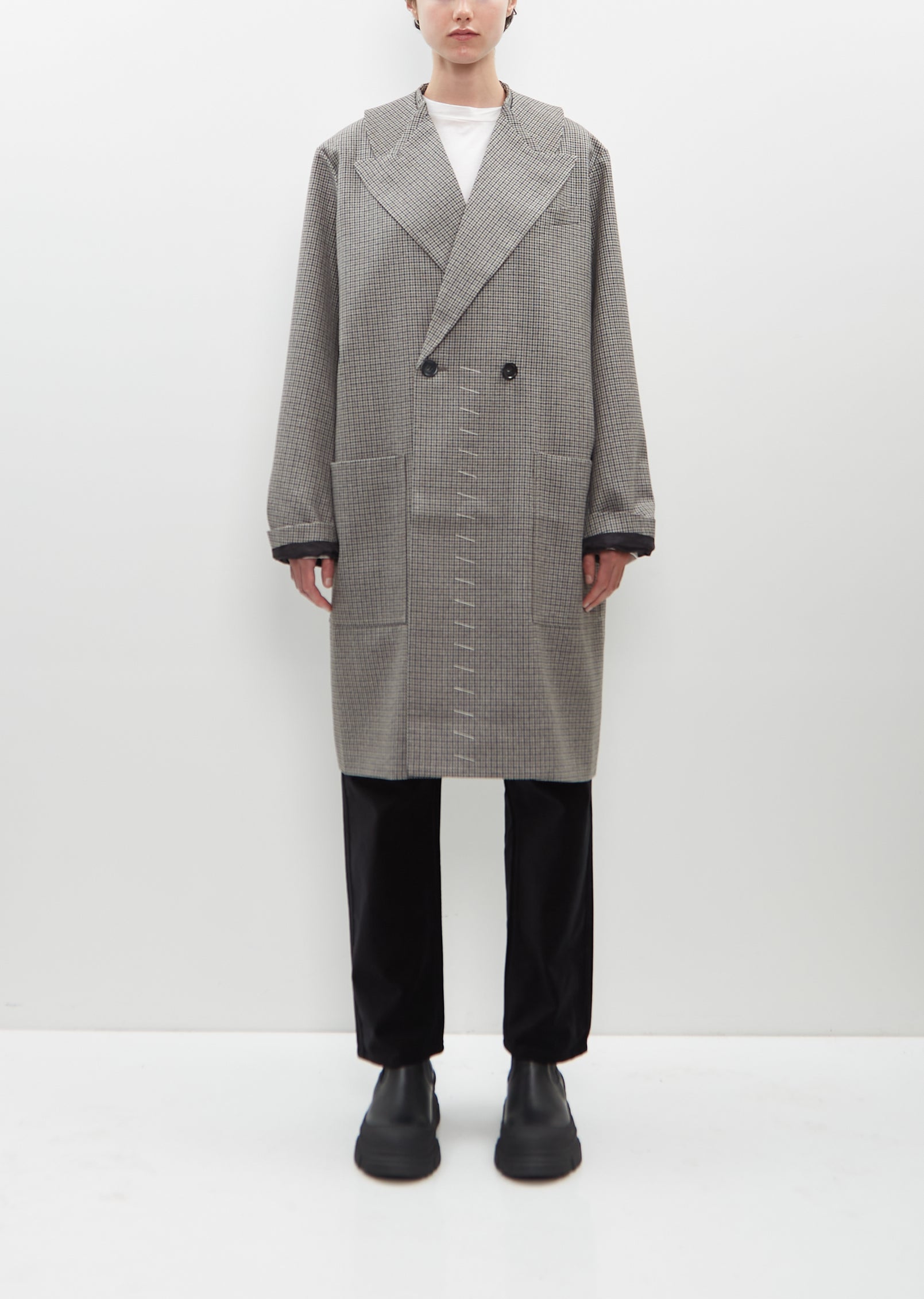 Yara double-breasted coat with peak lapels and a detachable collar in wool with a houndstooth pattern. Features a single chest welt pocket, two deep patch pockets at front, a single vent at back and a buttons closure at front. Finished with horn-hued buttons throughout. Partially lined in black satin fabric.
