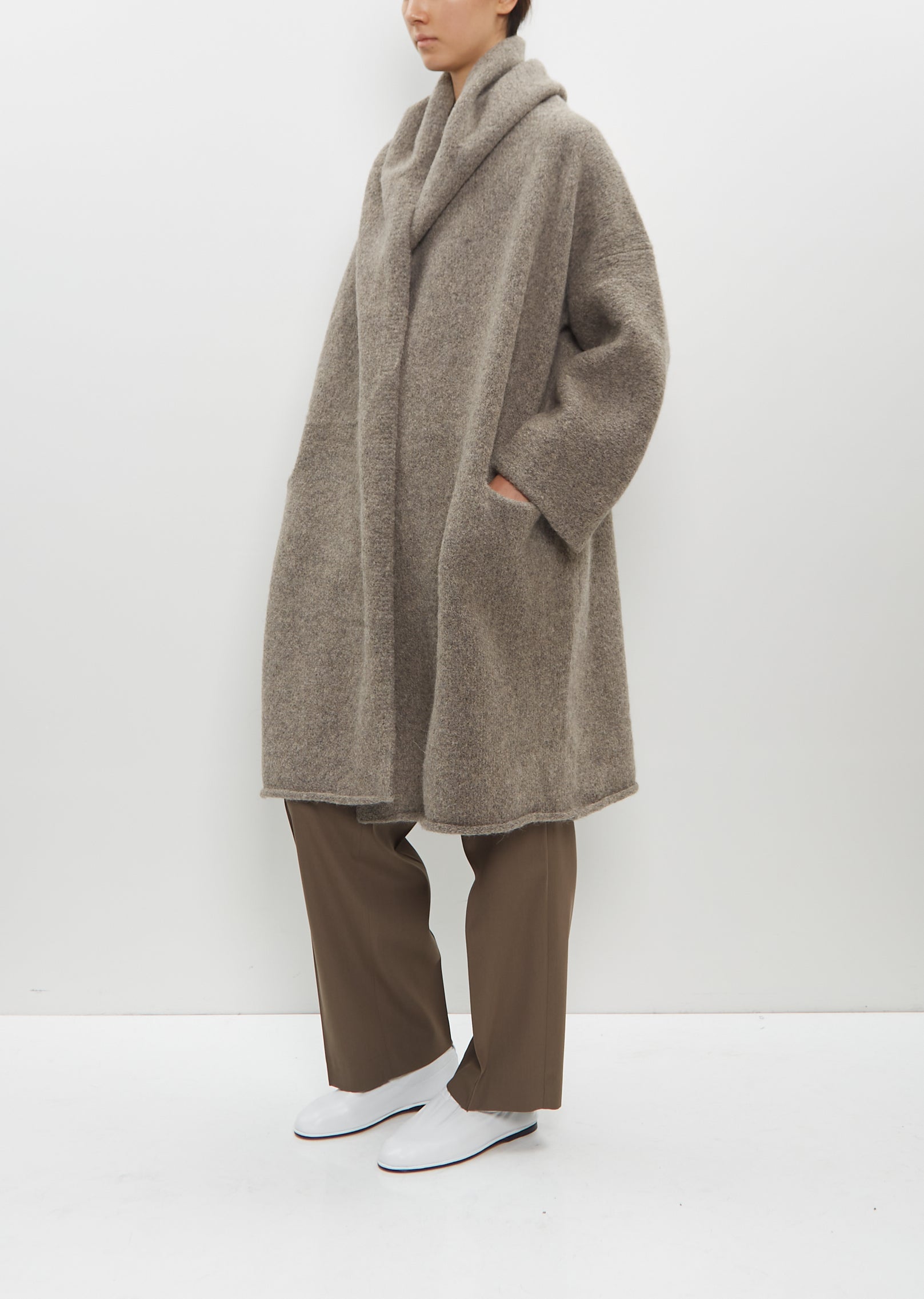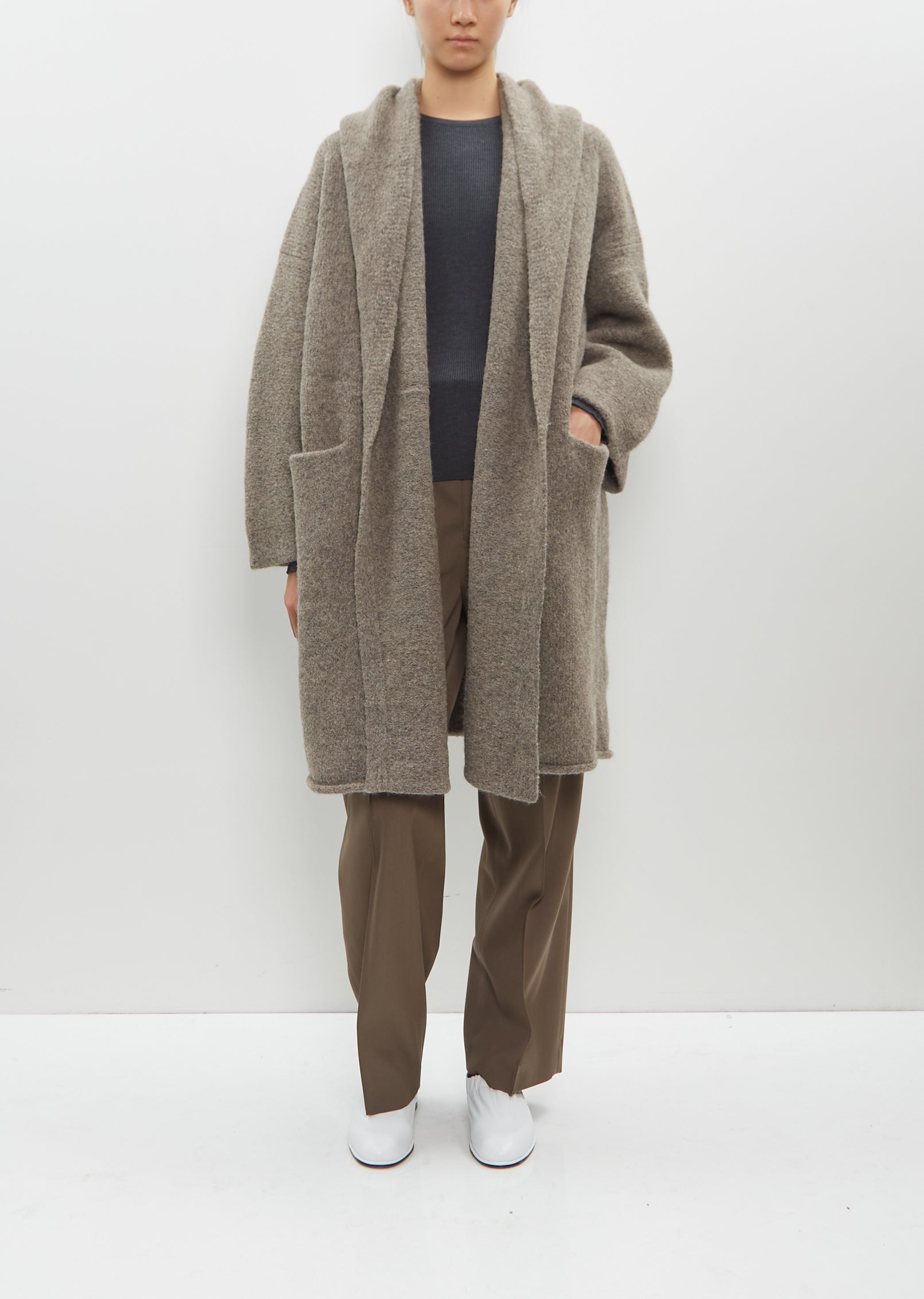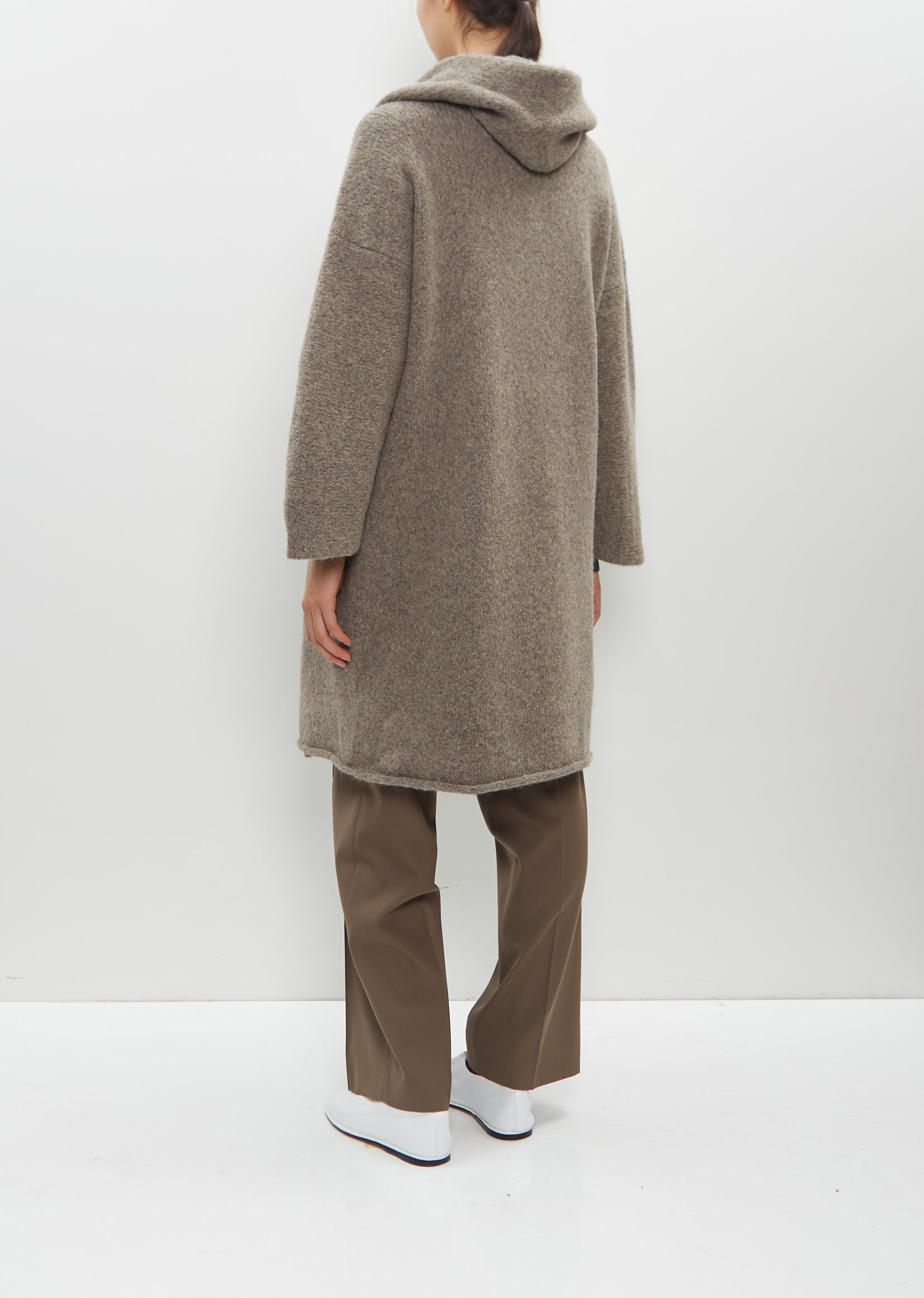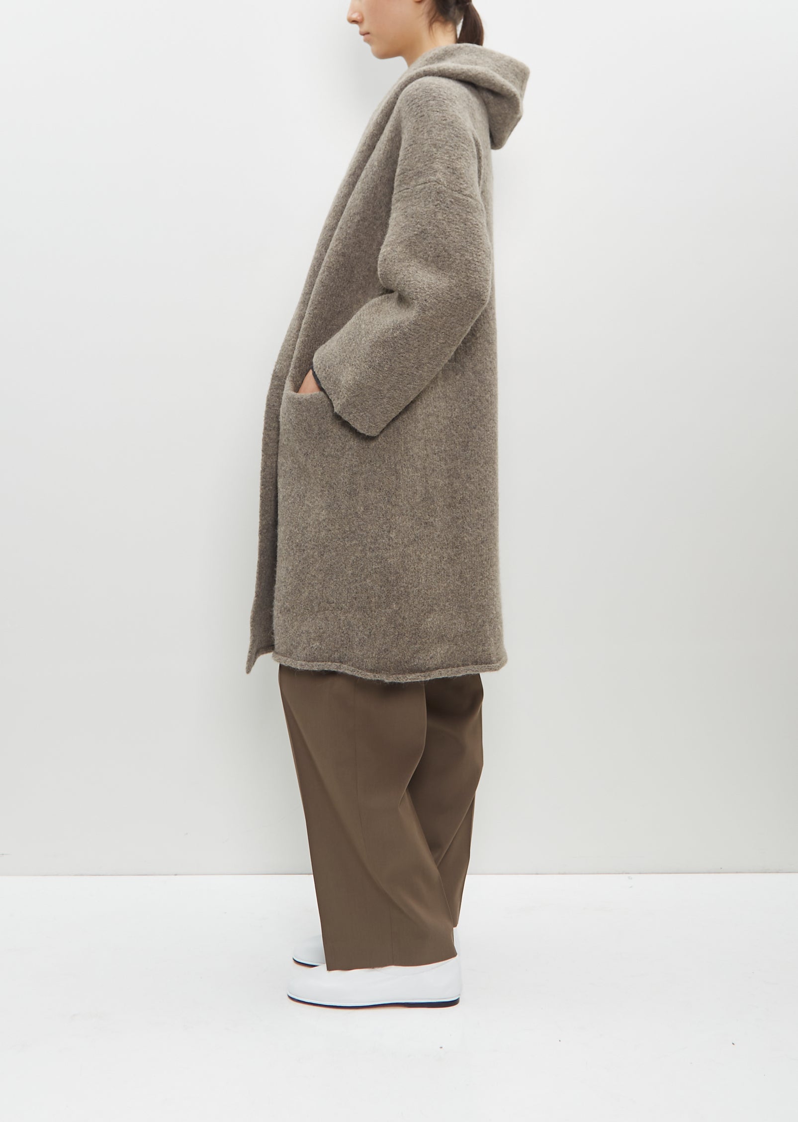 Knitted in felted mid-weight alpaca knit with slight stretch, this versatile sweater coat features a hood, dropped shoulders and self-lined front slit pockets. Finished with a rolled hemline. Subtle cocoon silhouette with an oversized fit.